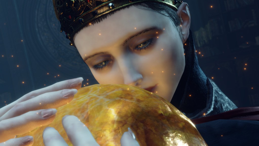 … And Lady Rennala clings to the amber egg gifted by Lord Radagon, absorbed in an impermissible art… In the repulsive secret art of Rebirth.