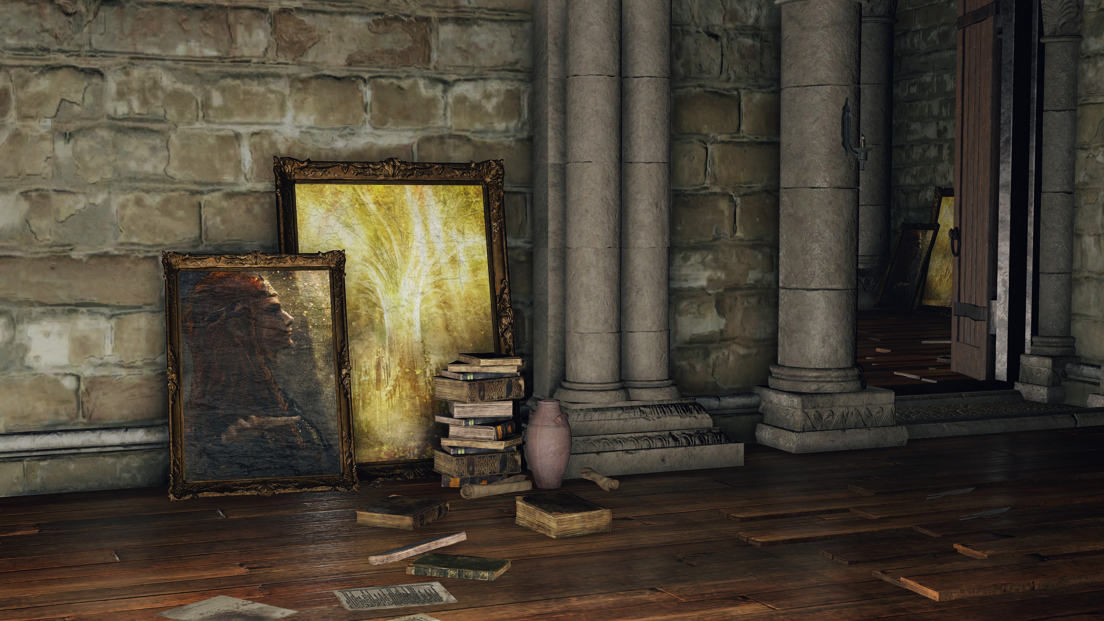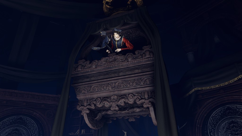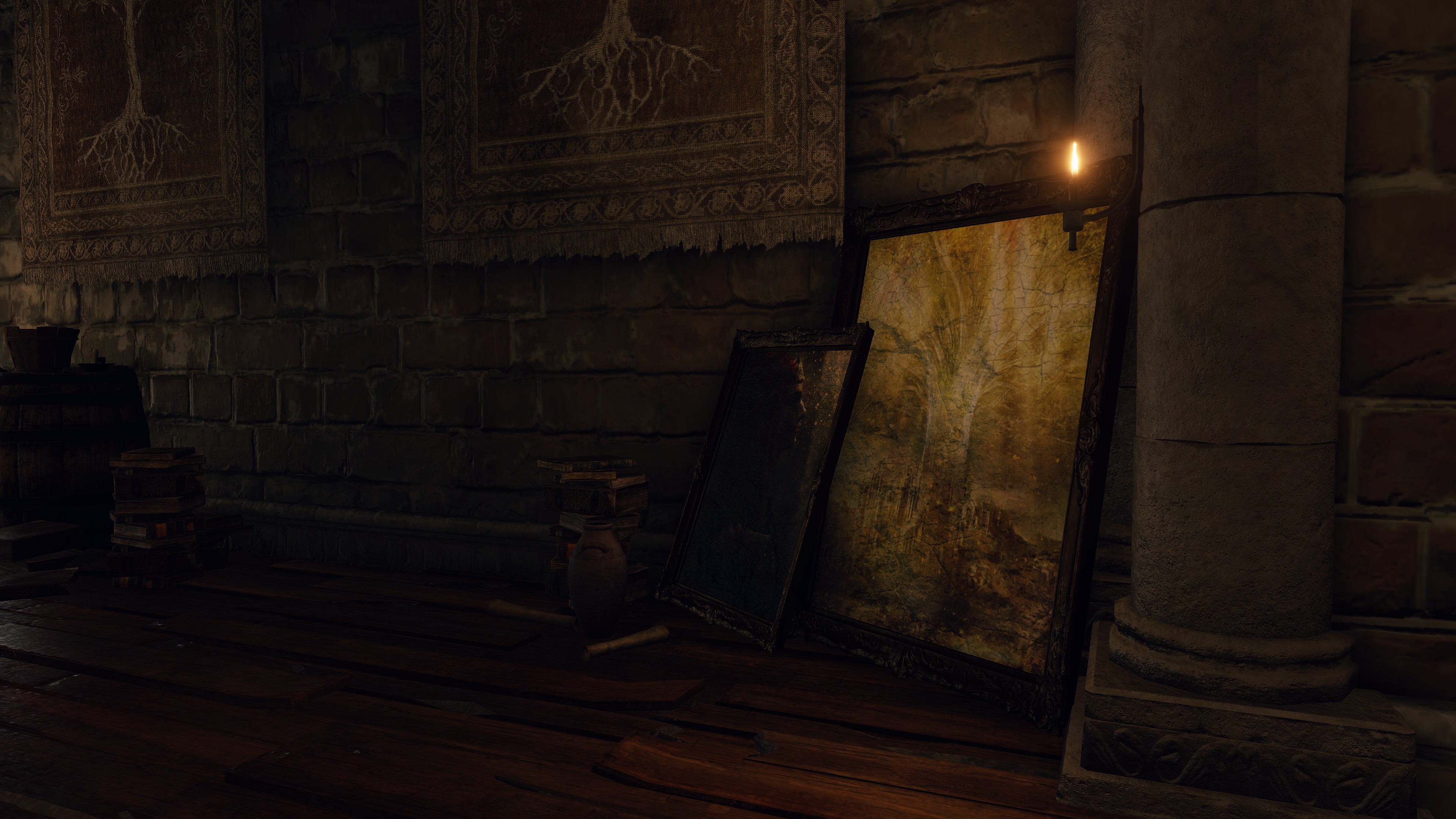 It should be noted that the two still enjoyed their own private lives. The Fortified Manor was updated to accommodate the new Elden Lord. Not only does the castle preserve several of his portraits — all side profiles of the king consort performing his iconic Golden Order Totality — an especially large portrait was hung alongside Godfrey’s likeness on the foyer balcony, opposite pictures of Marika and her precious Erdtree capital. The pair wanted to convey, at least to the public, that they lived together as husband and wife, just like was the case with Godfrey. Perhaps it was only a façade, Marika rarely if ever allowing Radagon to walk around separately behind closed doors; we do find a hero’s rune on Marika’s bed, likely the fate Radagon left behind after their first night back home before he embraced his new destiny as her Elden Lord. Either way, the two halves did continue to take holidays.