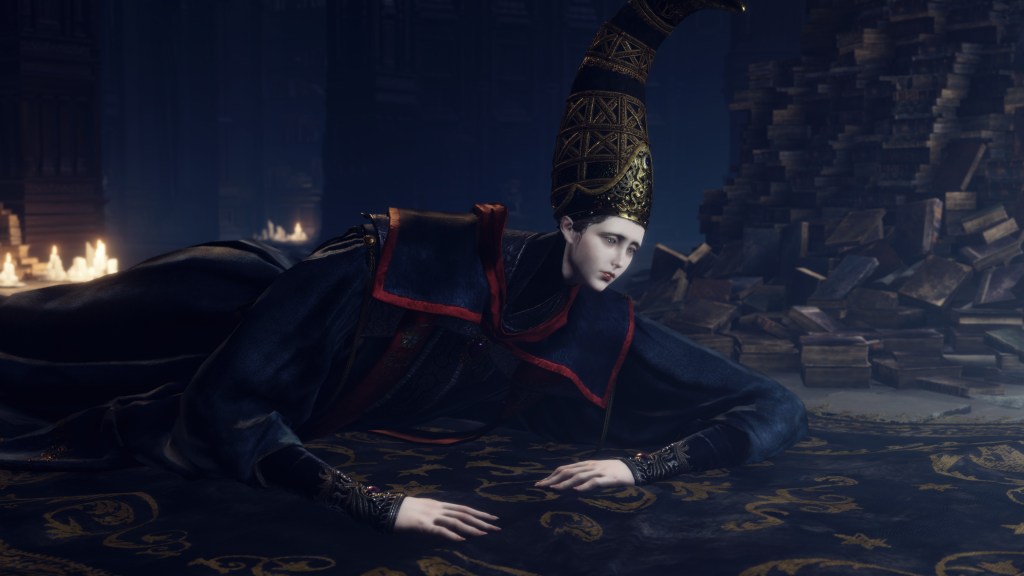 As Miriel relates, Rennala is absorbed in the art of Rebirth, using the egg as a medium to recreate life. Already, she has spawned numerous “children” from the Rune, who faithfully support their mother during the boss battle. Although adult in size, each of these “juvenile” scholars appears, sounds, and behaves youthful, like small children. The Full Moon Queen similarly treats them like infants, many crawling out of cradles hanging overhead in the Grand Library while she herself sits in another. At the same time, they are students of sorcery, Rennala coaxing them out with books and firelight on the implicit promise of teaching them the contents. That explains their dress, and together, they play house until Rennala decides they need to be born again, transforming the bodies into headstones which she callously hurls around during battle. From the children’s nursery rhyme, their souls are held in the amber egg where they “rest” until reborn from the darkness. We can see as much in the egg model used during the cutscene transition mid-boss battle, burgeoning new bodies forming inside the amber casing.