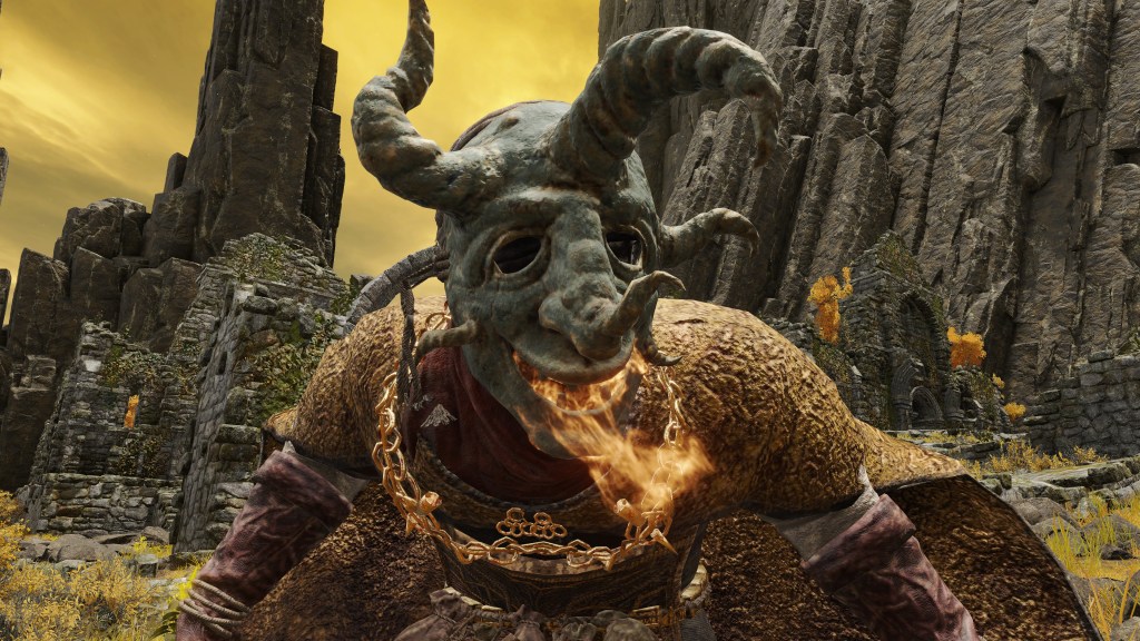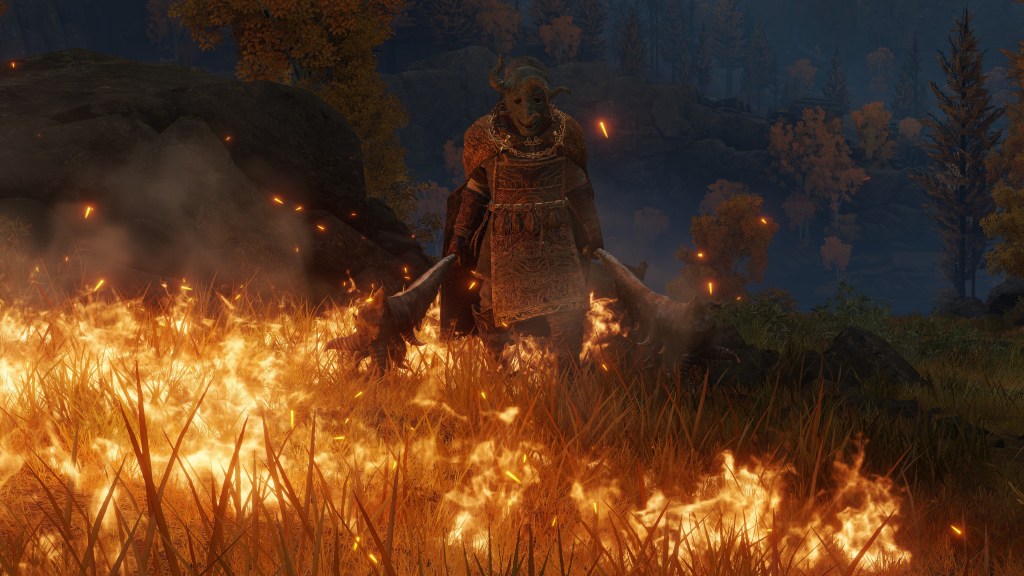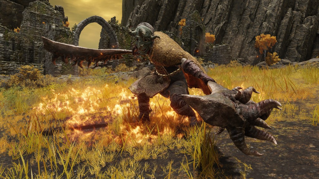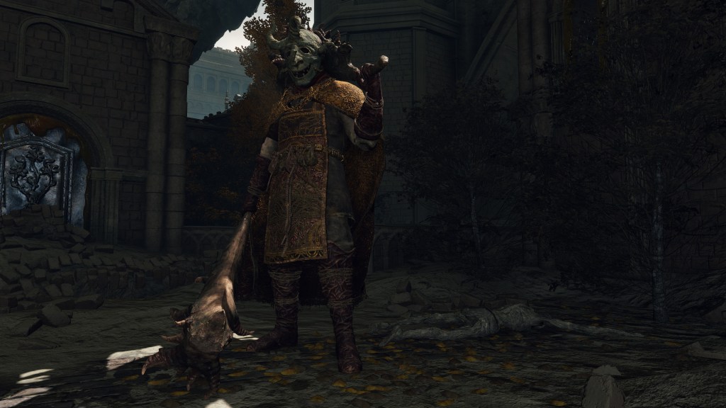 Taken in total, Rollo had probably become famous as a healer like Tricia, exploring possible remedies to Omens’ corruption. But the old perfumer apparently lost hope in ever finding a cure, concluding that the only mercy to be granted to those living corrupted lives was a shorter life. And when it came to death, Omen didn’t need a soothing hand to ease their pretty little heads but an iron fist to smash those skulls in. Omenkillers, for that reason, practice swordplay instead of perfuming, the closest thing being their inexplicable ability to breathe fire through their mask and face wrappings. However, the term for “killer” (潰し) evokes connotations of slaughtering livestock, so it is only fitting that these butchers still wear an apron — though, naturally, they don’t let corrupted blood stain an image of the Erdtree, with the more abstract design. The mask of the evil spirits which haunt Omens’ dreams are an obvious tool of intimidation, appropriately boosting their strength with which they then flatten the cowering horn-men. In general, Rollo set the brutal standard for the extermination of Omen.