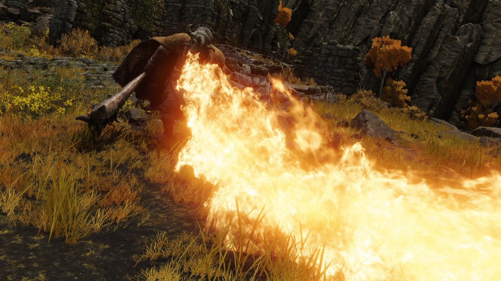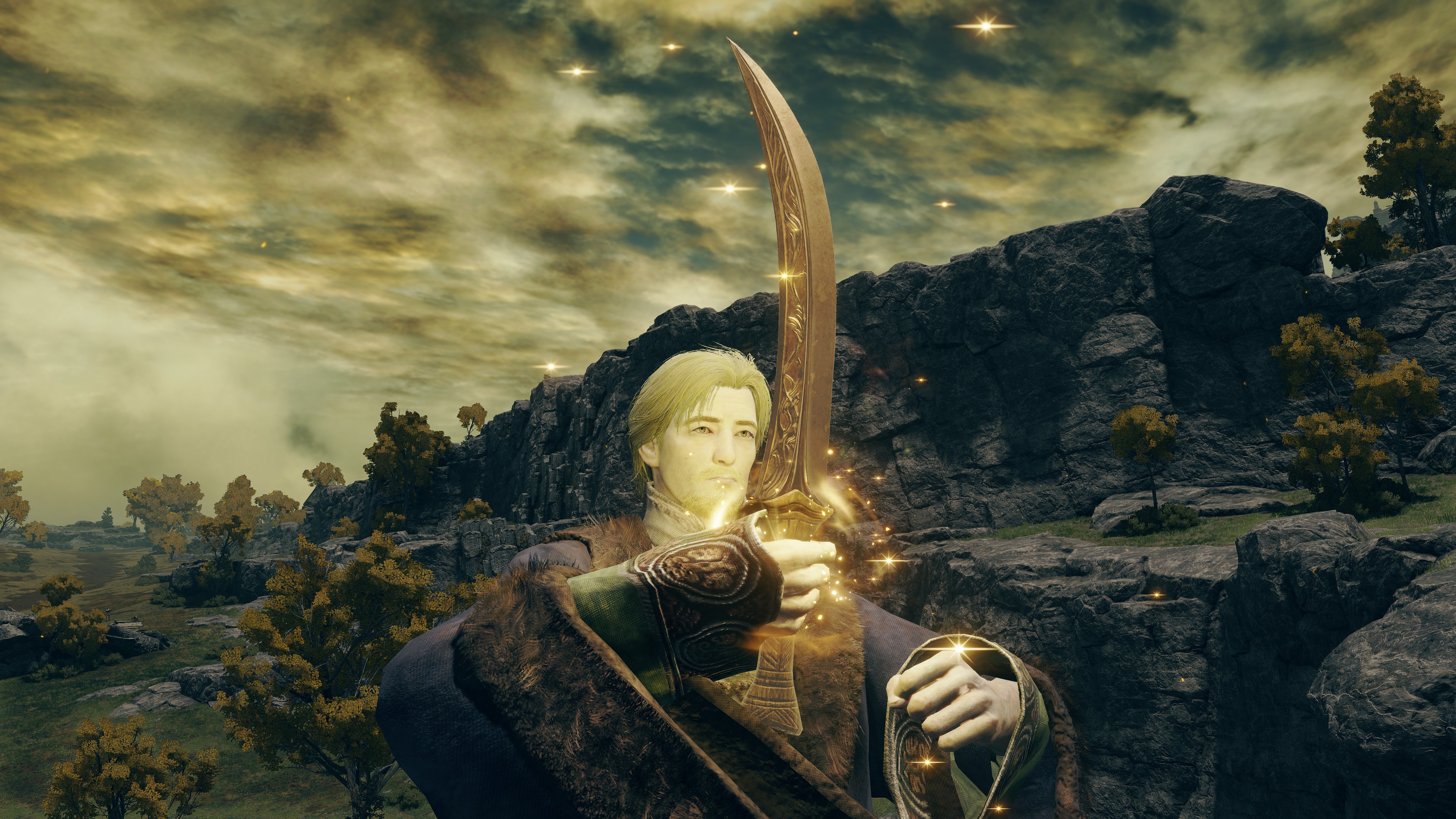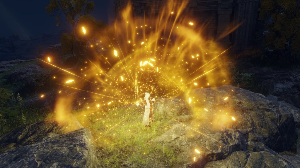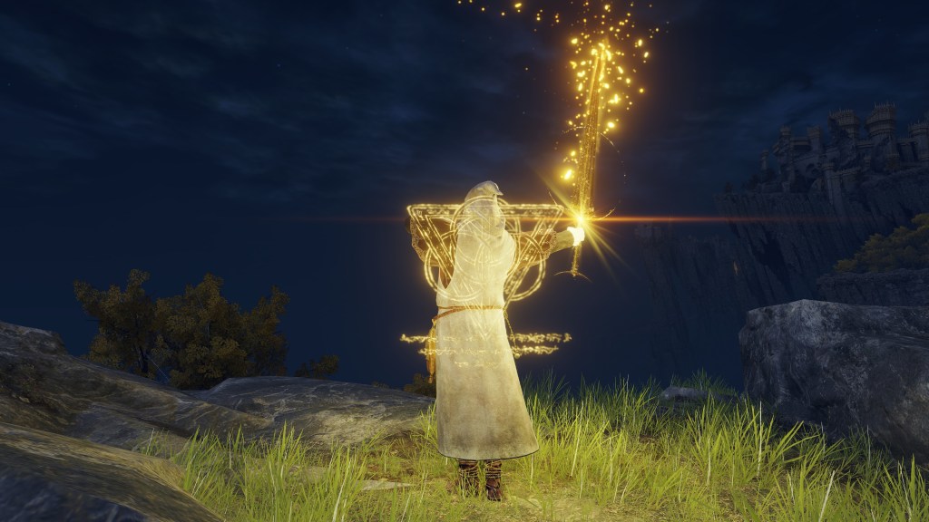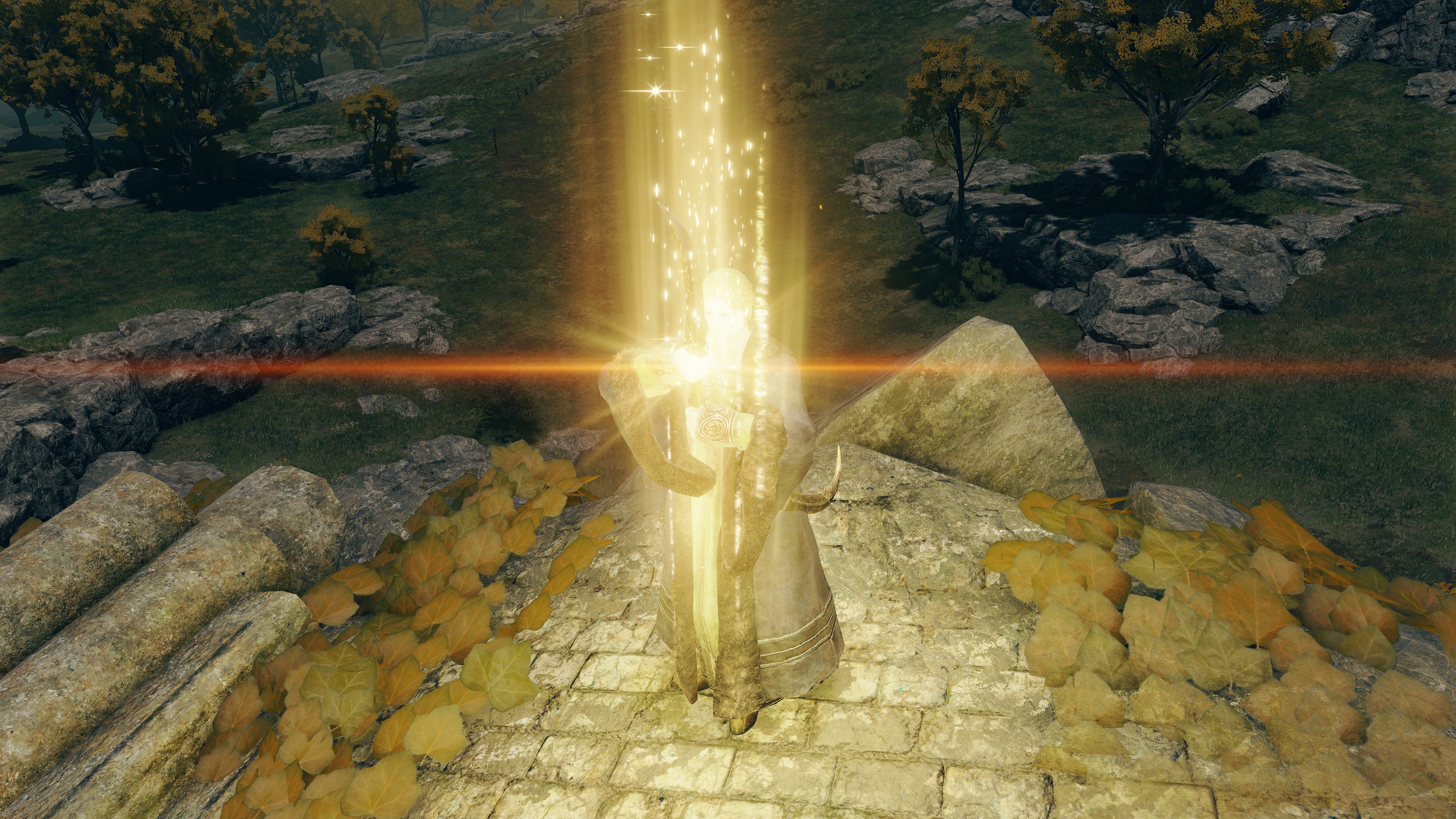 Put simply, Dragonbolt Blessing is probably not the work of Lansseax or Fortissax but Radagon following his second marriage. The Elden Lord came to this historic hill to study the fulgurblooms calling lightning down with no harm to the plants. Inspired by this and the example of his new son-in-law, the king created an advanced incantation mimicking the lightning flowers’ abilities, which was passed onto Lansseax to pass along to her favorite followers. Although the art itself was relatively meager, the Stormcaller Church commemorated his achievement on the road to discovering Fundamentalism with a statue after popularizing the sect, and any possible further inquiries led to his mastery of incantations. The reason behind his choice of subject is easy to imagine. As embodied by the gravelstone amongst the golden flowers, Radagon was there to comprehend the connection between the primordial rock beasts and the gold they manifest as lightning. Now that dragons were the Erdtree’s friend, what easier aspect of Order to explore which his other half hadn’t yet?
