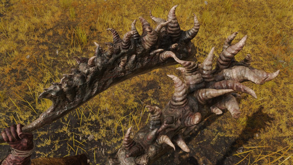 Grotesque great machete closely lining curved horns cut off from omen children along its blade. Choice weapon of slaughter that Omenkillers wield.