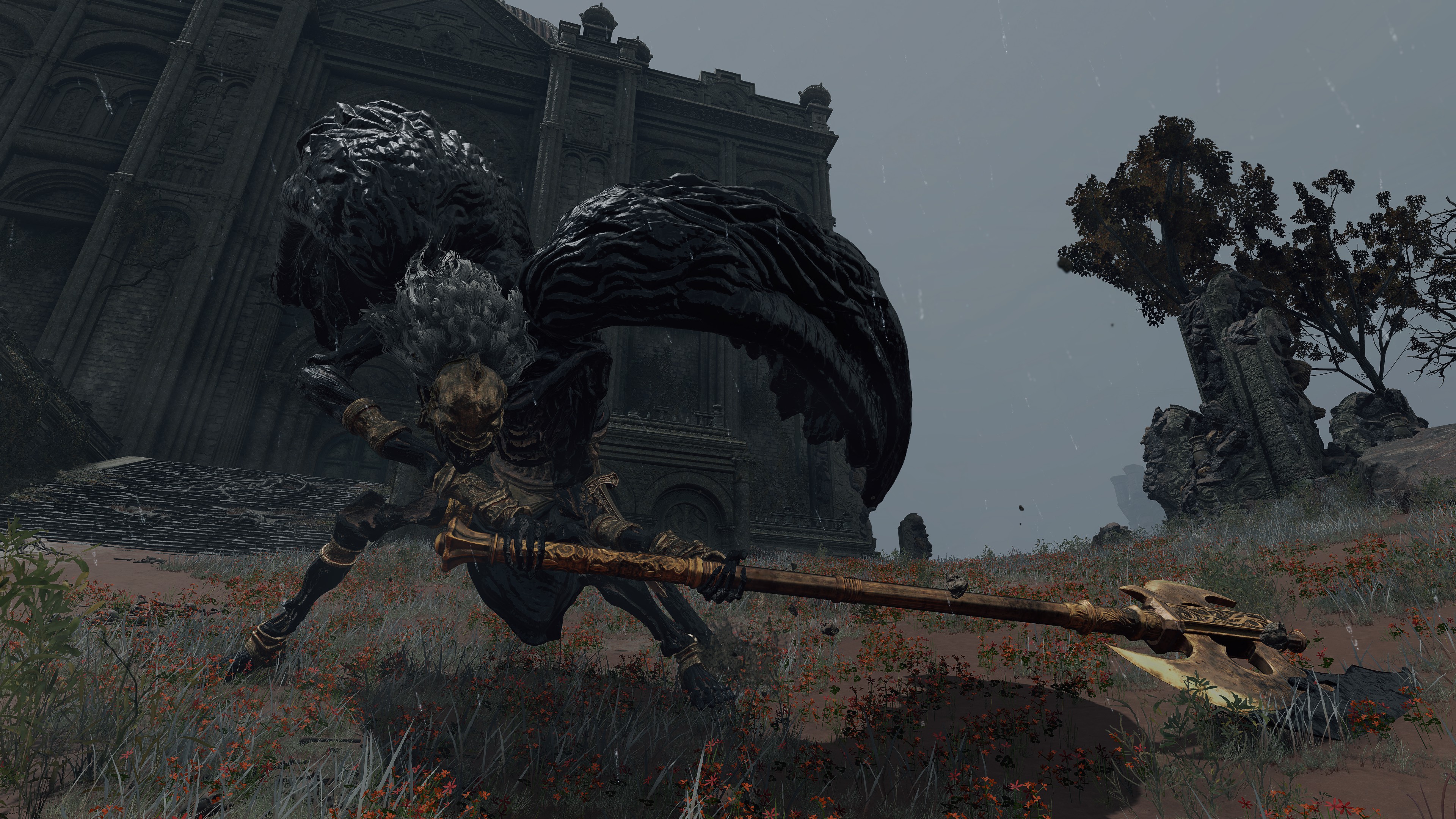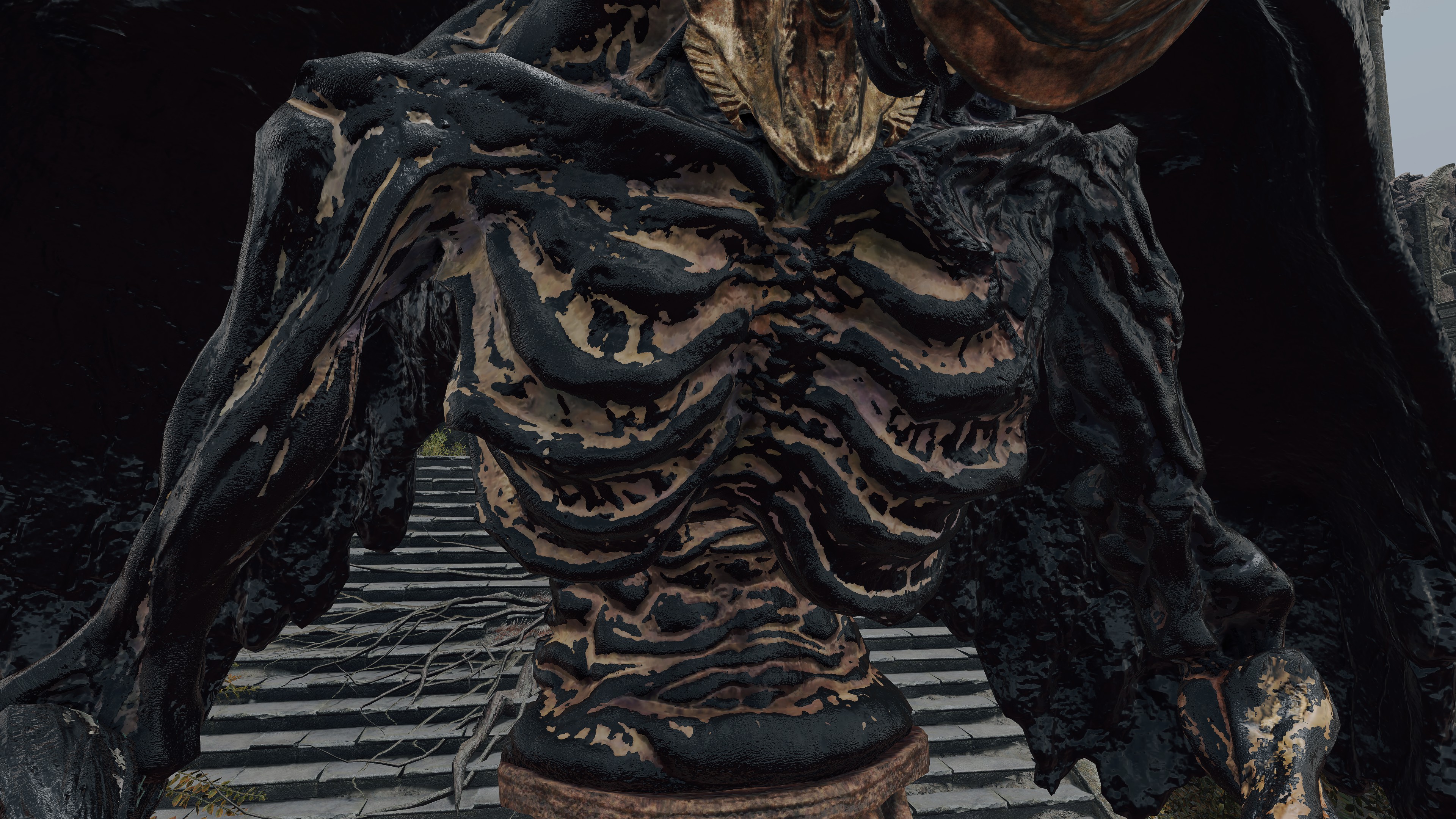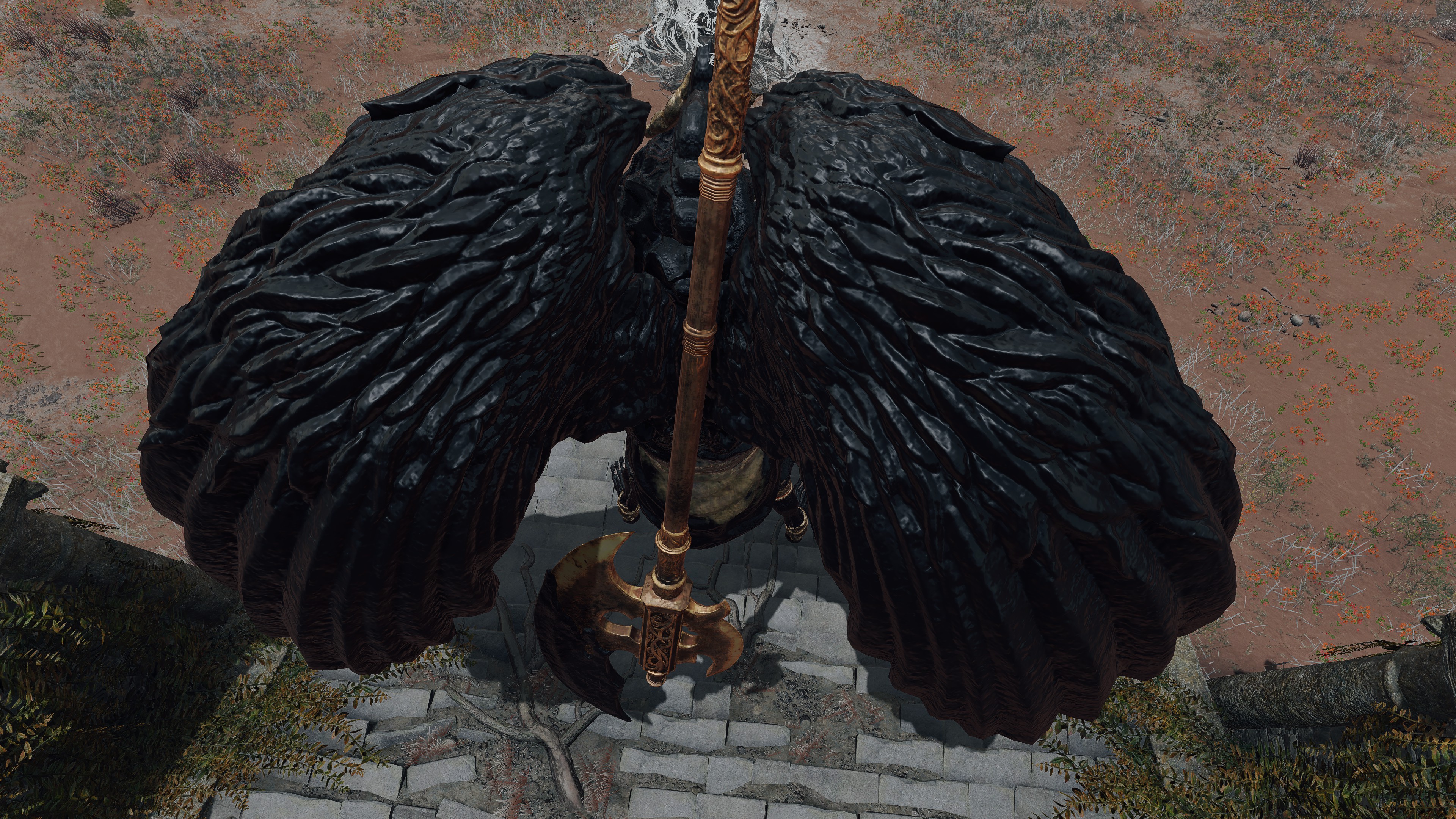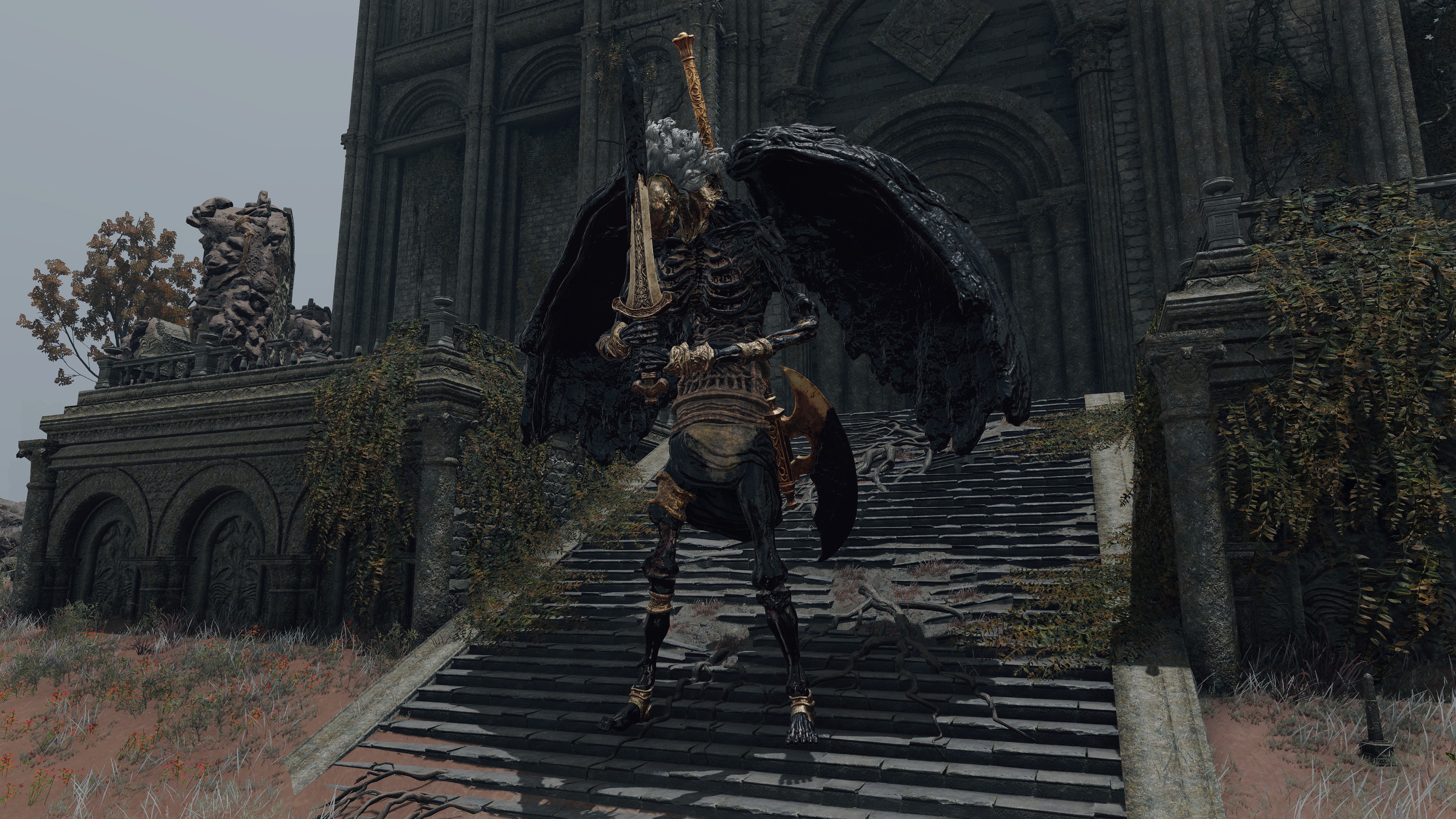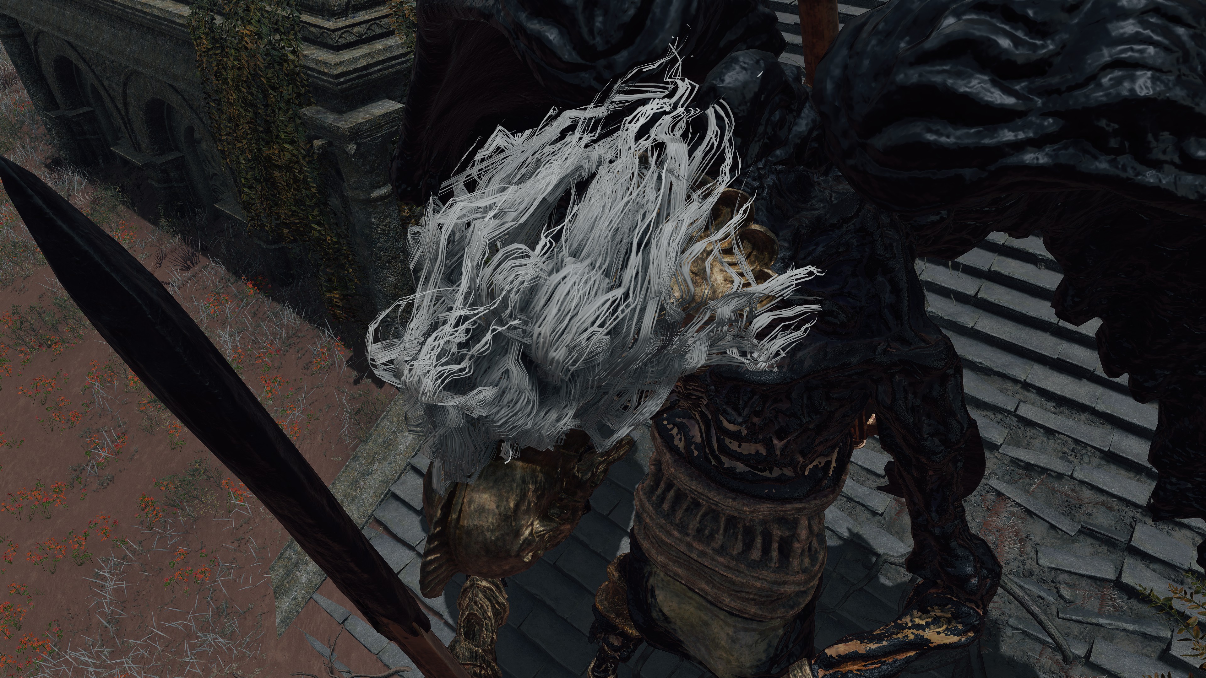 Put simply, the bodies in the Hero’s Grave were exhumed and used for Frankenstein experiments. The “patchwork” state of the byproducts brings Radagon’s penchant for mending to mind, but the number in service to Maliketh associates the gargoyles just as much with Marika. In fact, those were most likely made with her brother’s cooperation. Unlike the standard hero, Maliketh’s servants have the power of Destined Death infused into their corpse wax, turning it and thereby their bodies black; it also seems to grey their blonde hair in perfect reflection of their master. As a result, the gargoyles can unleash that “holy” power from the wax, which consumes the air for their Vacuum Slices and powerful spin attacks — even their focused roars are affected. This is what makes them the Black Blade’s “kindred” and thus fitting entourage. Yet, Maliketh was expected to keep the Rune of Death’s power sealed unless Marika were to direct him otherwise, which implies that she requested he contribute the power to certain gargoyles’ creation. Therefore, we can infer that both halves of the one god were involved in this project.