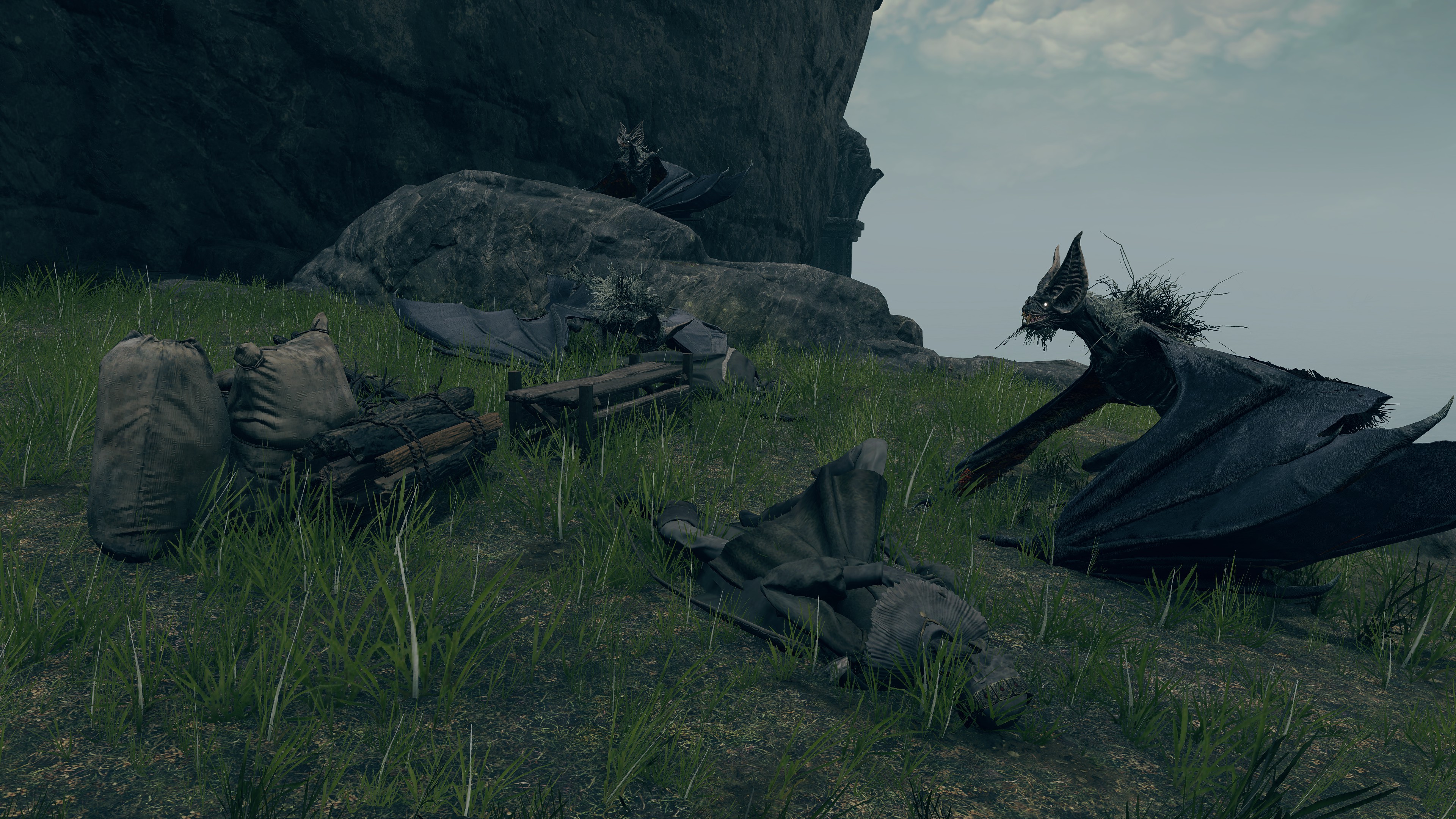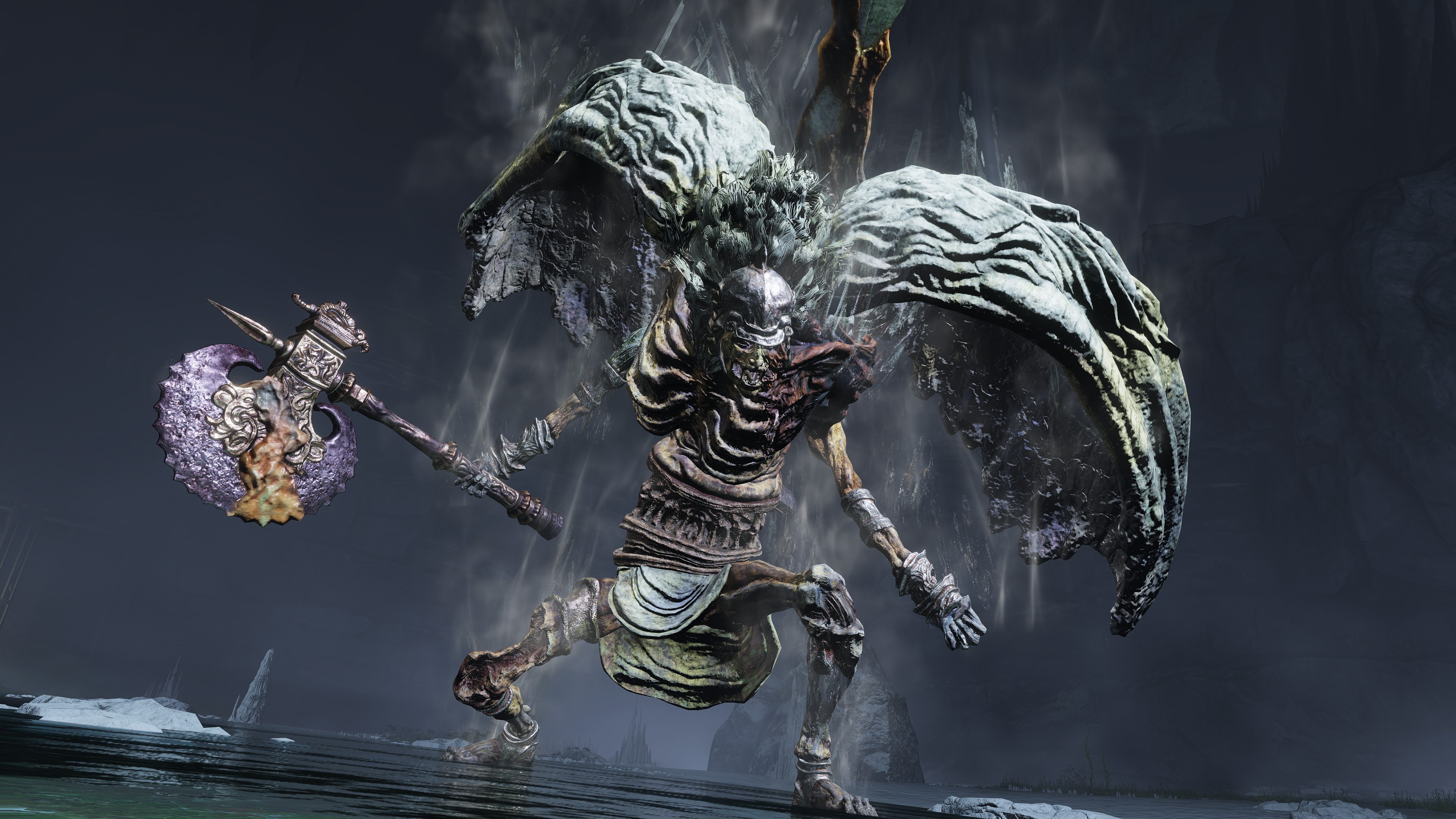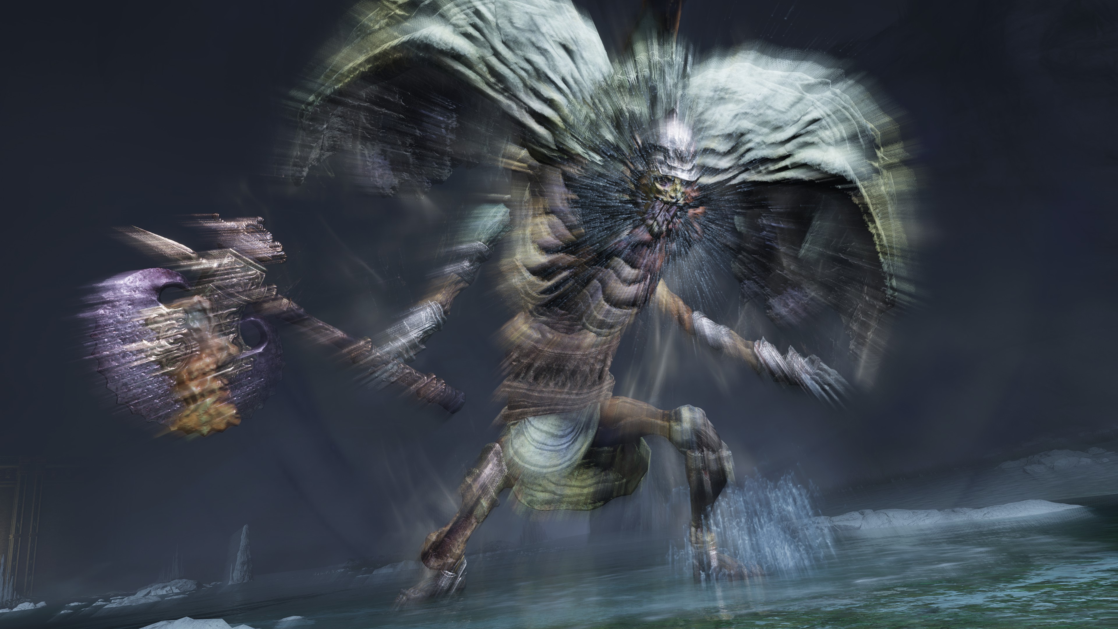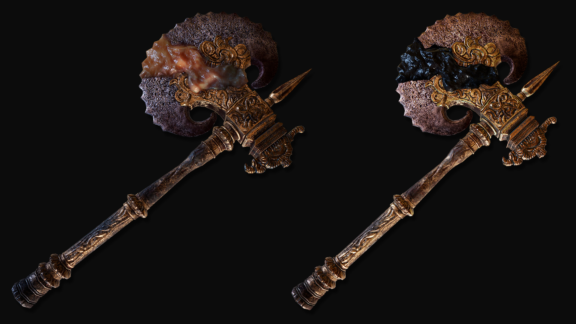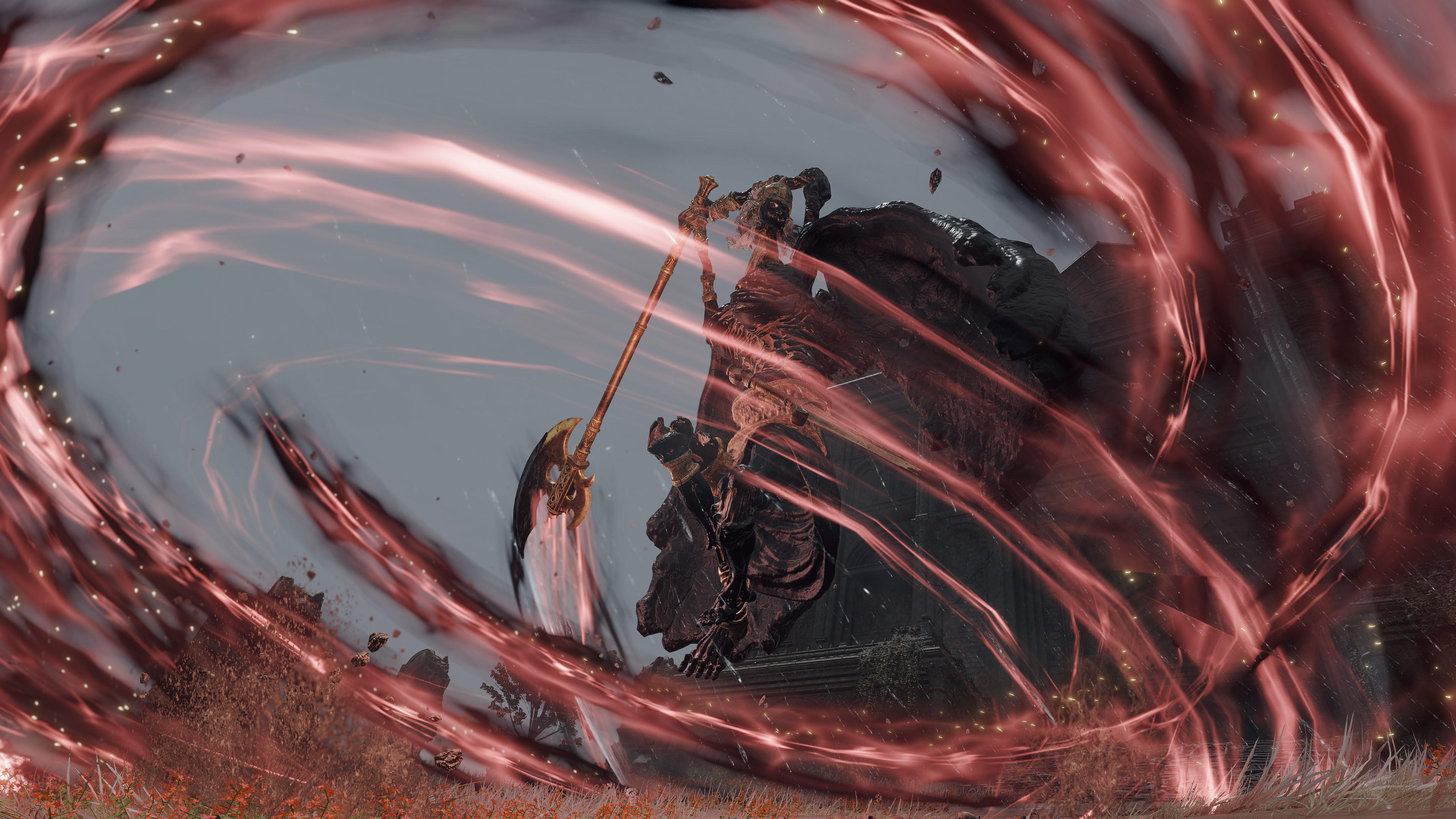 Put simply, the bodies in the Hero’s Grave were exhumed and used for Frankenstein experiments. The “patchwork” state of the byproducts brings Radagon’s penchant for mending to mind, but the number in service to Maliketh associates the gargoyles just as much with Marika. In fact, those were most likely made with her brother’s cooperation. Unlike the standard hero, Maliketh’s servants have the power of Destined Death infused into their corpse wax, turning it and thereby their bodies black; it also seems to grey their blonde hair in perfect reflection of their master. As a result, the gargoyles can unleash that “holy” power from the wax, which consumes the air for their Vacuum Slices and powerful spin attacks — even their focused roars are affected. This is what makes them the Black Blade’s “kindred” and thus fitting entourage. Yet, Maliketh was expected to keep the Rune of Death’s power sealed unless Marika were to direct him otherwise, which implies that she requested he contribute the power to certain gargoyles’ creation. Therefore, we can infer that both halves of the one god were involved in this project.