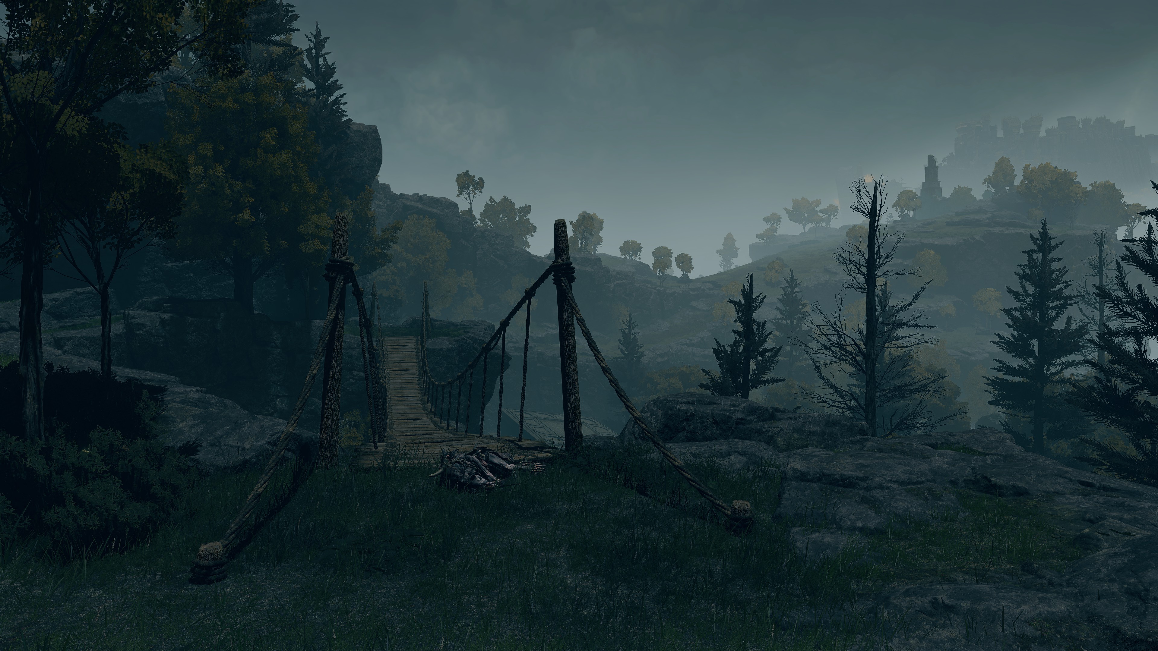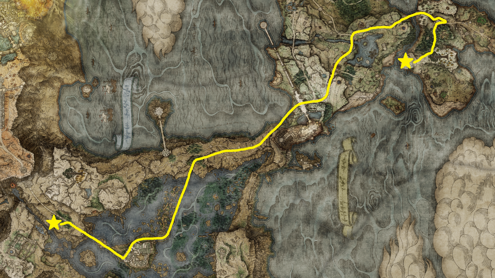 Why would Altus types be gathering at this specific church of Radagon, prompting all the added pizzazz? To start on an important journey, of course. The last to enshrine Radagon’s icon is the Church of Pilgrimage commemorating the hero “saving” his future wife down on the Weeping Peninsula. To reach this one, pilgrims must take dirt roads off the highway. This isn’t a surprise, given that the church is farther removed from the main road. The terrain is also rockier, even requiring a rope bridge to cross the valley situating Morne Tunnel. The royal government wasn’t going to engineer more reliable infrastructure for travelers in the farthest reaches of the frontier. Still, golden centipedes inside betray how the Church of Pilgrimage also welcomed fundamentalists. But why a pilgrimage to this particular church, and from where? Factored in with the Bellum Church, the answers are obvious: Fundamentalists, with their fetishes, follow their founder’s journey from hero to king. They set off from the Bellum Church, then travel along the highway before taking the backroads in the remote countryside to their final destination.