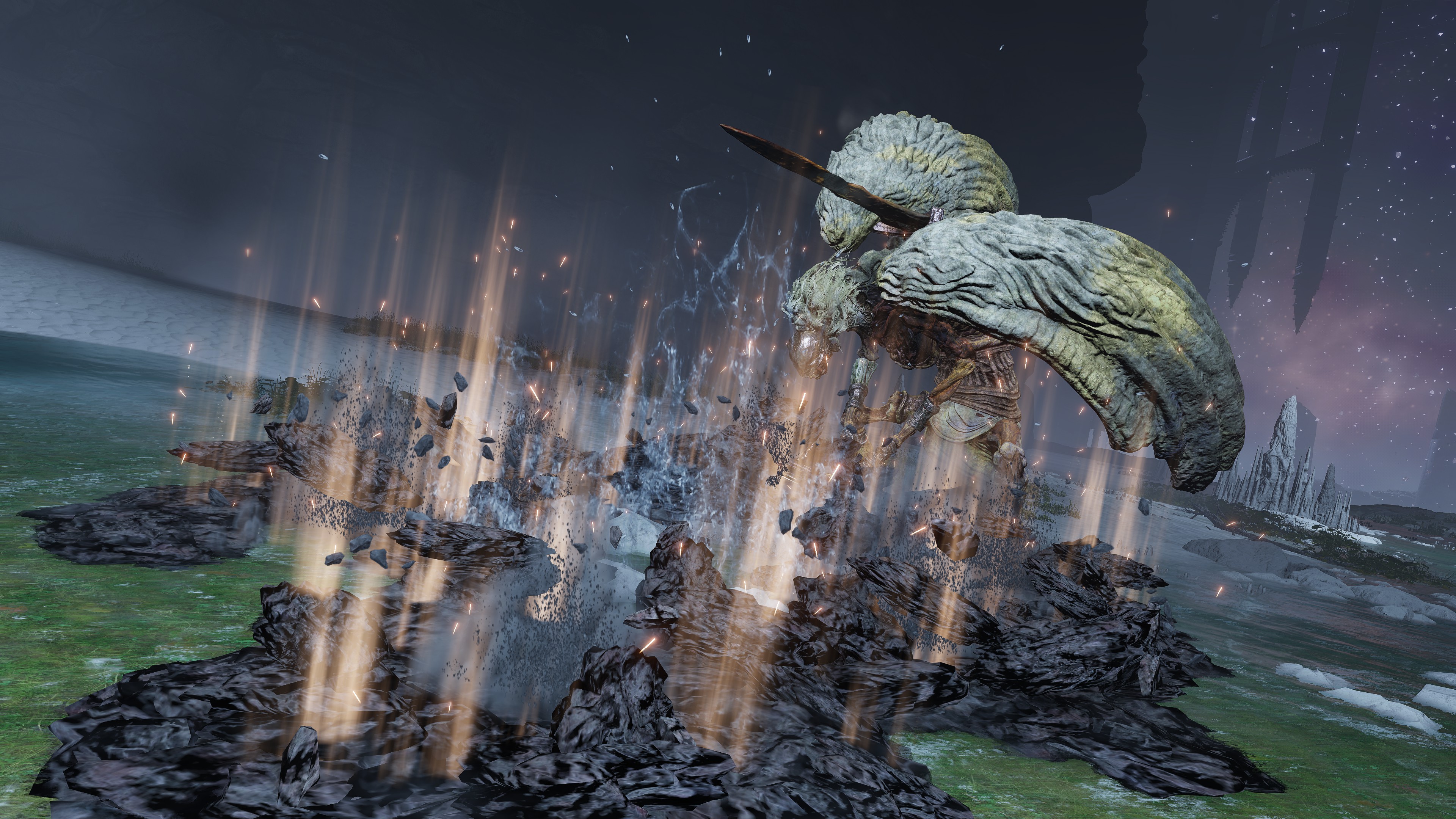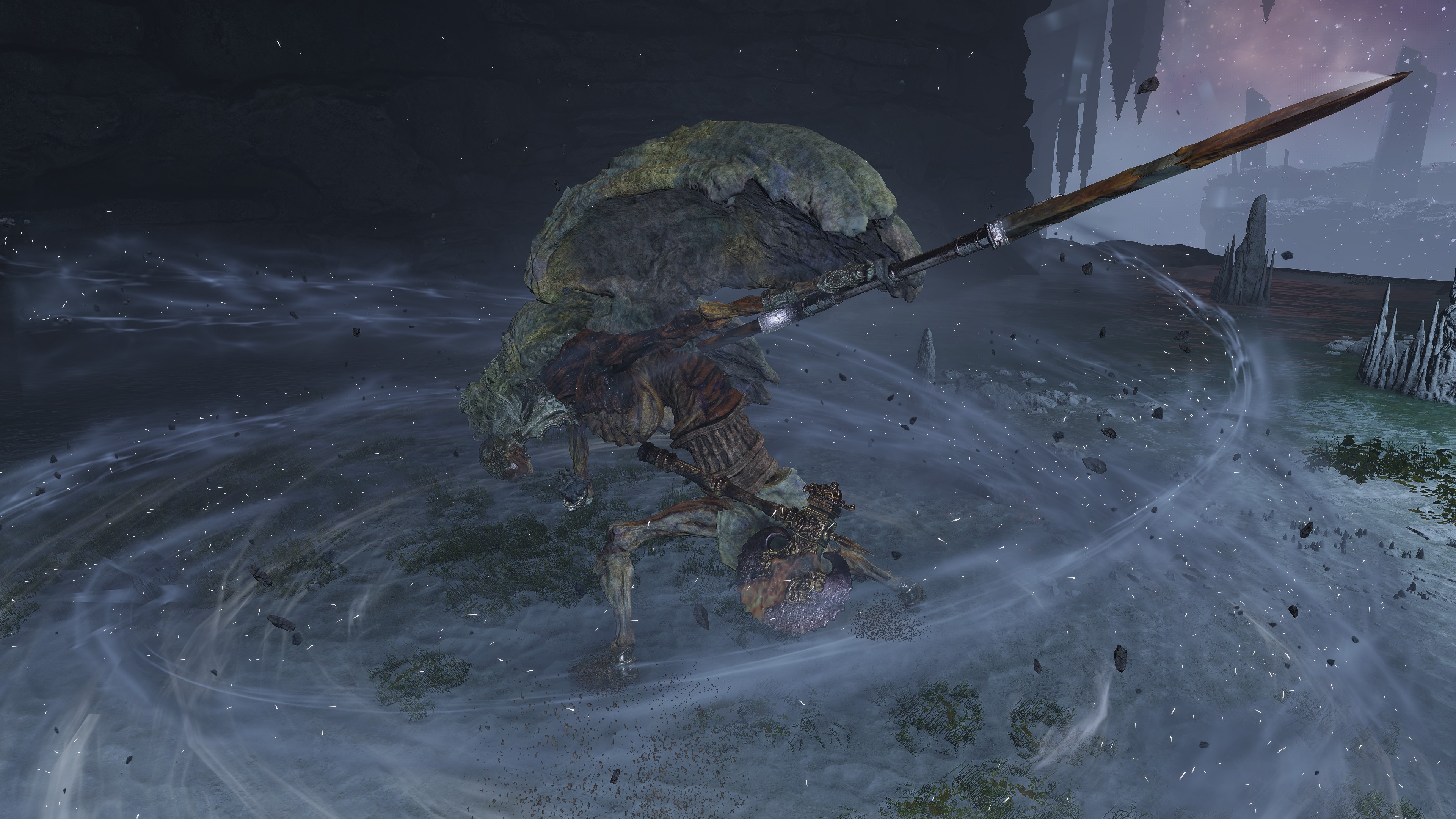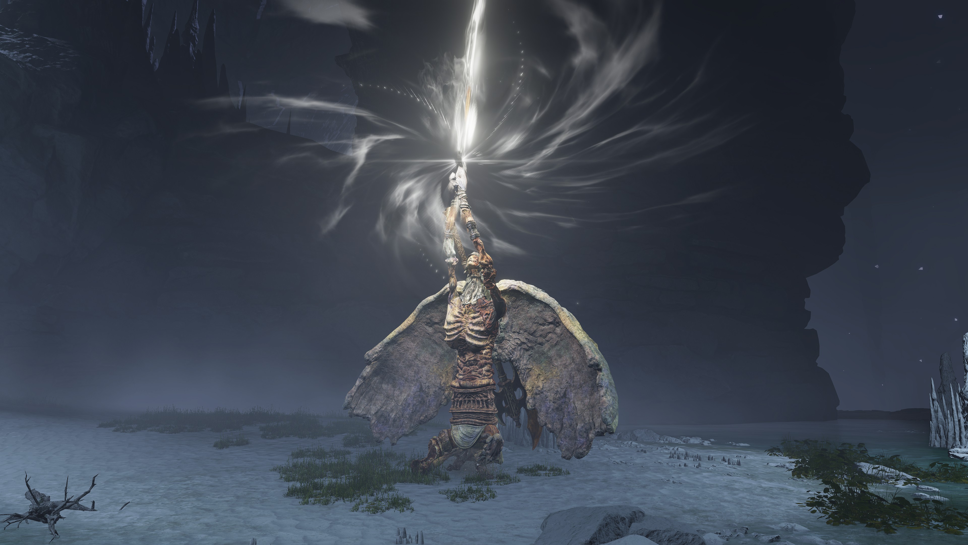 The Elden Lord apparently learned much from the cult, since he has incorporated some of the dragons’ concepts into his fighting style. Although utilizing holy power instead of lightning, Marika’s other half still conjures one large spear to hurl at enemies while in midair, alternating with five smaller spears thrown. Even if the latter is not too similar to Knight’s Lightning Spear, there is also his ability to teleport short distances, which brings to mind the Blinkbolt skills of Godwyn’s guard. Admittedly, some aspects of these attacks resemble glintstone sorcery, the fan of spears and warping comparable to Crystal Burst or Miriam’s Vanishing. But such inexact parallels are to be expected. Just as Radagon’s Icon increases the speed with which we cast sorceries or incantations, Radagon himself quickly learned how to use the respective arts for his ends. He previously completed his studies into sorcery with Rennala, and now he pursued mastery of the school of faith with Marika. The end goal was always to blend both into one perfect art reflective of a perfect Order.