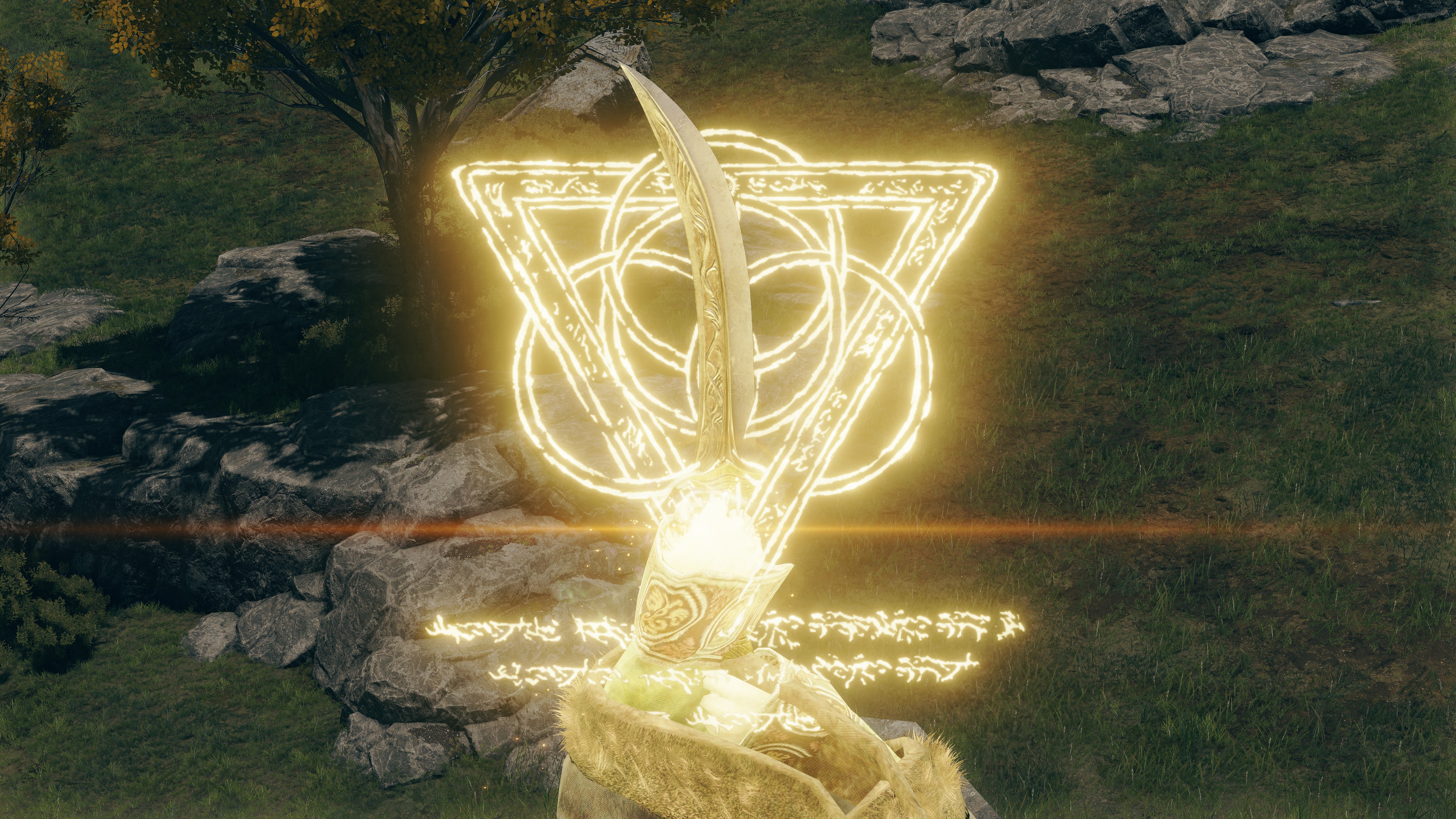 Combining that lightning inquiry with his Carian studies and Marika’s own research, the incomplete man mastered the arts of both faith and reason, then applied the principles to formulate new spells for Golden Order Fundamentalism. The foundation was laid with the Laws of Causality and Regression. One incantation conjures a ring of causality which responds to attacks upon the caster’s body it encircles to showcase the gravitation between meanings; the other dispels every negative ailment or positive special effect to showcase the gravitation of meaning. All things in Creation have a core identity defining them from each other, yet all disparate concepts possess a relation causing all things to interact — these were the key fundamentals to Radagon’s theology. With these as the roots, the ideological tree could branch off in any which direction. A prime example is Immutable Shield, which increases the performance of shields with light from the Law of Regression. There are no end to the applications of Fundamentalism for those with the dedication to study.