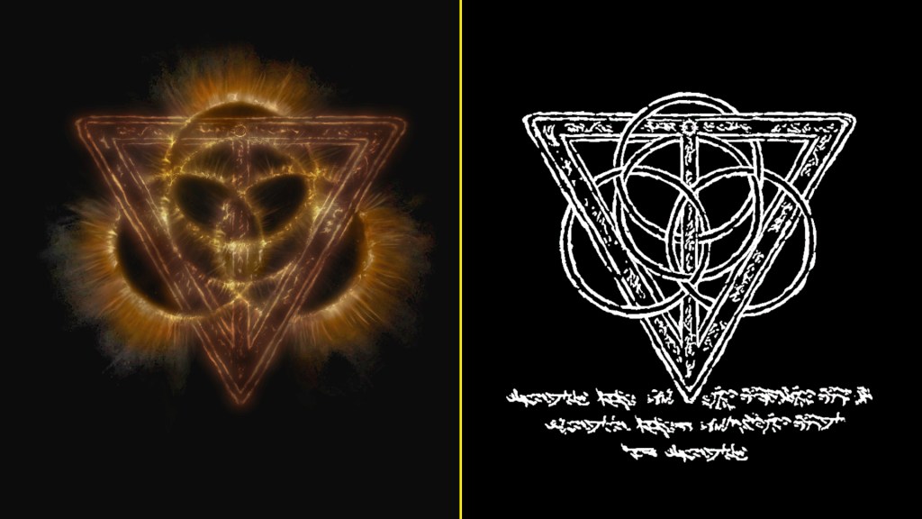 In short, to be an agent of Marika meant discarding any influence from Godfrey and embracing Radagon. To that end, Miriel reveals how a famous sculptor of Leyndell was summoned to make the great statue of Radagon erected in the residential block for every priest to see heading to and from the cathedral each day. Backdropped by his Elden Rune, the Lord stands in stark contrast to Marika — whereas she stretches out her arms with a slight lurch, he extends them straight out whilst perfectly upright. This pose of a perfect cross is the image of Order in totality, clearly evoking the triangular frame of the Fundamentalism sigil. Based on gestures, the right and left arms represents Inner and Outer Order — rules within yourself and the world around you, like Causality and Regression. It is no surprise that it became counterpart to Marika’s statue in churches. In fact, given their similar style, the artisan may well have been responsible for sculpting those prior statues of the queen, hence the renown. Now that her other half became king, it was only appropriate to call the sculptor back to recapture “her” image.
