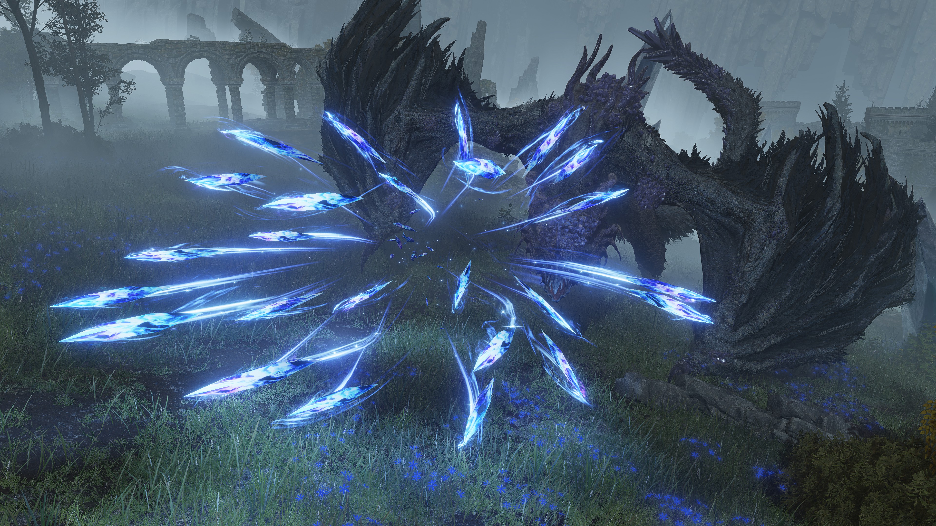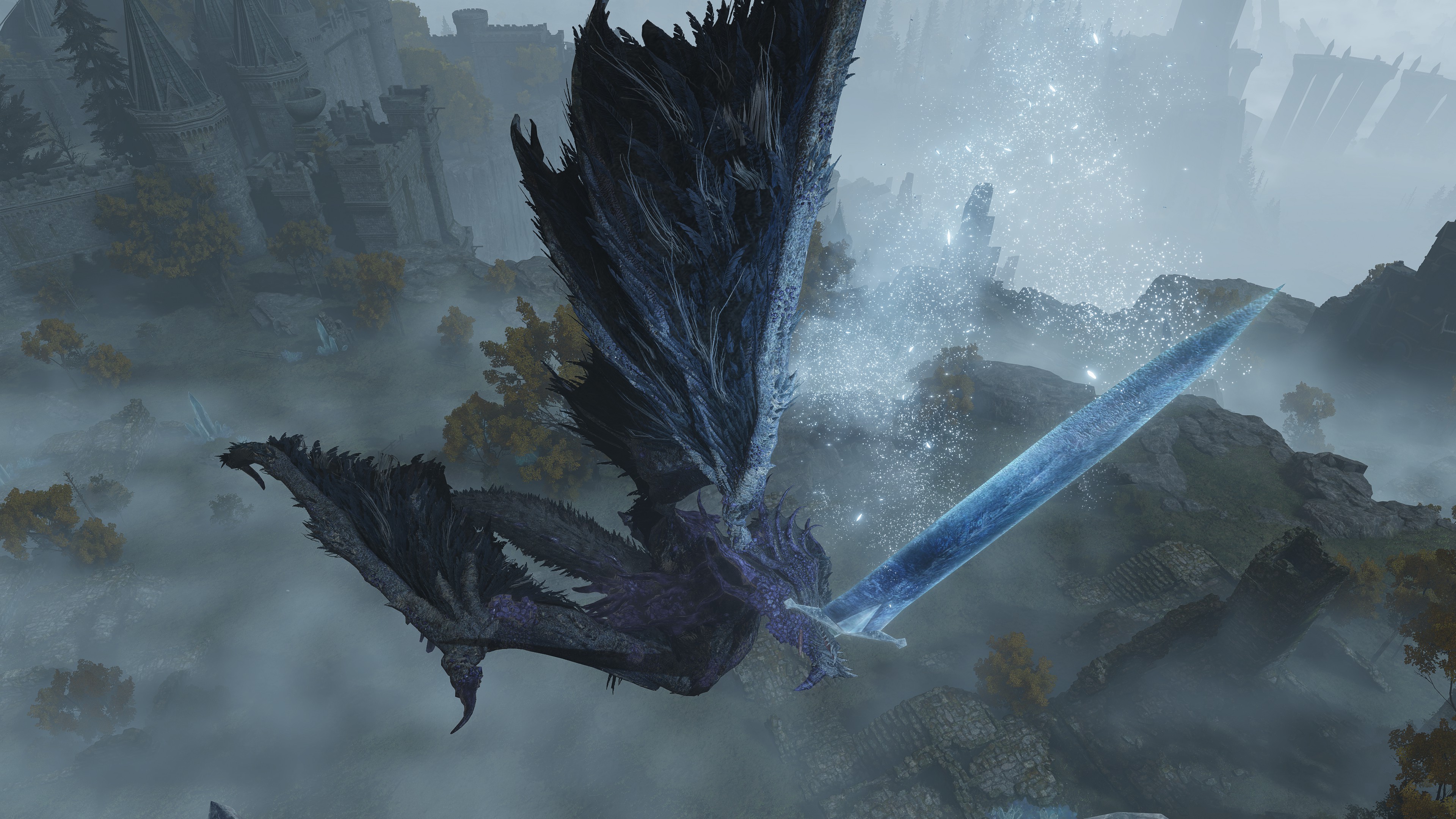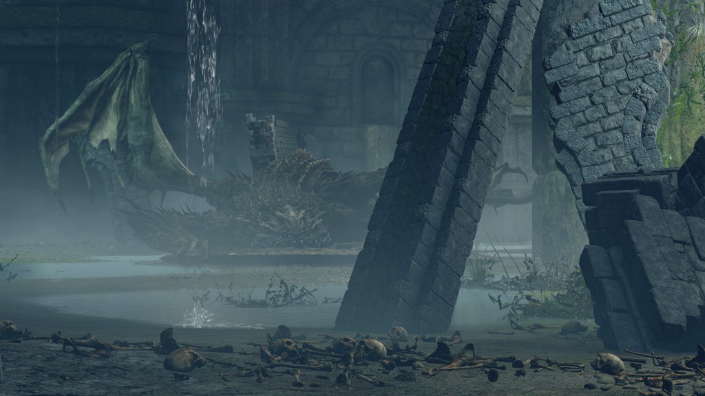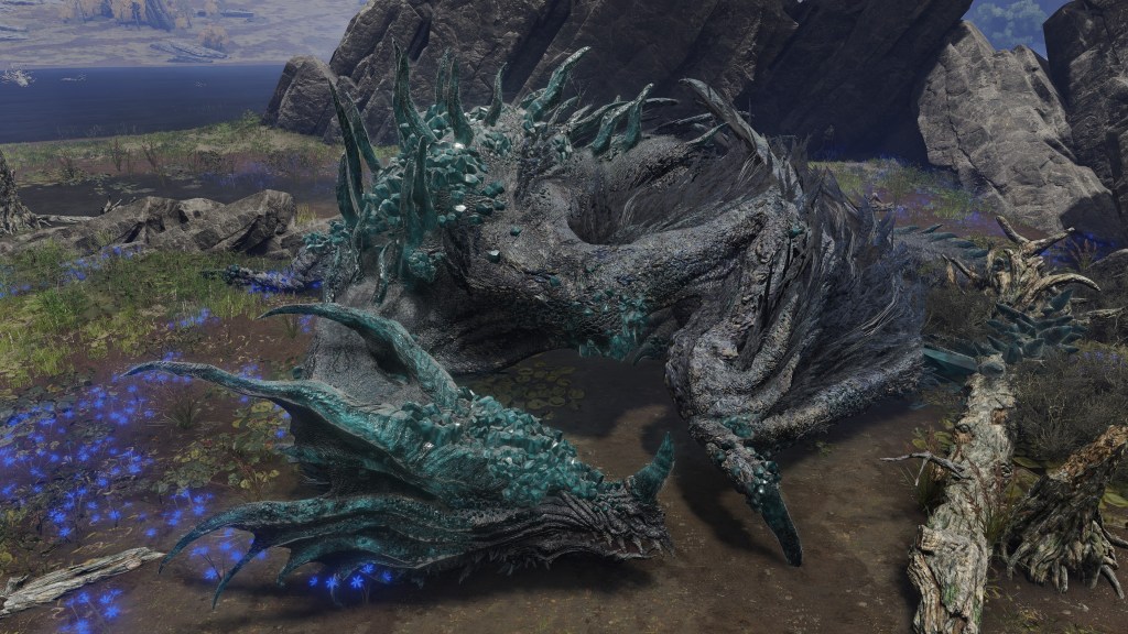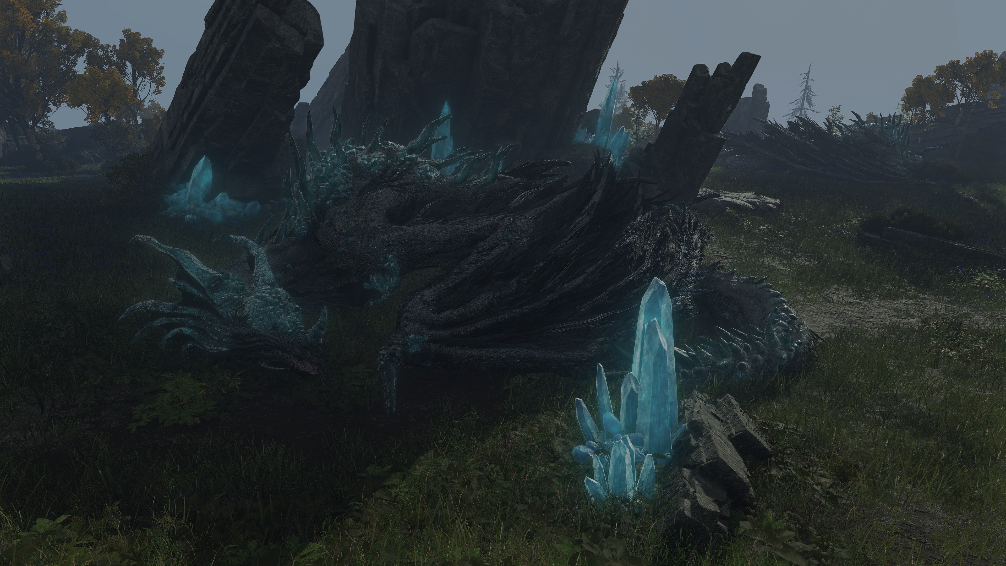 The wyvern was apparently defeated when trying to devour the witch and, respecting her strength, swore allegiance — befitting the name’s reference to adularia, the most common kind of moonstone. As a result, Adula received some of that strength in the form of the Darkmoon sorcery blade in those jaws instead, and the sorcery instruction aids in channeling the power of that glintstone body into Crystalian-style sorcery. But this flying dragon is unique from the other sorcerer-eaters, exhibiting blue crystals in opposition to the blue-green crystals matching the staff of standard sorcerer enemies. If the turquoise coloration reflects the kind of sorcerers most of the dragon were feeding on, then Adula has been devouring another kind. And when it comes to true blue crystal, the only sorcerers relevant to discussion in Liurnia are the Crystalians and the Carians who adopted their crystal sorcery. The latter would explain why we find the Three Sisters area lies in ruins, with nary a Carian to speak of. One dragon made a surprise attack on those living and researching behind the manor.