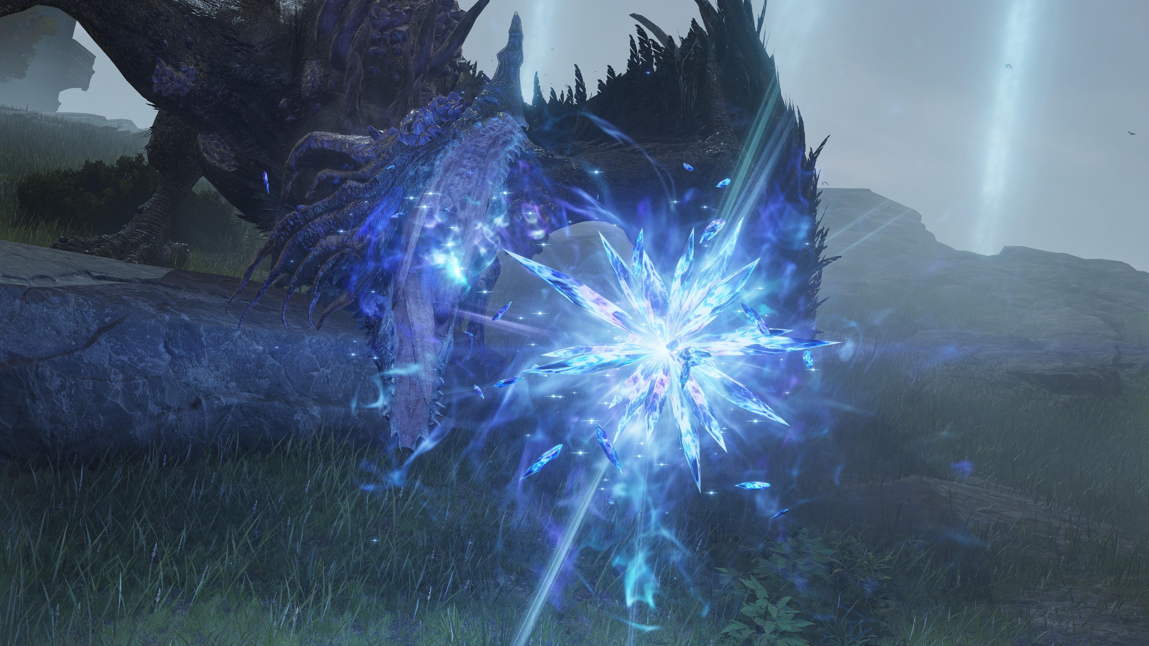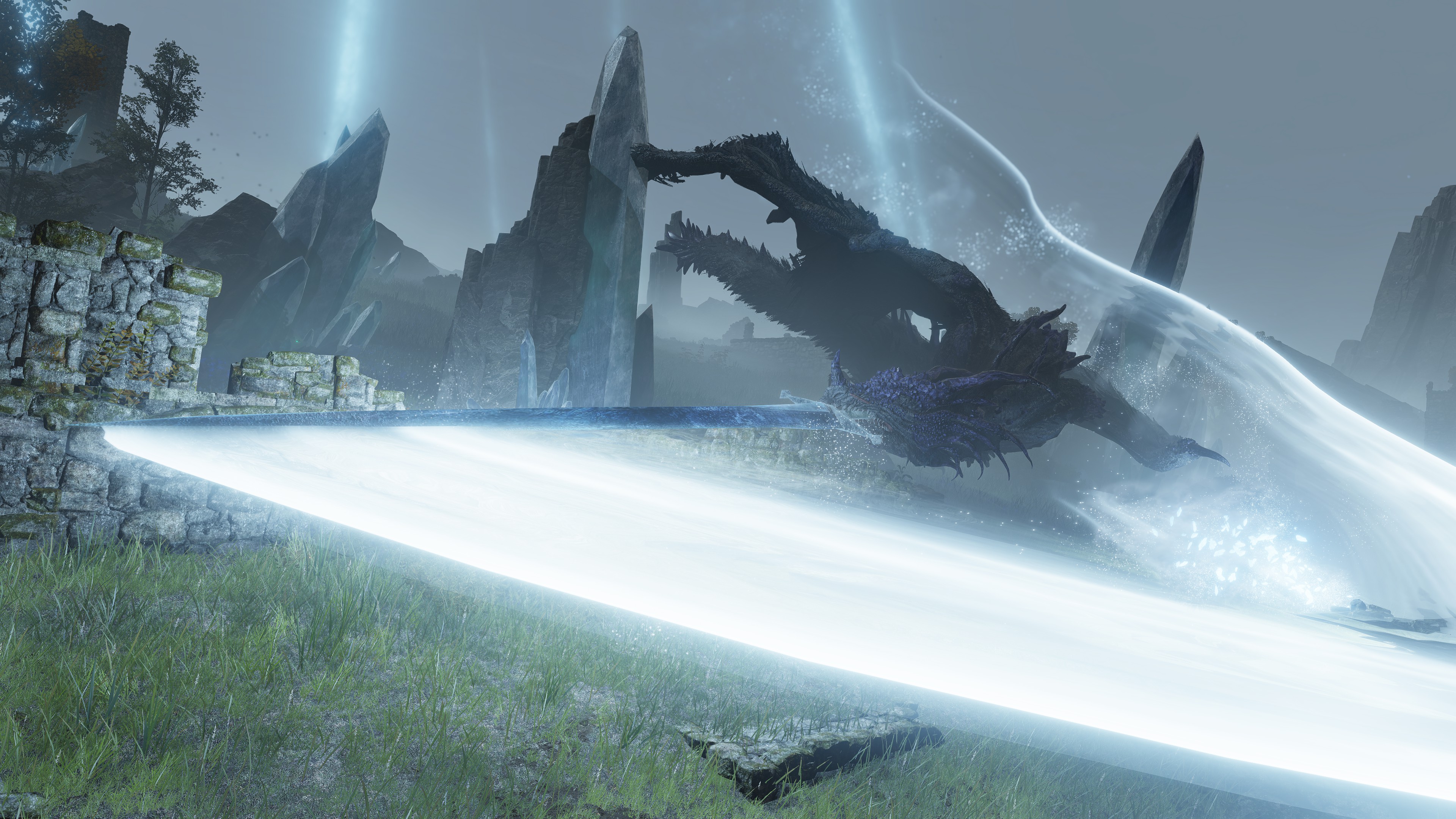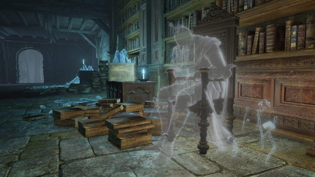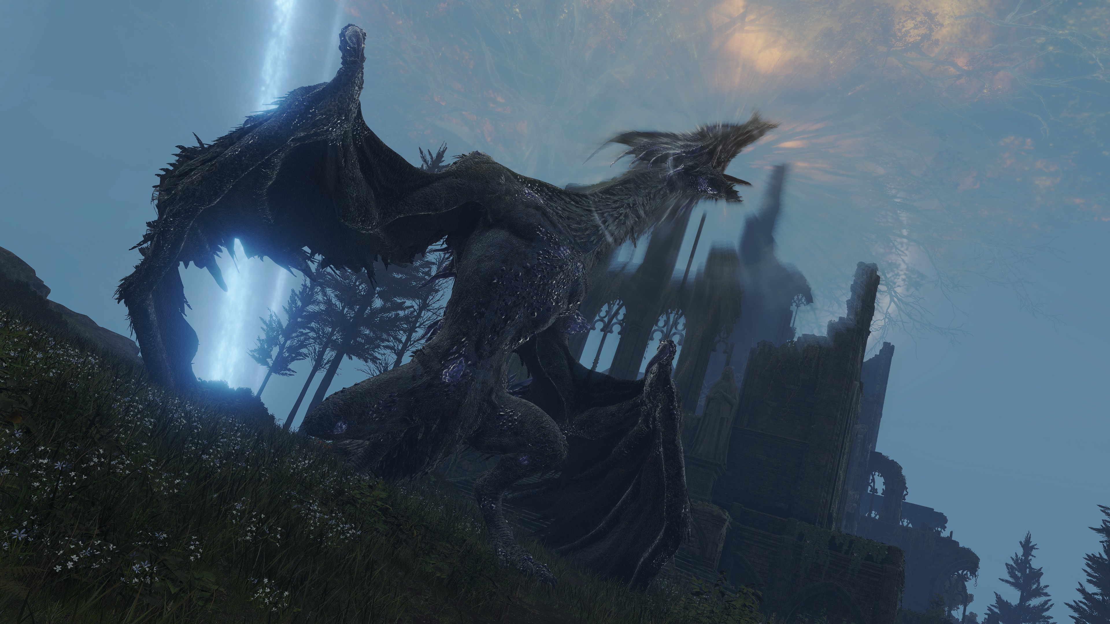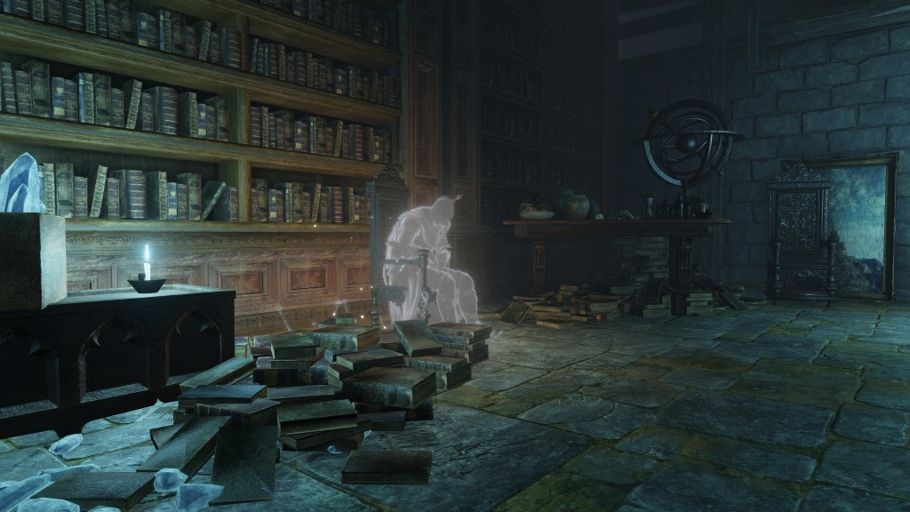 The wyvern was apparently defeated when trying to devour the witch and, respecting her strength, swore allegiance — befitting the name’s reference to adularia, the most common kind of moonstone. As a result, Adula received some of that strength in the form of the Darkmoon sorcery blade in those jaws instead, and the sorcery instruction aids in channeling the power of that glintstone body into Crystalian-style sorcery. But this flying dragon is unique from the other sorcerer-eaters, exhibiting blue crystals in opposition to the blue-green crystals matching the staff of standard sorcerer enemies. If the turquoise coloration reflects the kind of sorcerers most of the dragon were feeding on, then Adula has been devouring another kind. And when it comes to true blue crystal, the only sorcerers relevant to discussion in Liurnia are the Crystalians and the Carians who adopted their crystal sorcery. The latter would explain why we find the Three Sisters area lies in ruins, with nary a Carian to speak of. One dragon made a surprise attack on those living and researching behind the manor.