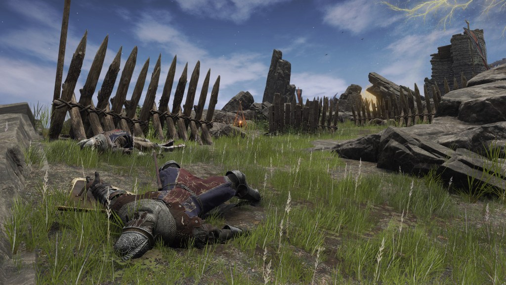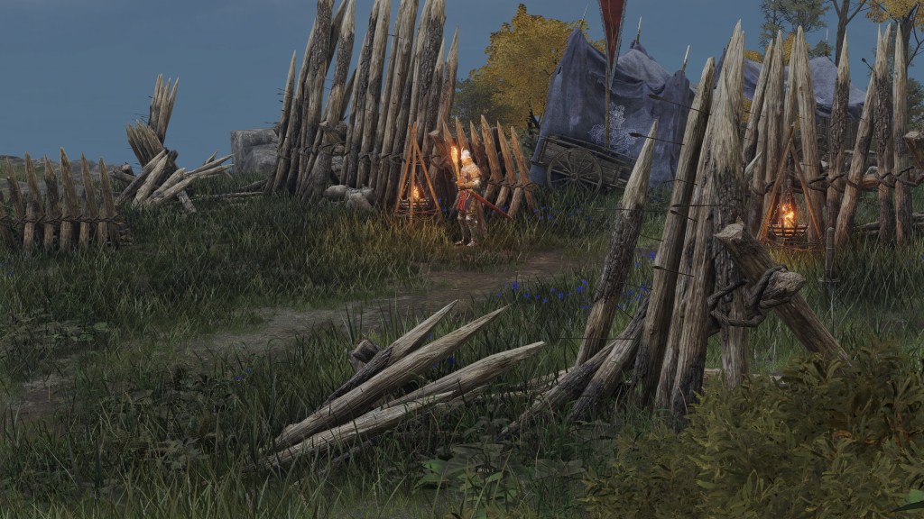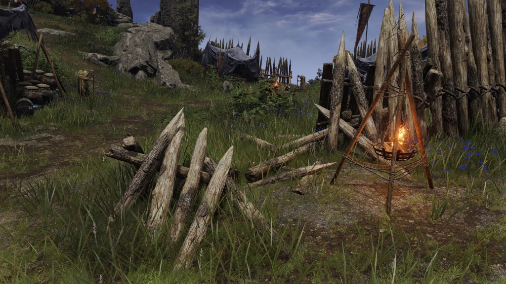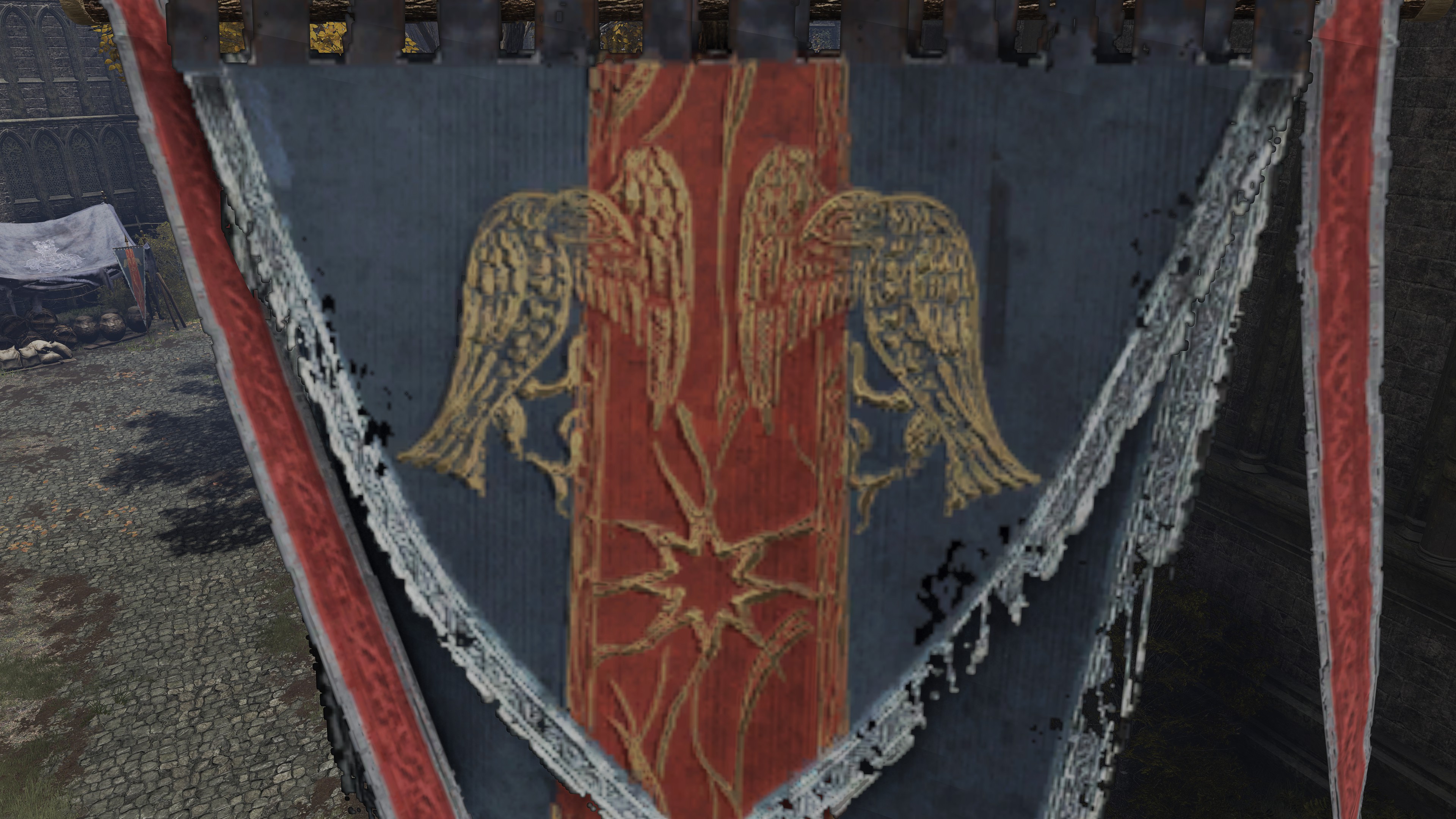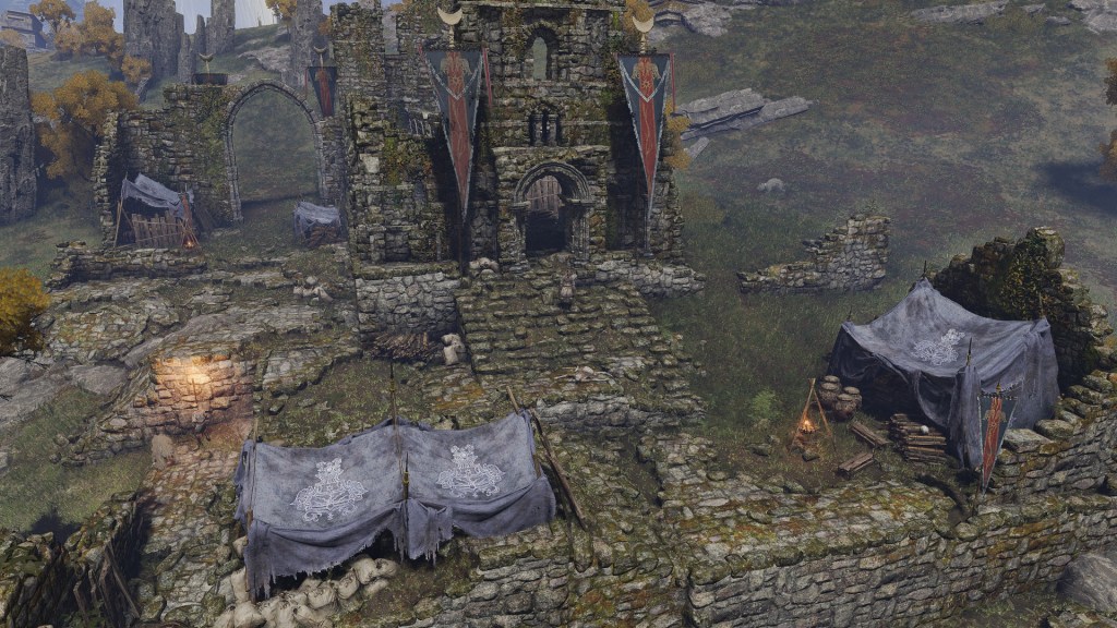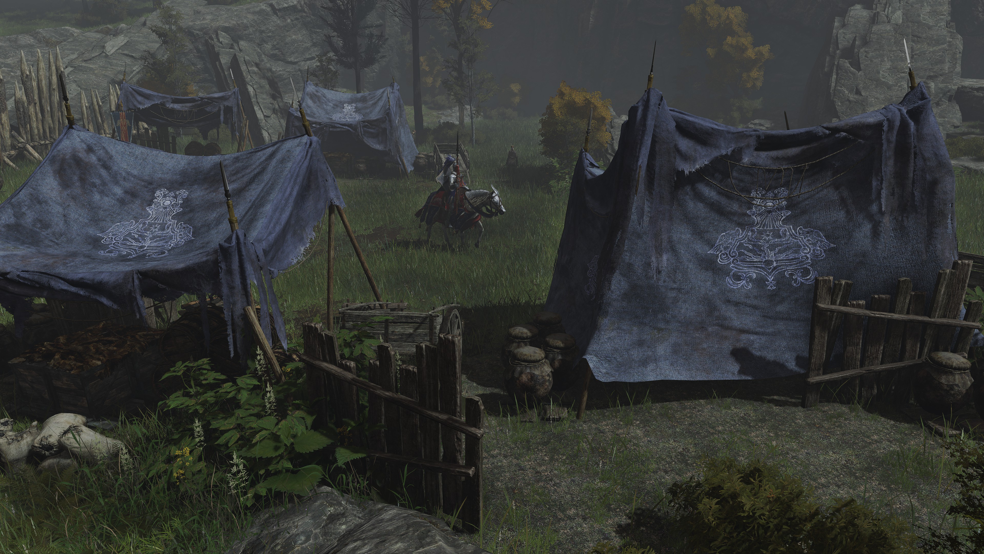 Turning on the innocent in such a way earned the Cuckoos notoriety, but it did have practical justifications if nothing else. Of course, some reasons are stronger than others. For instance, the Purified Ruins (Site P) next door have been turned into another Cuckoo camp, soldiers exhausted after no doubt pillaging the place in similar fashion. However, the name affirms that this more recent genocide was in order to cleanse the village of the Frenzied Flame, the spirit of an afflicted commoner and corpses with melted eyeballs among the remains. That commoner is a conscript, many of whom lay dead among the surviving Cuckoos along with the nobles — evidently, it wasn’t enough to kill just the villagers. Now, it is only the Cuckoos, the nobles’ orphaned pets seized to be war hounds, and the still stray muts left to scavenge the ruins. Had they not resorted to such measures, the disease might well have spread to the troops and across all of Liurnia, the Cuckoos could argue. But that was not the case with Laskyar, and their efforts at intimidation didn’t change the realities on the ground regardless.