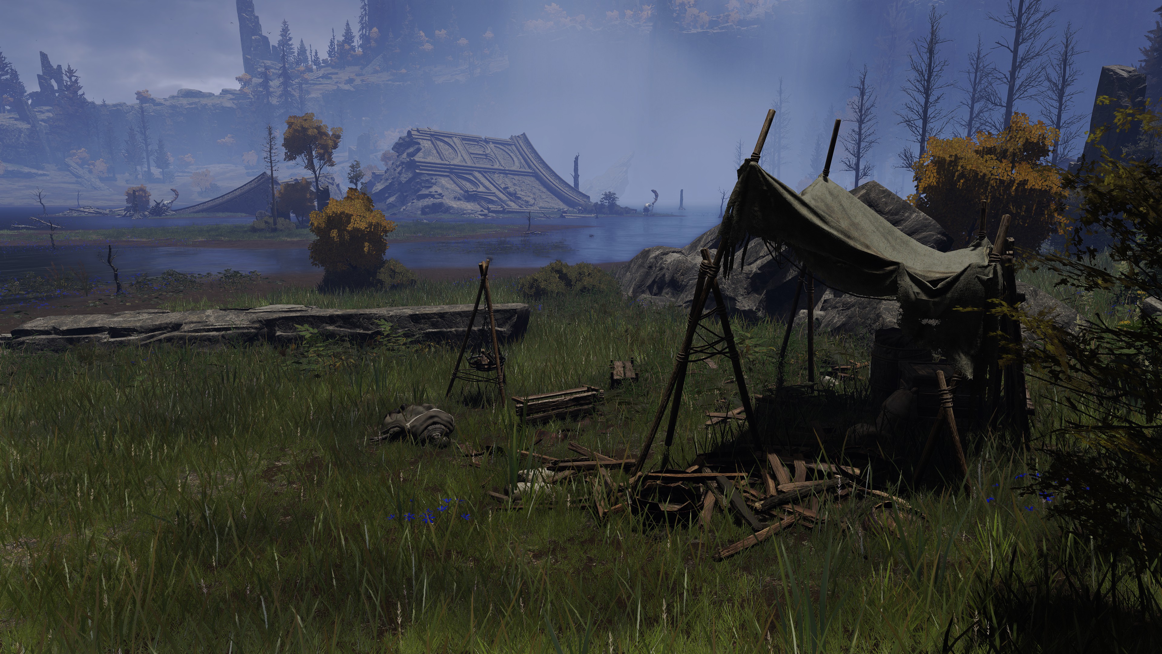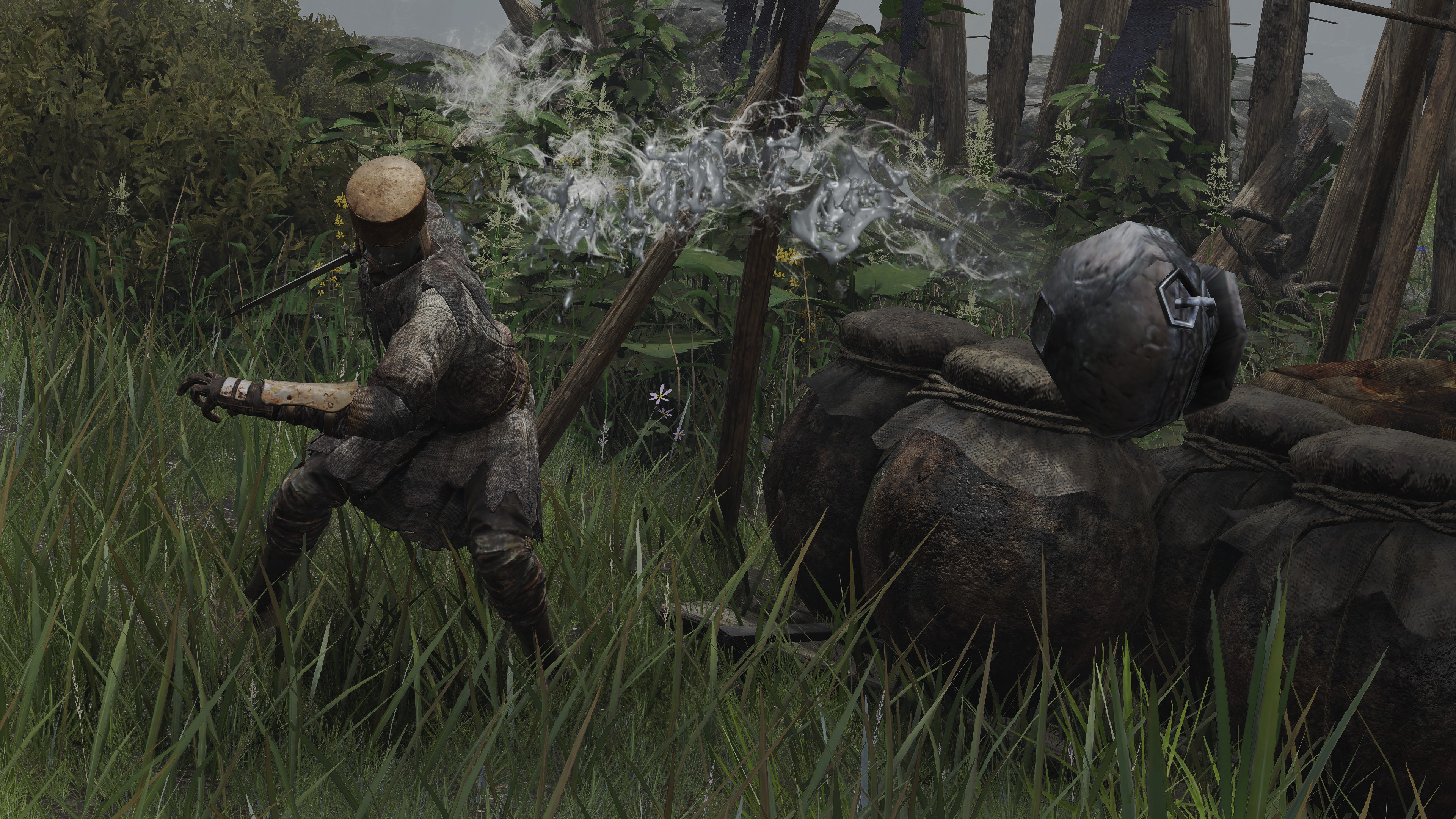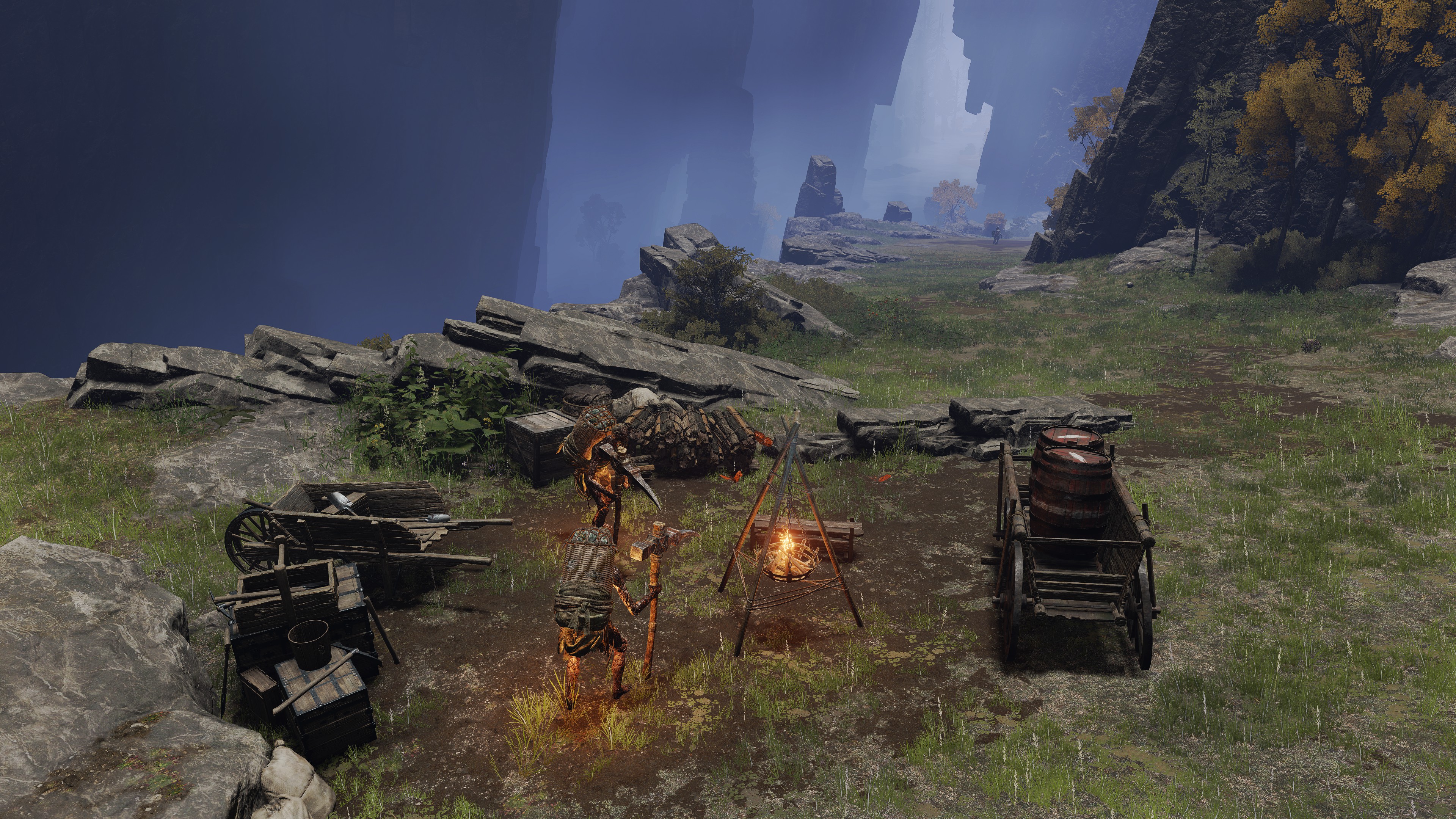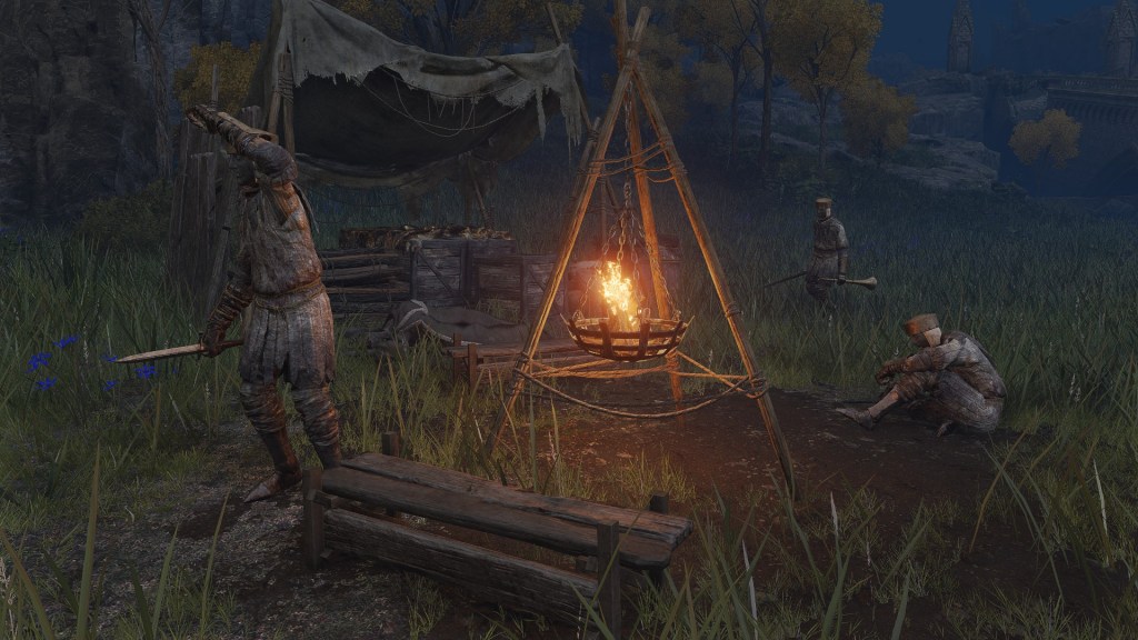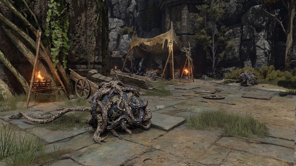 Turning on the innocent in such a way earned the Cuckoos notoriety, but it did have practical justifications if nothing else. Of course, some reasons are stronger than others. For instance, the Purified Ruins (Site P) next door have been turned into another Cuckoo camp, soldiers exhausted after no doubt pillaging the place in similar fashion. However, the name affirms that this more recent genocide was in order to cleanse the village of the Frenzied Flame, the spirit of an afflicted commoner and corpses with melted eyeballs among the remains. That commoner is a conscript, many of whom lay dead among the surviving Cuckoos along with the nobles — evidently, it wasn’t enough to kill just the villagers. Now, it is only the Cuckoos, the nobles’ orphaned pets seized to be war hounds, and the still stray muts left to scavenge the ruins. Had they not resorted to such measures, the disease might well have spread to the troops and across all of Liurnia, the Cuckoos could argue. But that was not the case with Laskyar, and their efforts at intimidation didn’t change the realities on the ground regardless.
