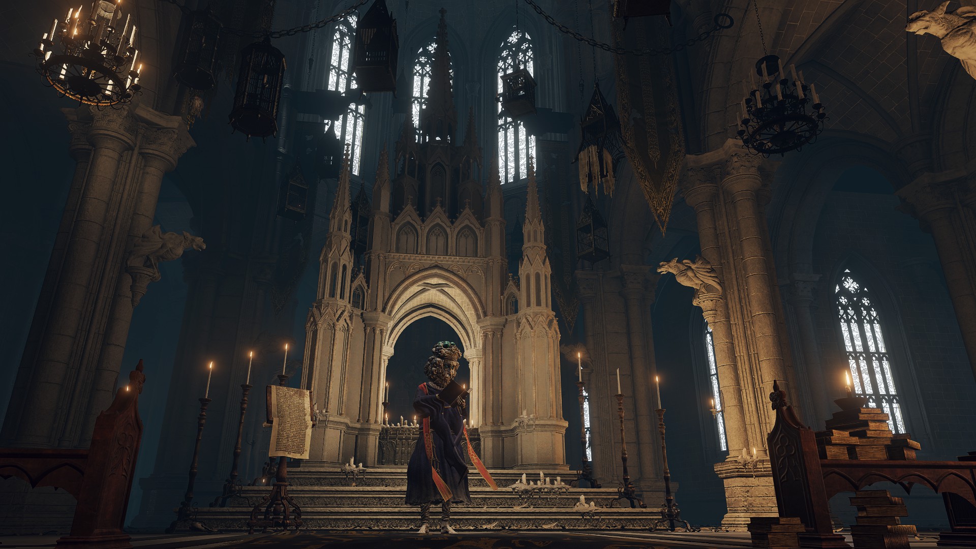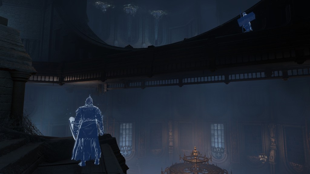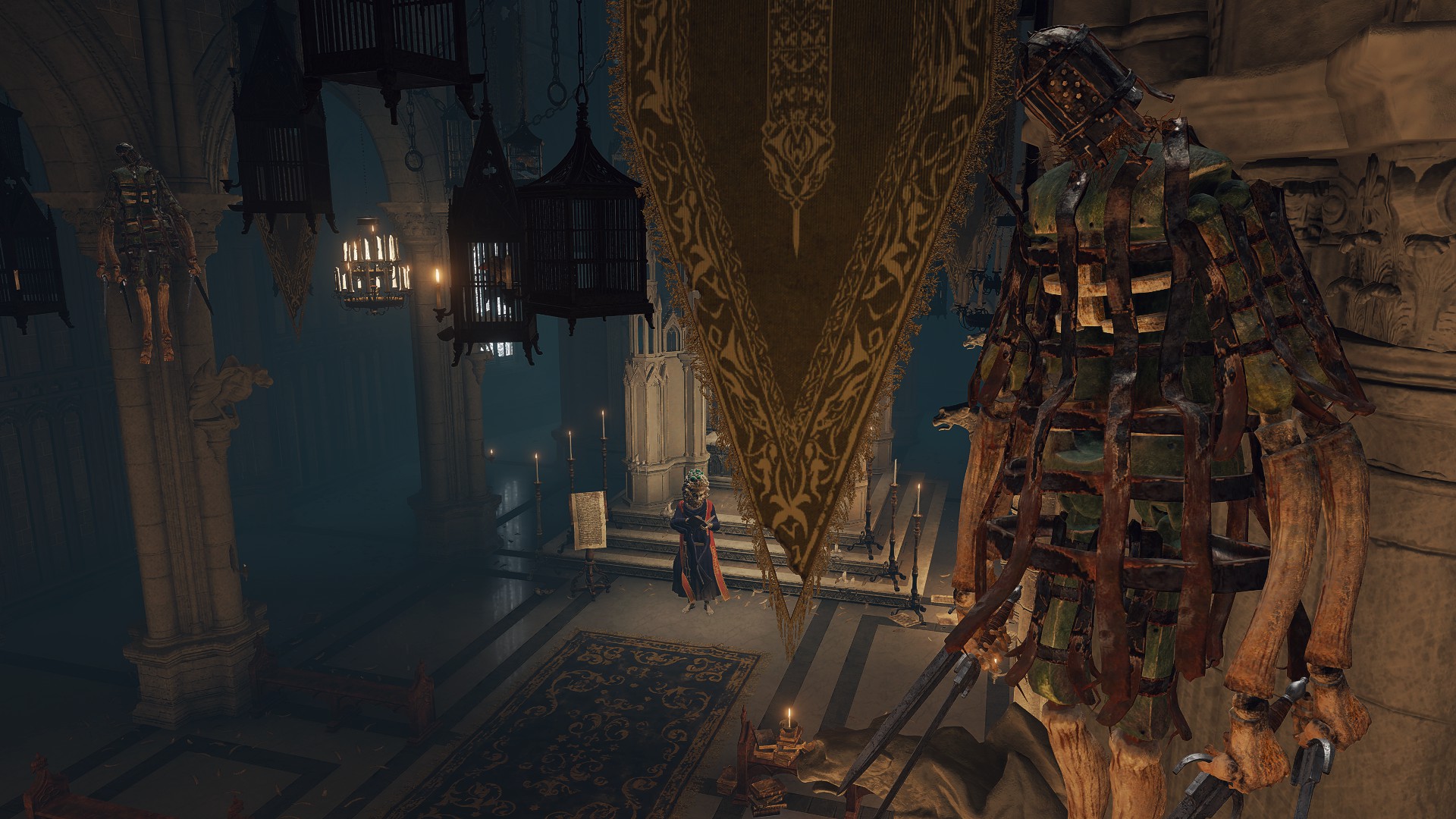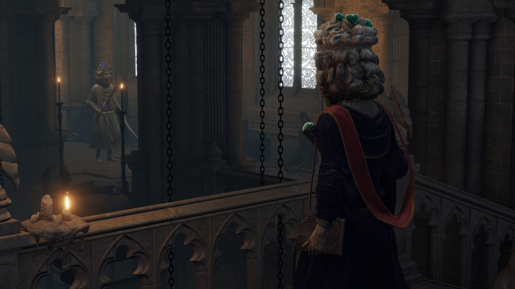 Meanwhile, the Lunar Princess had been staying at the Cathedral of Manus Celes. The church is the one building the dragons haven’t reduced to total rubble, in part because the flying glintstone knight protects it along with Ranni’s Rise. The place has mainly suffered damage from a shower of starlight shards crashing through the roof, which would be appropriate if the witch concerned with her fate was performing rituals to try and change it at the altar. The Cathedral is also where her Two Fingers have been imprisoned as she awaits the means to kill them alongside her fate. Even Alecto lies captured in the local evergaol, doubtless after tracking her backstabbing co-conspirator to the Moonlight Altar for revenge. Therefore, the Darkmoon witch was probably using the Cathedral as a hideout when she disappeared, ignoring matters with the manor until something beckoned her return. Perhaps she saw the destruction wrought by the dragons on the Altar and, presuming a similar attack on the castle, made her way over. But it was following their assault everywhere in Caria’s western holdings that she left for home.