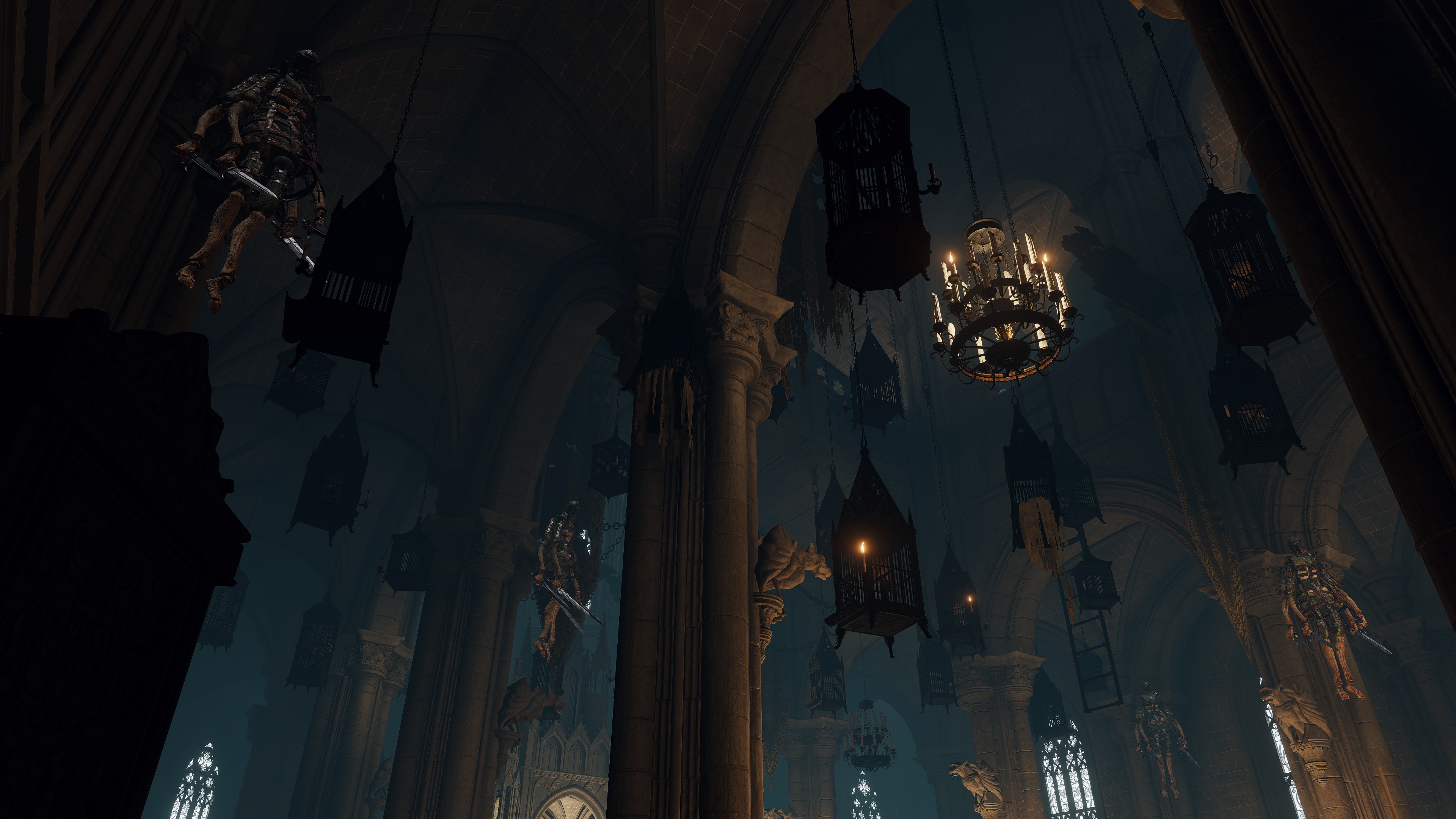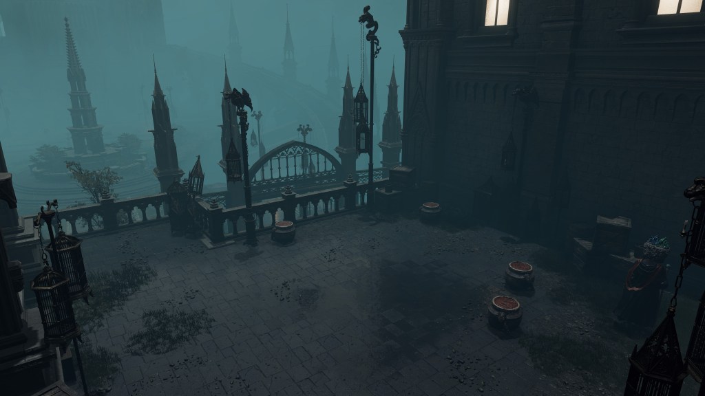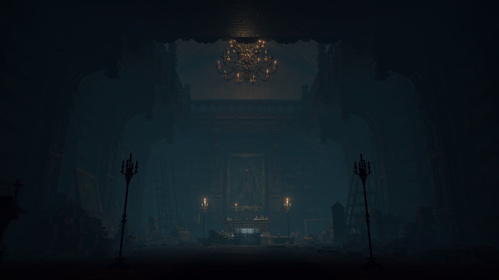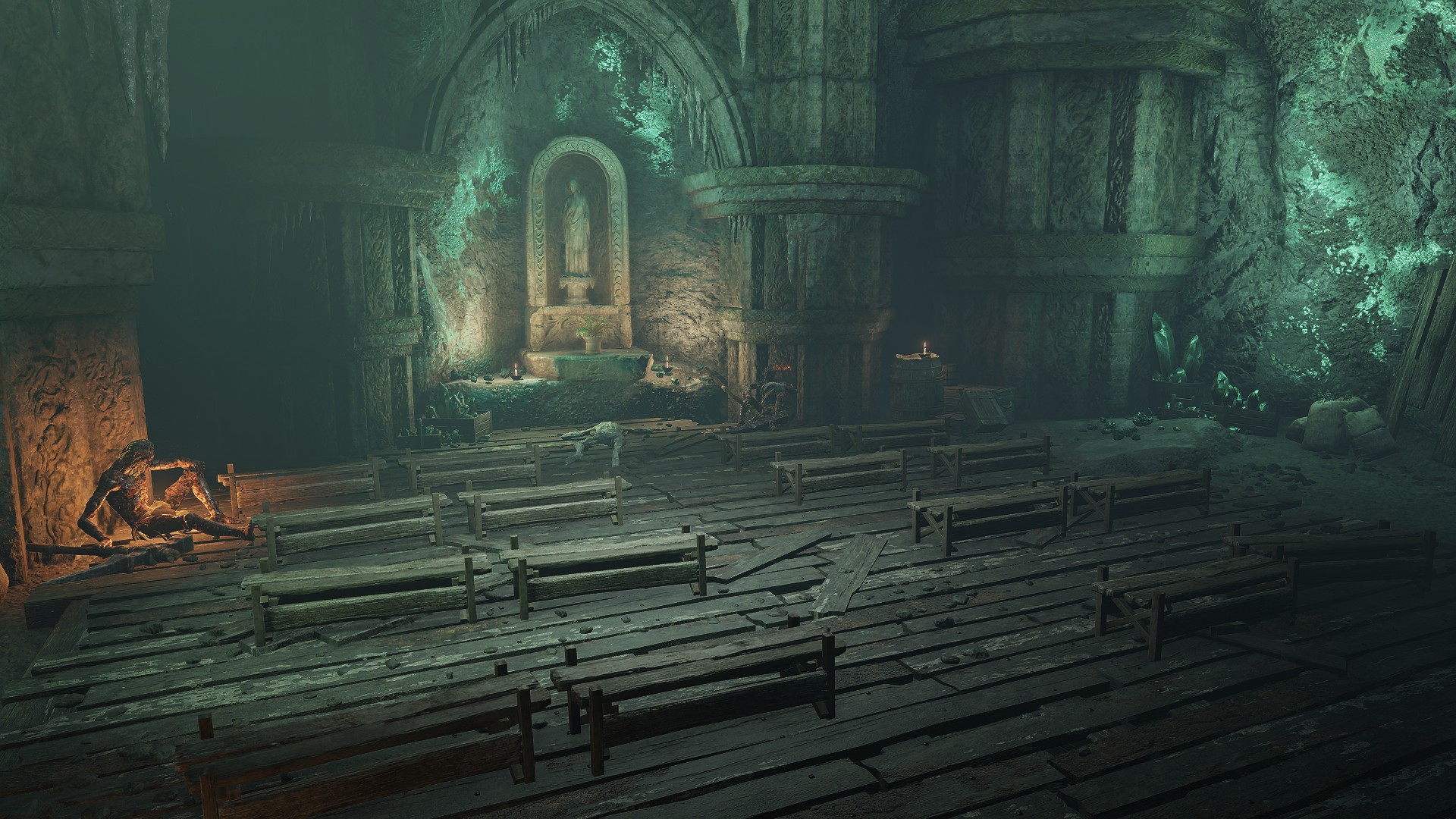 Meanwhile, the Lunar Princess had been staying at the Cathedral of Manus Celes. The church is the one building the dragons haven’t reduced to total rubble, in part because the flying glintstone knight protects it along with Ranni’s Rise. The place has mainly suffered damage from a shower of starlight shards crashing through the roof, which would be appropriate if the witch concerned with her fate was performing rituals to try and change it at the altar. The Cathedral is also where her Two Fingers have been imprisoned as she awaits the means to kill them alongside her fate. Even Alecto lies captured in the local evergaol, doubtless after tracking her backstabbing co-conspirator to the Moonlight Altar for revenge. Therefore, the Darkmoon witch was probably using the Cathedral as a hideout when she disappeared, ignoring matters with the manor until something beckoned her return. Perhaps she saw the destruction wrought by the dragons on the Altar and, presuming a similar attack on the castle, made her way over. But it was following their assault everywhere in Caria’s western holdings that she left for home.