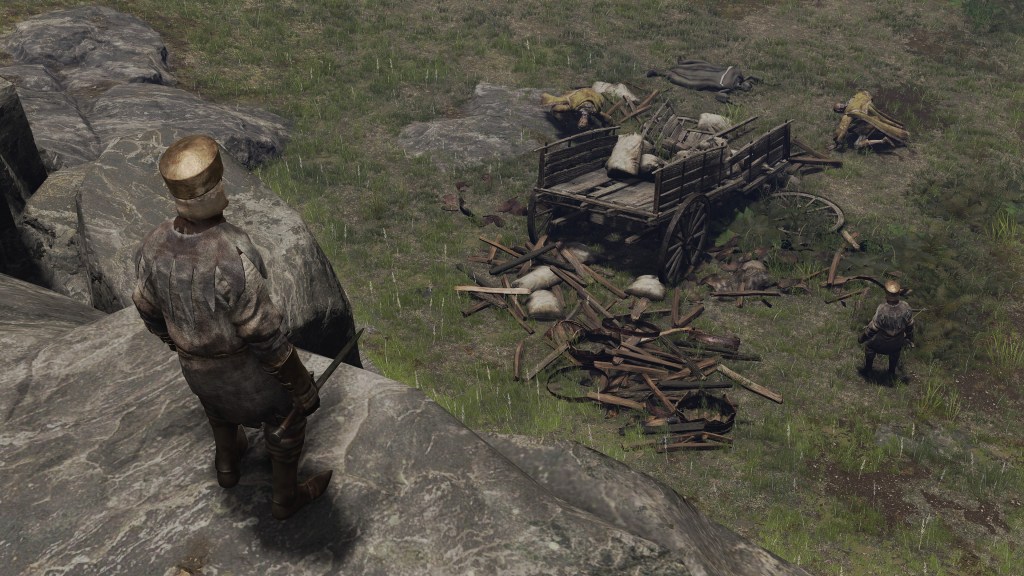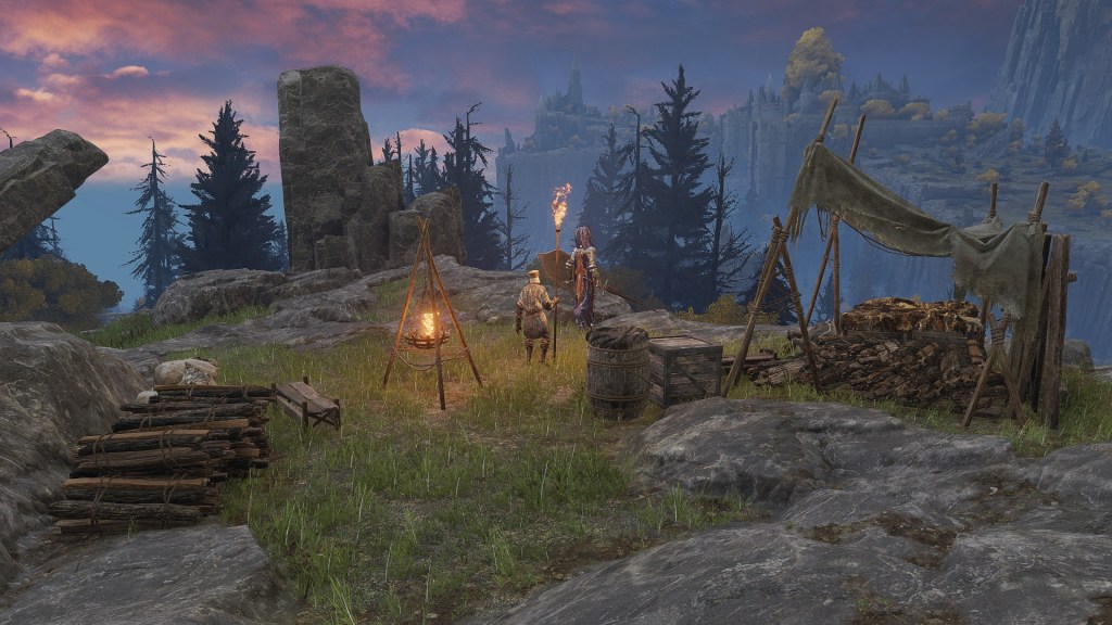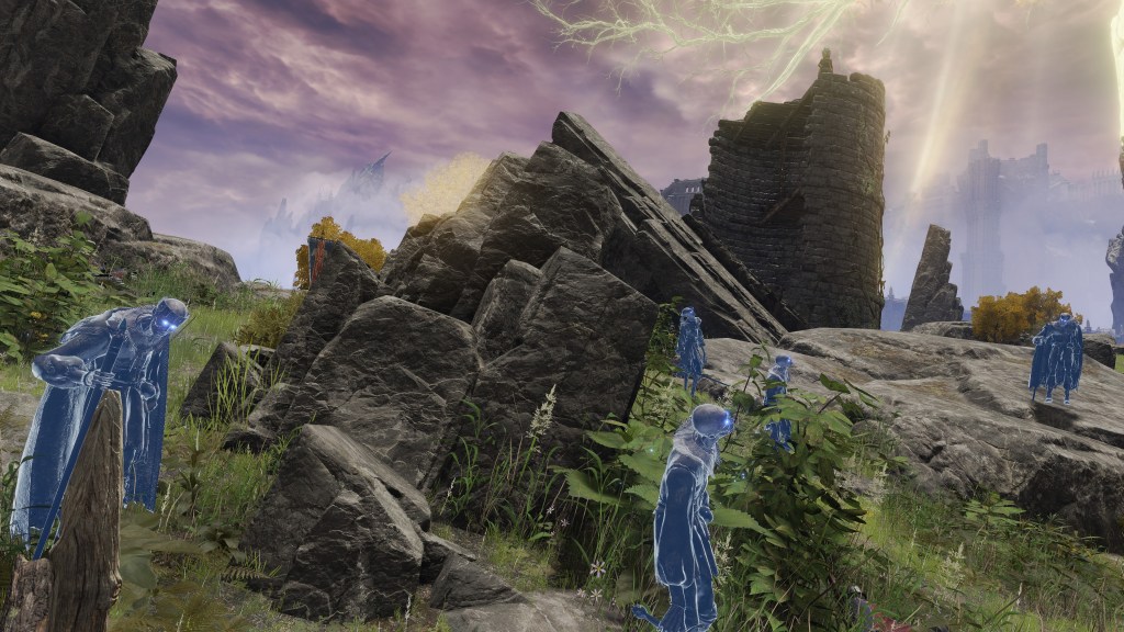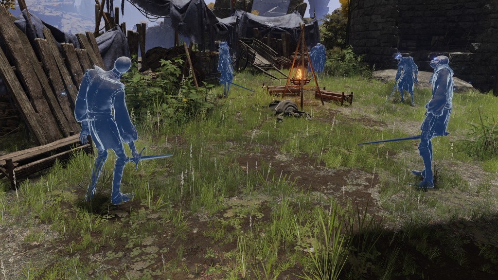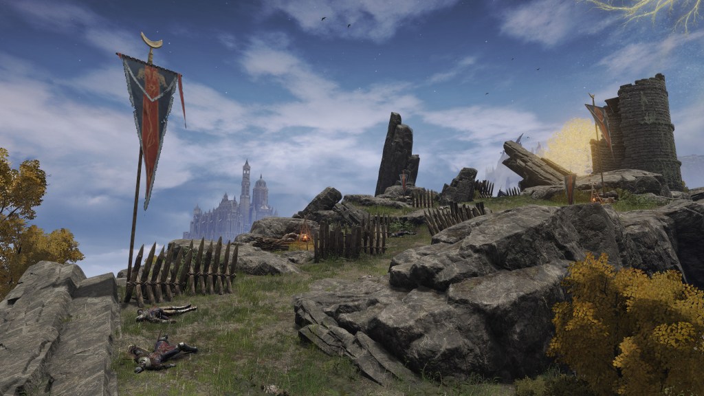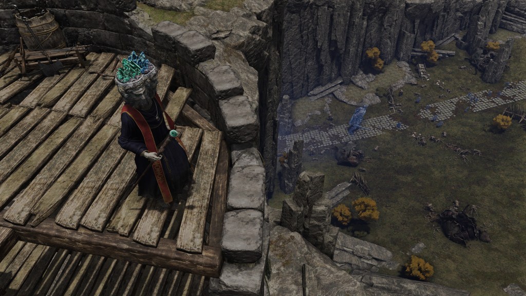 Part of the rebellion’s struggles come from self-sabotage. We find Cuckoos at war with an army of puppets beneath the Highway Lookout Tower, a noble’s spirit revealing how they were ambushed. Heading up to the tower, the army obviously made camp to secure the choke point. But all the Cuckoos in camp are dead, more puppets taking their place. And quietly watching the mayhem from atop the lookout is a Twinsage sorcerer. Apparently, someone from the academy joined this detachment. The puppets do consist of nobles and a troll knight, the former easy to procure at Raya Lucaria and the latter feasible to capture like Bols. The only question is why the sudden mutiny. But the fact that the sorcerer owns puppets insinuates a history with Caria Manor, and behind him lies a corpse holding a Carian Glintblade Staff — in other words, a manor associate. Perhaps this individual was a dear friend, killed when the Cuckoos moved in and discovered the enemy’s hideaway in the ruin. If so, that inadvertently created a turncoat in their ranks, ready to spring the trap once everything looked safe.