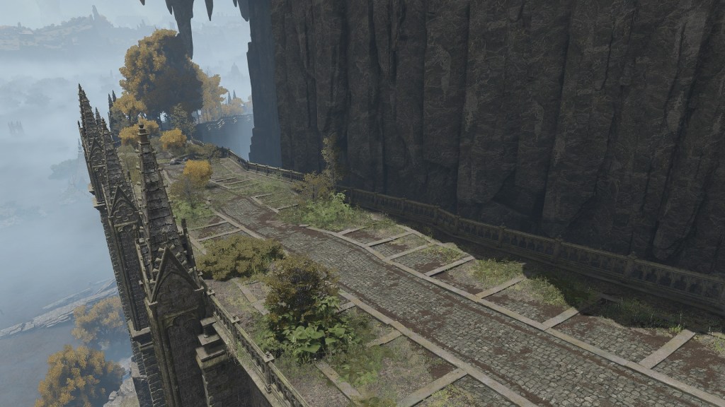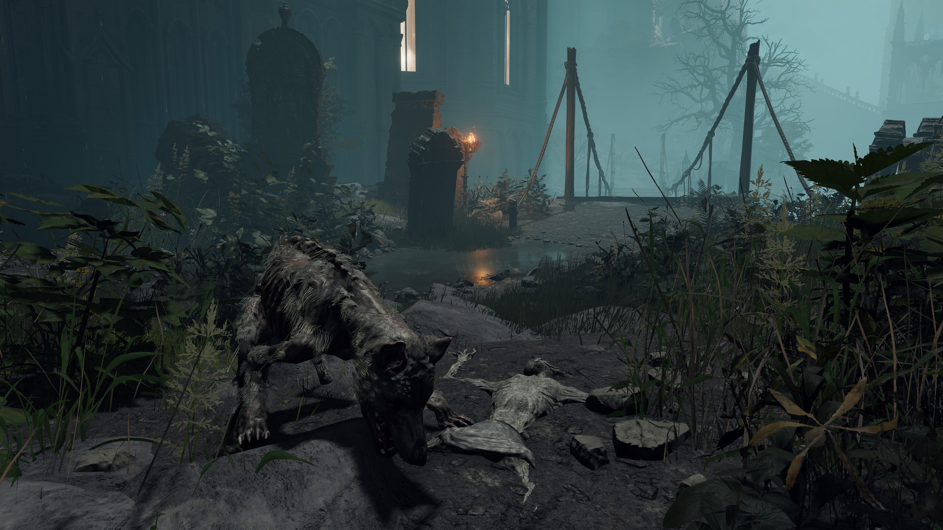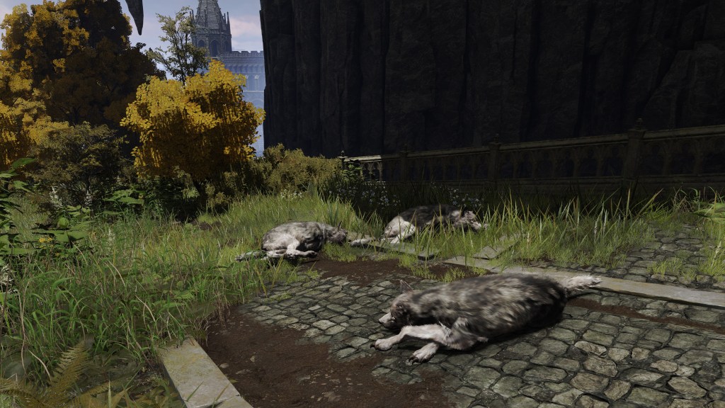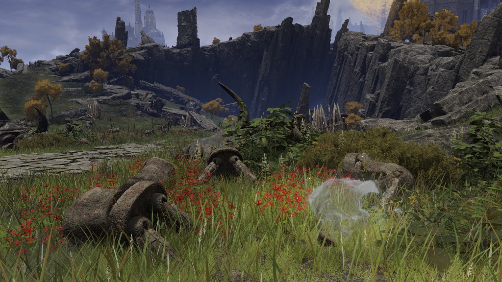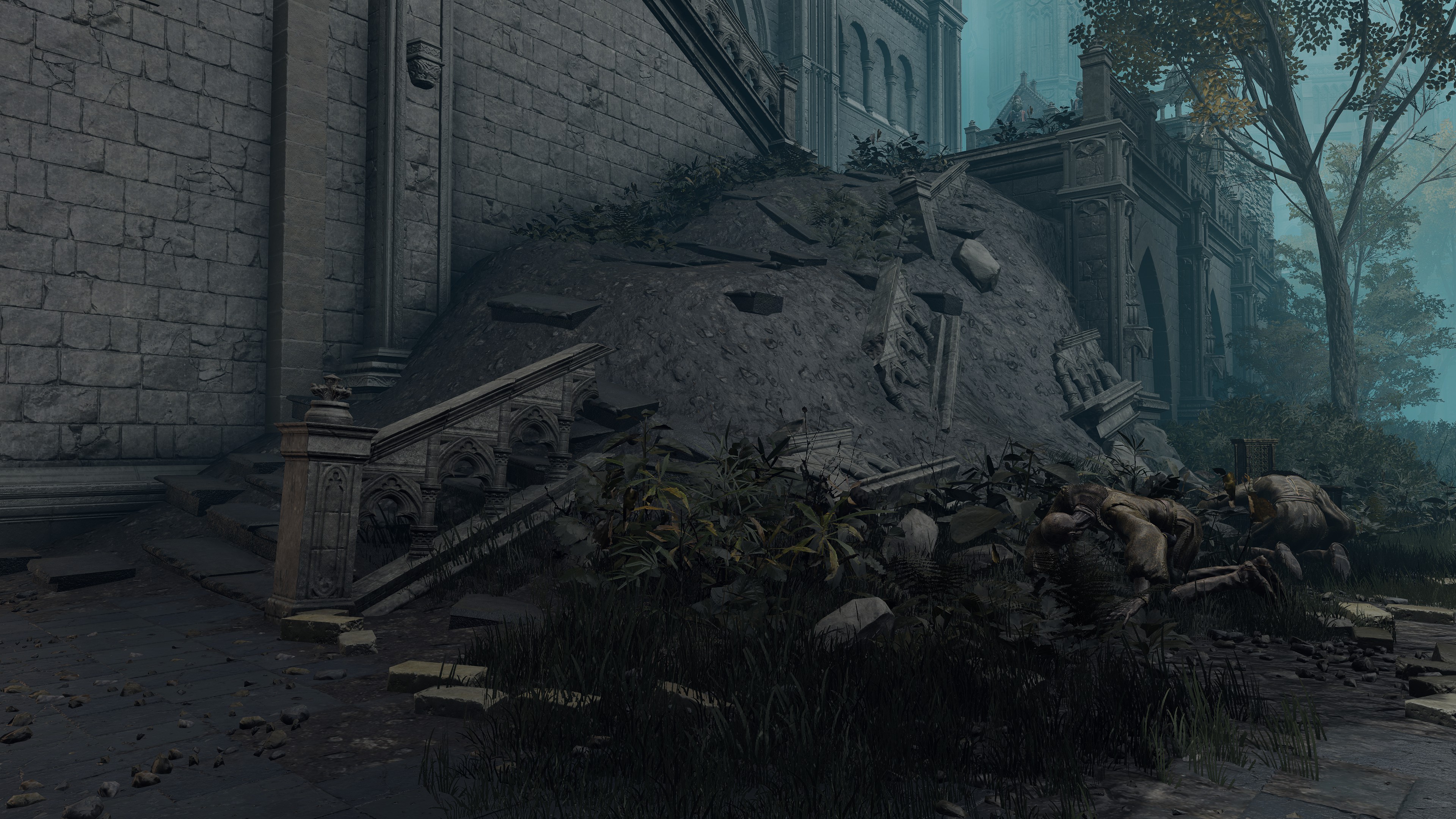 At present, the Albinaurics have pushed Raya Lucaria’s forces back all the way to the Academy Gate Town, forcing them to retreat to the west gate. From there, they have hunkered down, effectively entrenching themselves with help of the high ground. But while arguably kings of the hill, it doesn’t change that it is a losing position. So trapped are they now, the soldiers have begun burying their dead on the street side, tombstones crammed together in what little grass exists in the shade of the buildings. The Albinaurics have simply overrun the rest of the town, some taking over the neighboring Temple Quarter; the coffin cemetery between it and the fallback point betraying the casualties. Between the two parties in this war zone, it is no wonder that we don’t find any residents left alive, bloodroses scattered about in their place. And because of the chaos and death, the infrastructure itself has collapsed along with civilization.