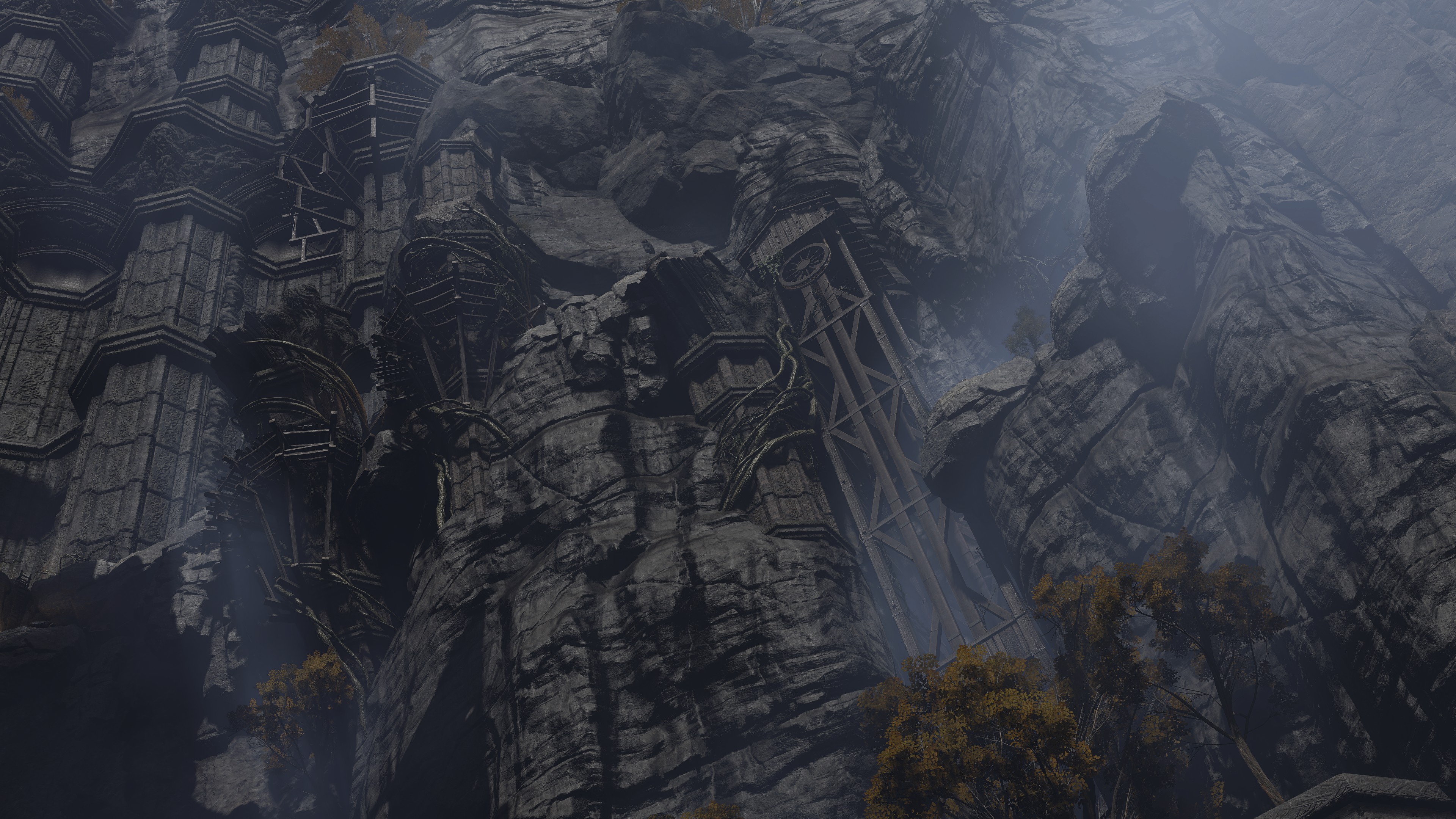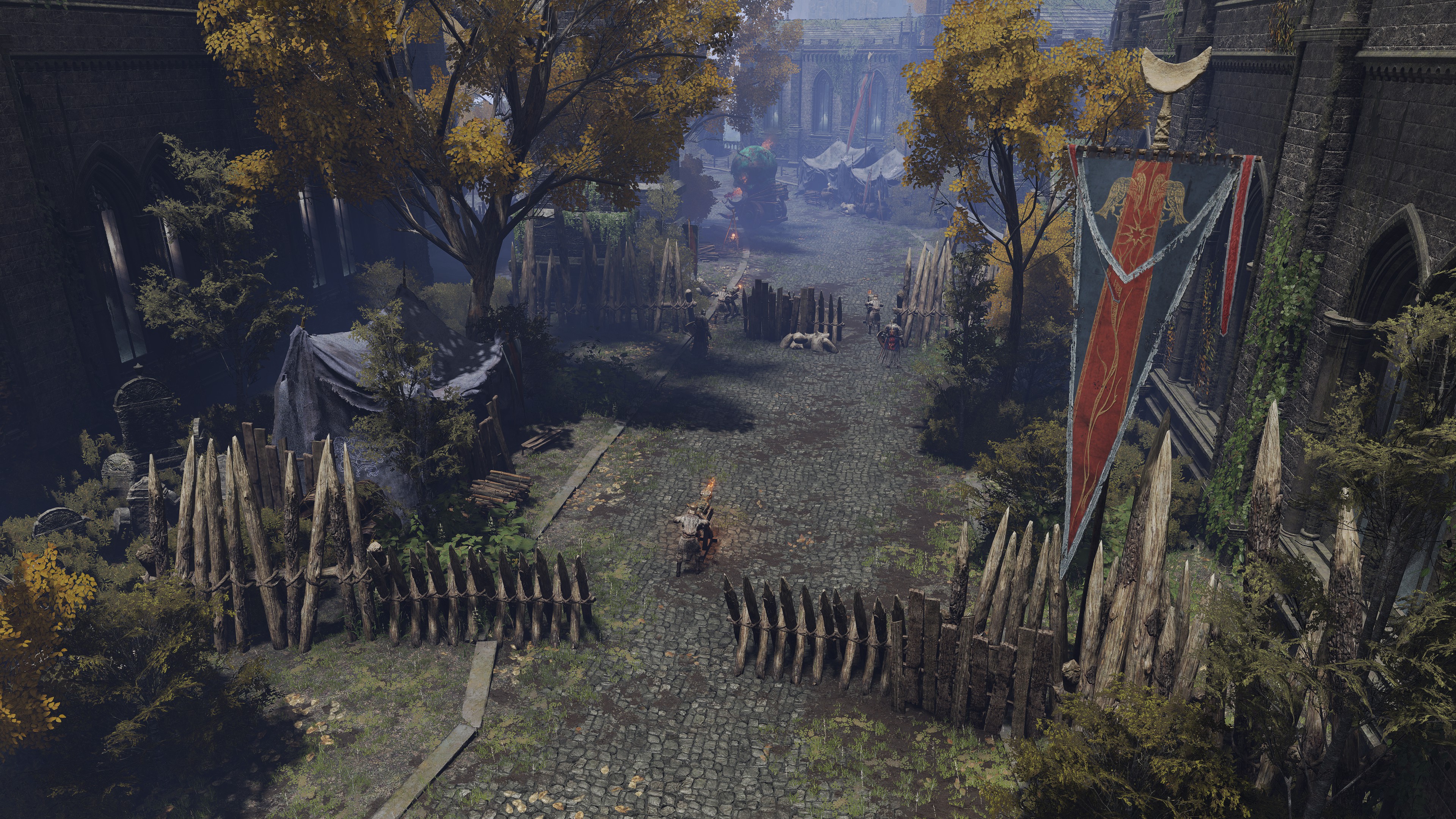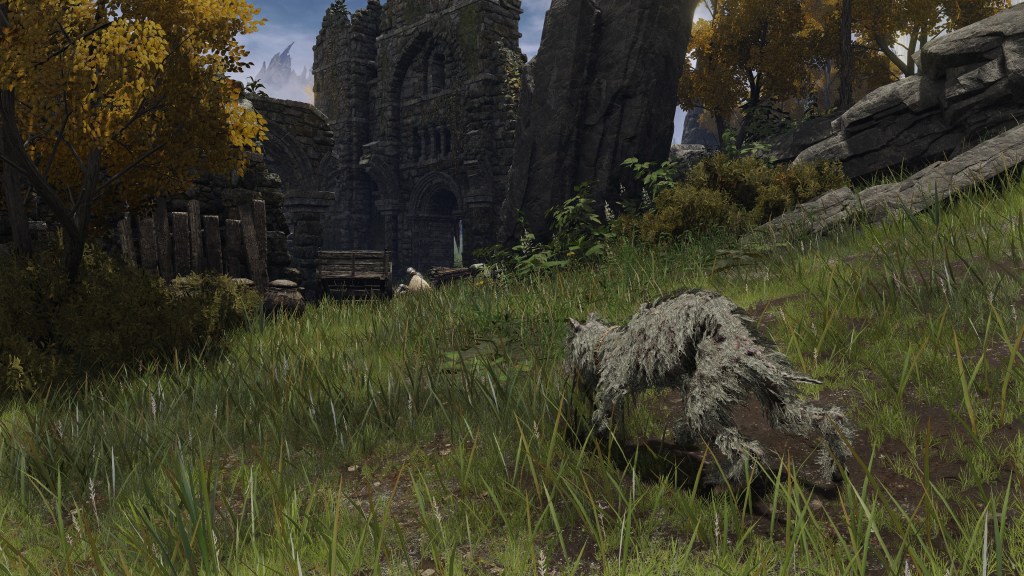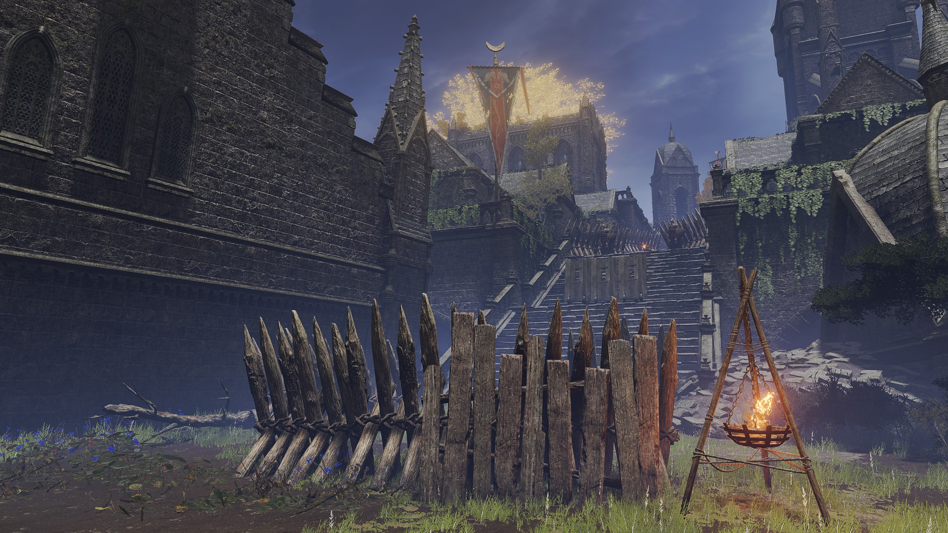 At present, the Albinaurics have pushed Raya Lucaria’s forces back all the way to the Academy Gate Town, forcing them to retreat to the west gate. From there, they have hunkered down, effectively entrenching themselves with help of the high ground. But while arguably kings of the hill, it doesn’t change that it is a losing position. So trapped are they now, the soldiers have begun burying their dead on the street side, tombstones crammed together in what little grass exists in the shade of the buildings. The Albinaurics have simply overrun the rest of the town, some taking over the neighboring Temple Quarter; the coffin cemetery between it and the fallback point betraying the casualties. Between the two parties in this war zone, it is no wonder that we don’t find any residents left alive, bloodroses scattered about in their place. And because of the chaos and death, the infrastructure itself has collapsed along with civilization.