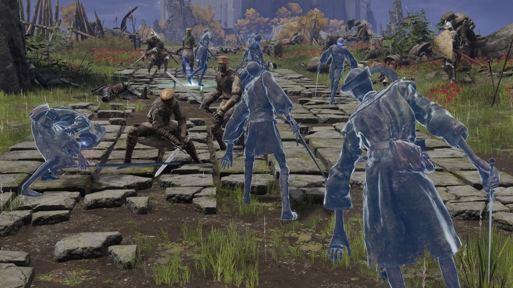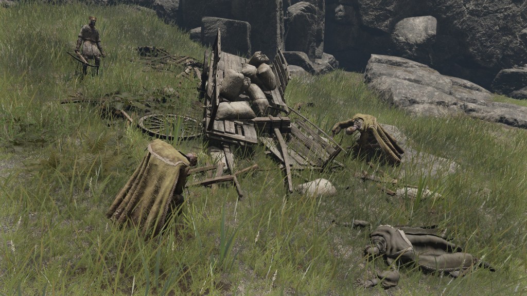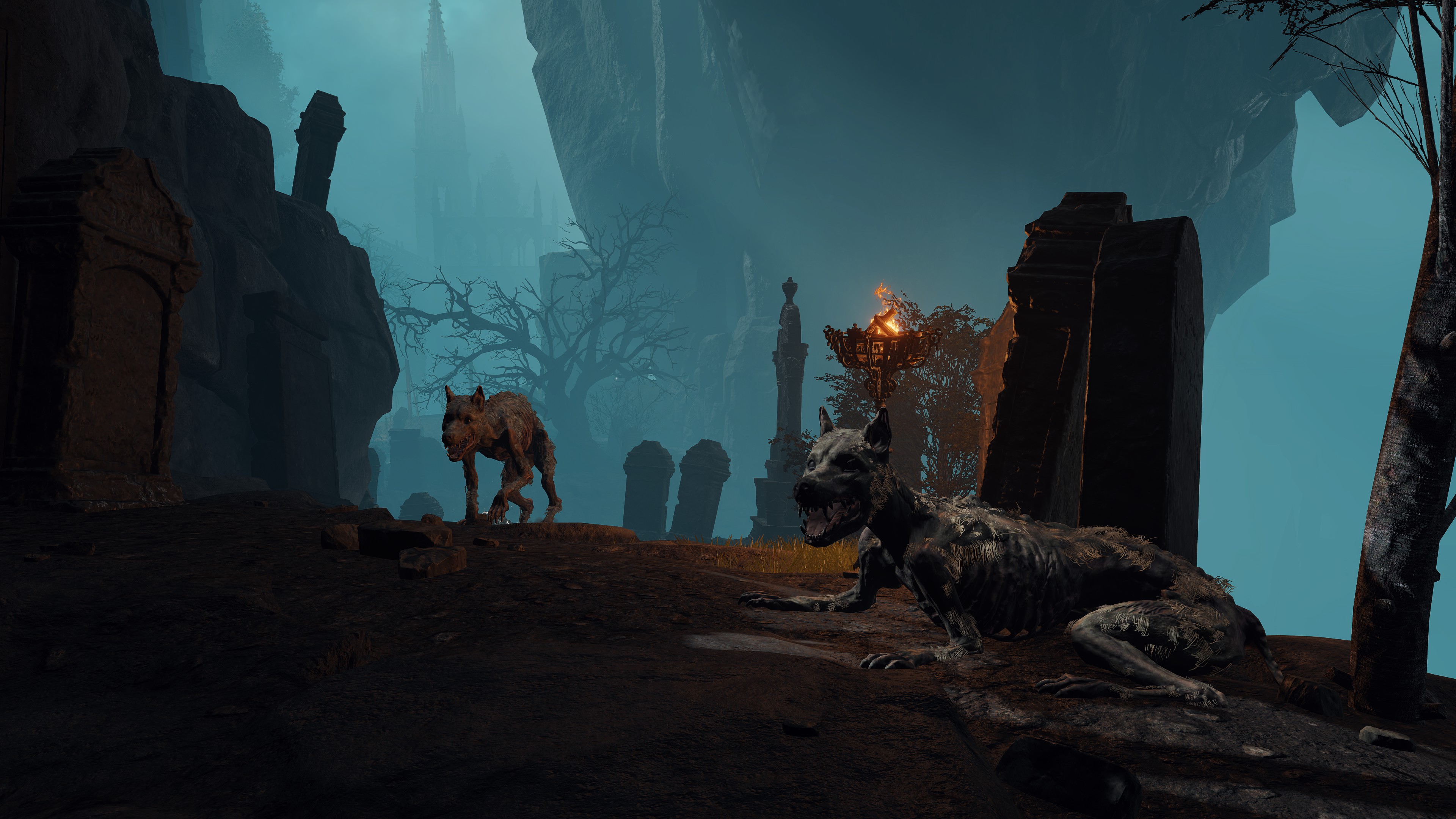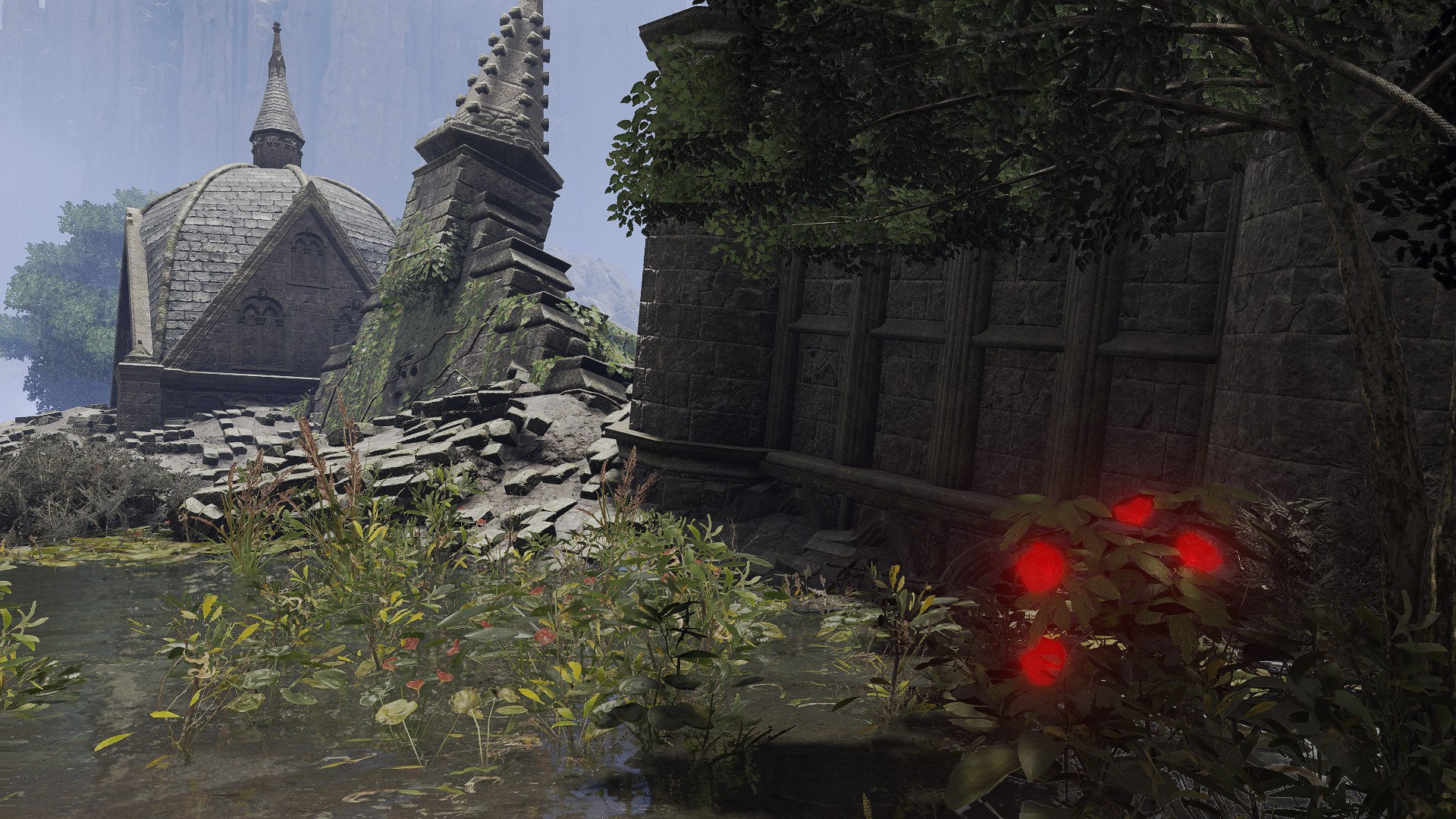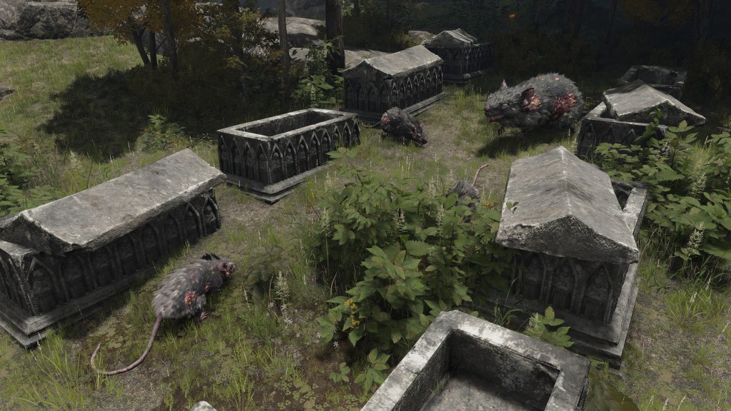 At present, the Albinaurics have pushed Raya Lucaria’s forces back all the way to the Academy Gate Town, forcing them to retreat to the west gate. From there, they have hunkered down, effectively entrenching themselves with help of the high ground. But while arguably kings of the hill, it doesn’t change that it is a losing position. So trapped are they now, the soldiers have begun burying their dead on the street side, tombstones crammed together in what little grass exists in the shade of the buildings. The Albinaurics have simply overrun the rest of the town, some taking over the neighboring Temple Quarter; the coffin cemetery between it and the fallback point betraying the casualties. Between the two parties in this war zone, it is no wonder that we don’t find any residents left alive, bloodroses scattered about in their place. And because of the chaos and death, the infrastructure itself has collapsed along with civilization.