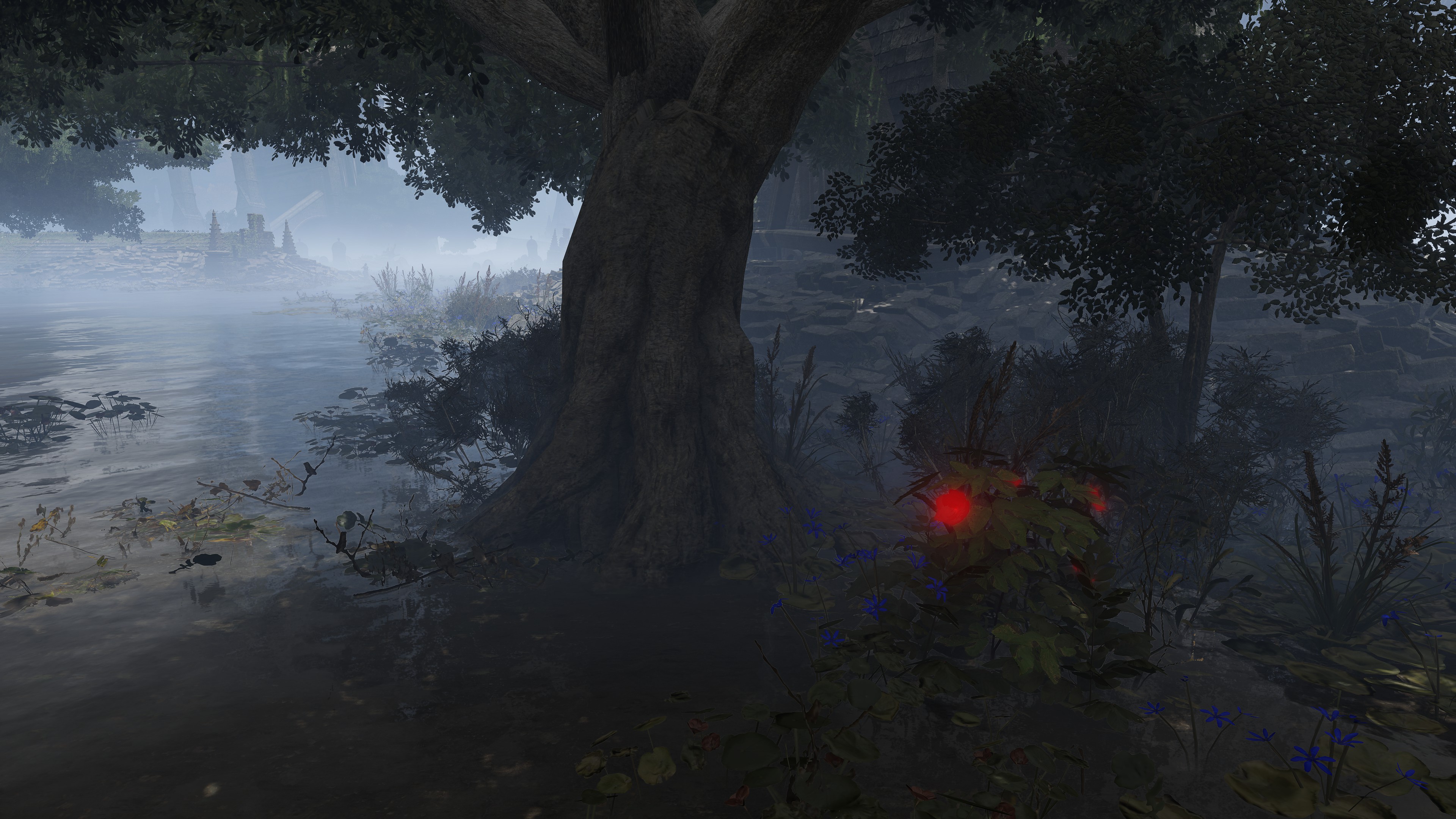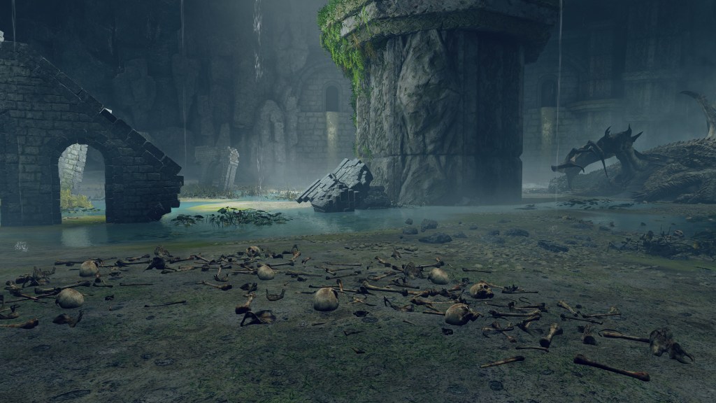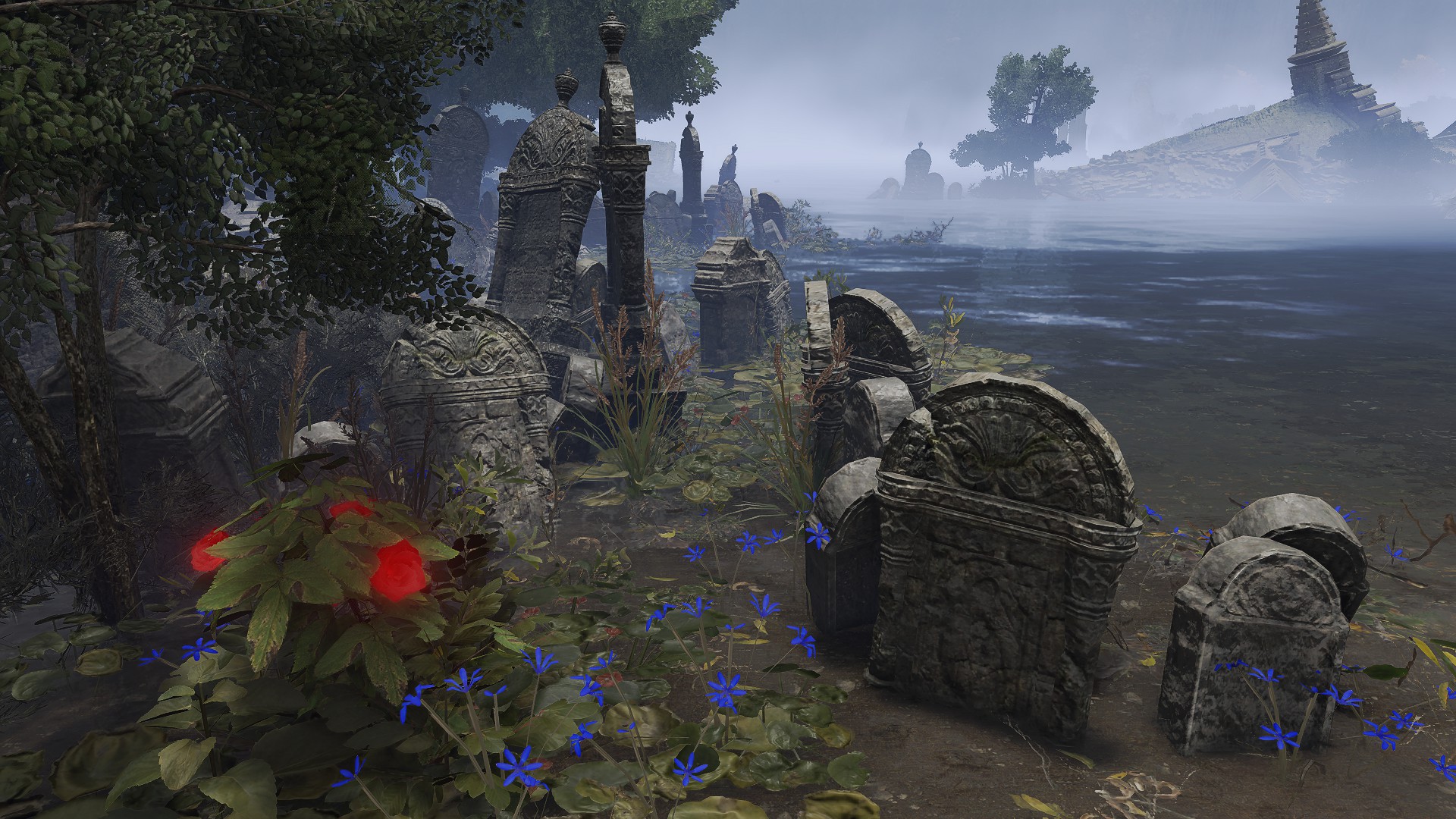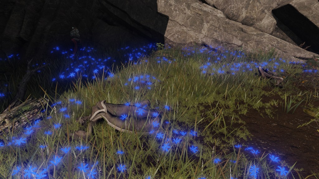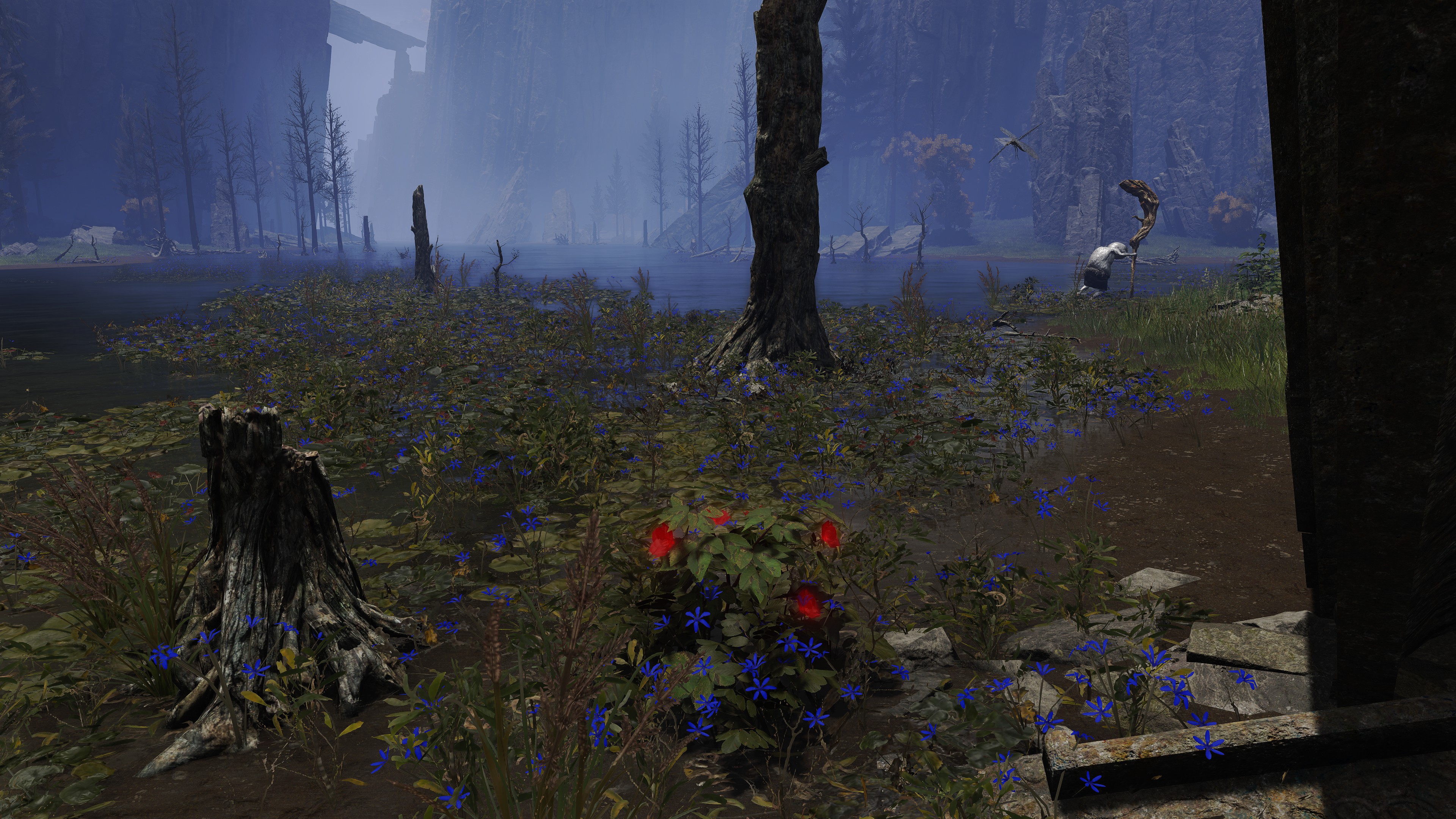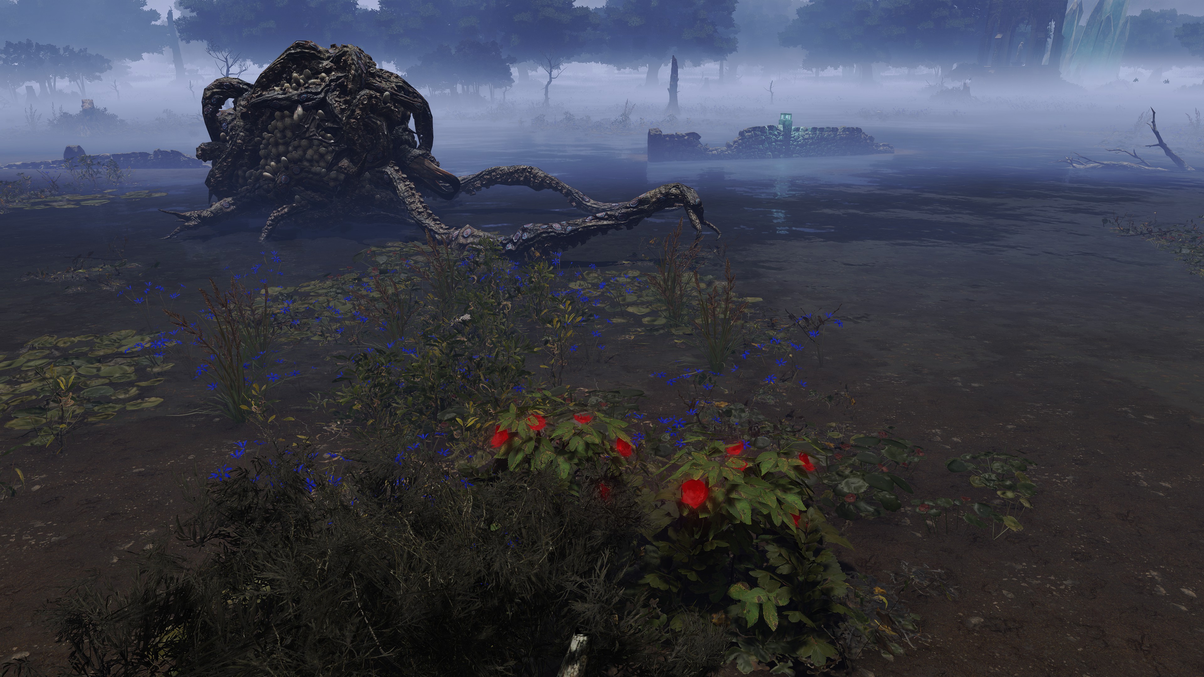 Smarag has taken the lead in retaliating. West of the Temple Quarter lies a forest of conifers. Unlike most other large trees in the lake, these look to be not just dead but burned, hence why they are still standing. The setup implies that, before the water washed in and drowned the land, someone set this small wood ablaze. Moreover, this incident looks to have killed a great many humans, attracting numerous land octopuses to lap up the bloodshed. Based on the location, it is possible that those who tried to escape the Albinaurics overrunning the Quarter were met with fiery death. And just a little further north, we see that Smarag has made the black-market trader’s island his roost, piling on bodies of would-be hunters — wise enough to bring dragonwound grease against a dragon, or foolish enough to throw hemorrhaging kukris at scale hide. Surrounded by glowing blue flowers and beetles rolling up grace, he rests on his “treasure” horde like Smaug, (スマウグ) the infamous dragon of The Hobbit who assuredly inspired his namesake. (スマラグ) It must thus be the sorcerer devourer plaguing this region.