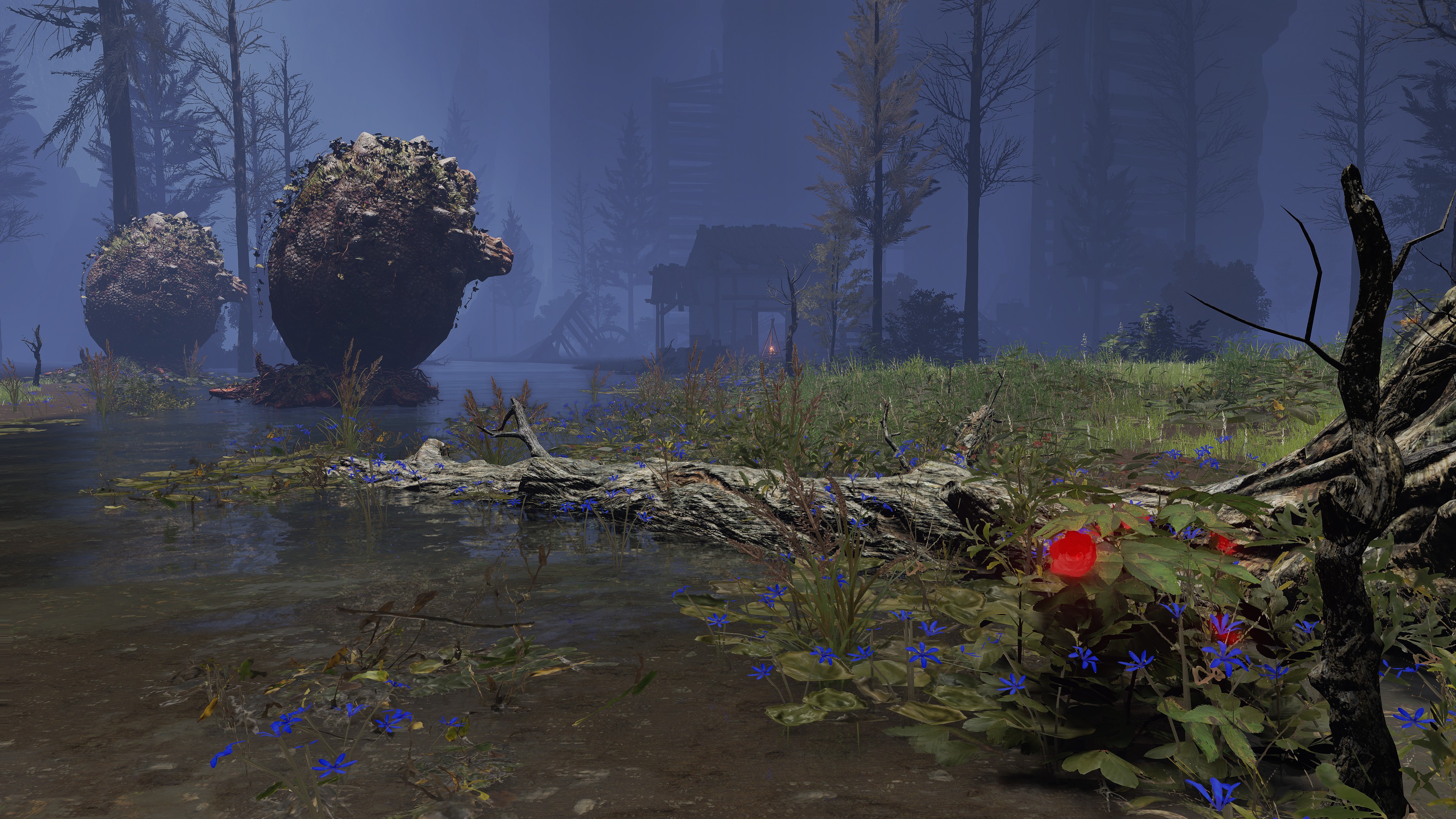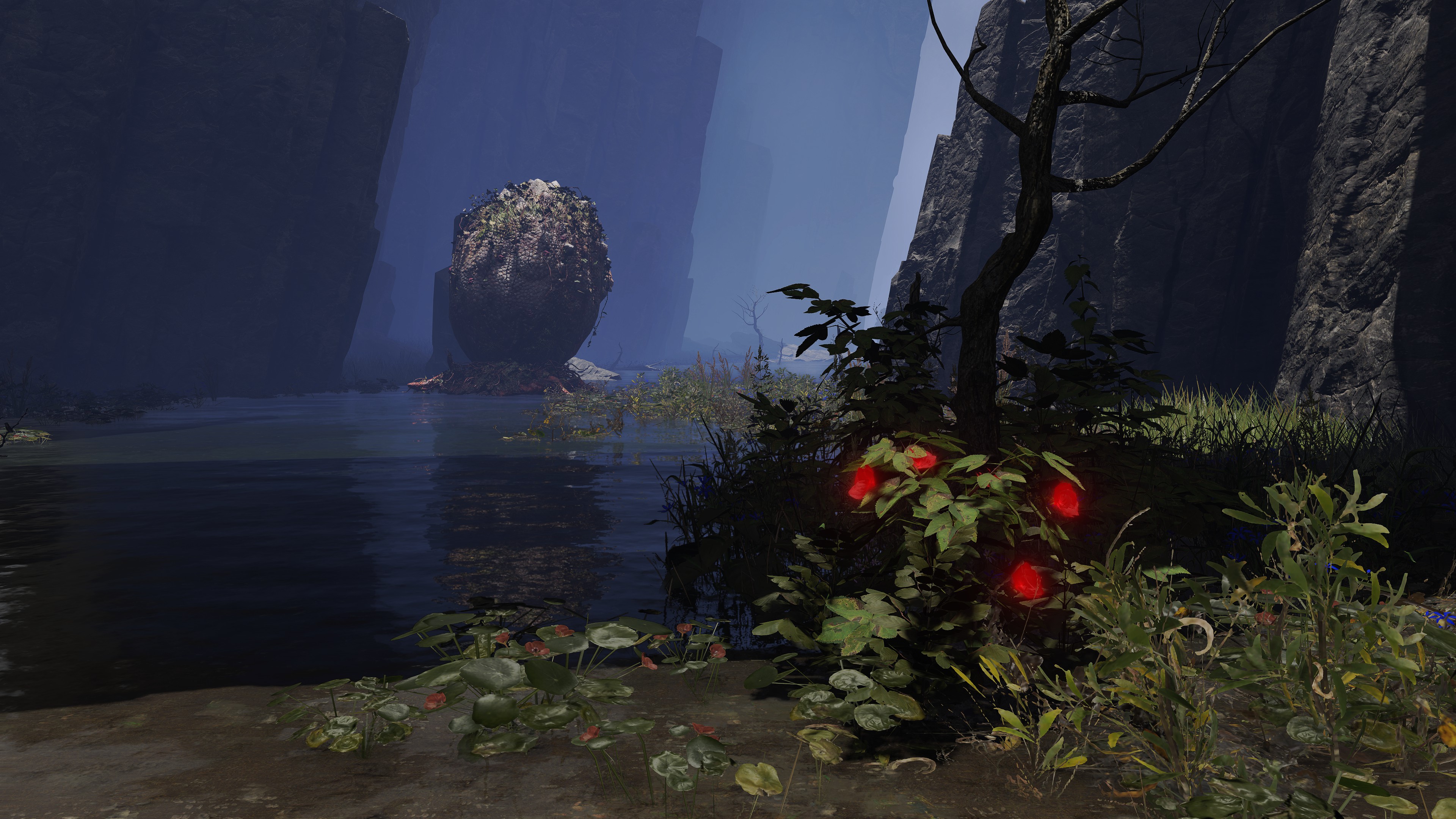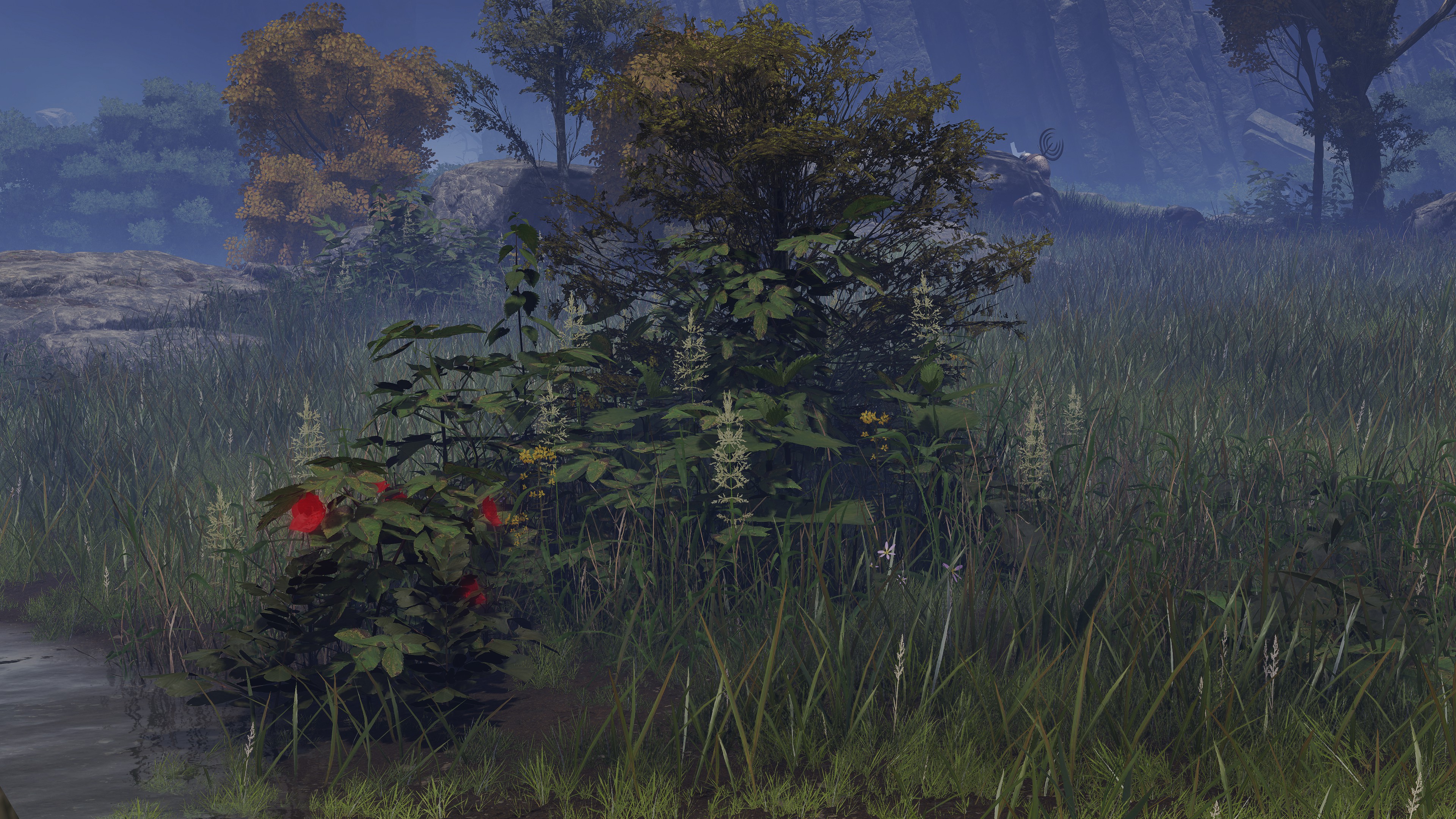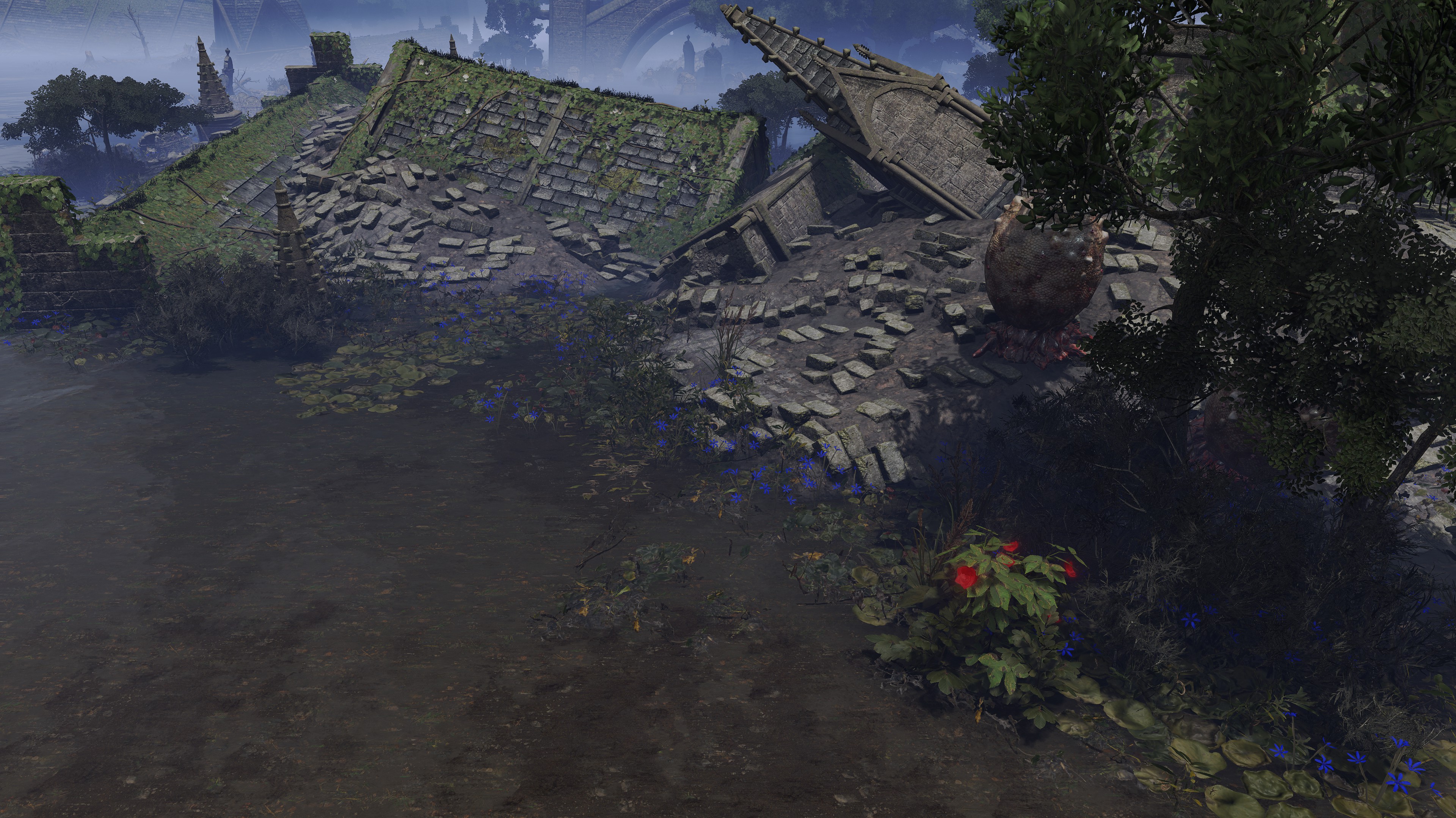 Smarag has taken the lead in retaliating. West of the Temple Quarter lies a forest of conifers. Unlike most other large trees in the lake, these look to be not just dead but burned, hence why they are still standing. The setup implies that, before the water washed in and drowned the land, someone set this small wood ablaze. Moreover, this incident looks to have killed a great many humans, attracting numerous land octopuses to lap up the bloodshed. Based on the location, it is possible that those who tried to escape the Albinaurics overrunning the Quarter were met with fiery death. And just a little further north, we see that Smarag has made the black-market trader’s island his roost, piling on bodies of would-be hunters — wise enough to bring dragonwound grease against a dragon, or foolish enough to throw hemorrhaging kukris at scale hide. Surrounded by glowing blue flowers and beetles rolling up grace, he rests on his “treasure” horde like Smaug, (スマウグ) the infamous dragon of The Hobbit who assuredly inspired his namesake. (スマラグ) It must thus be the sorcerer devourer plaguing this region.