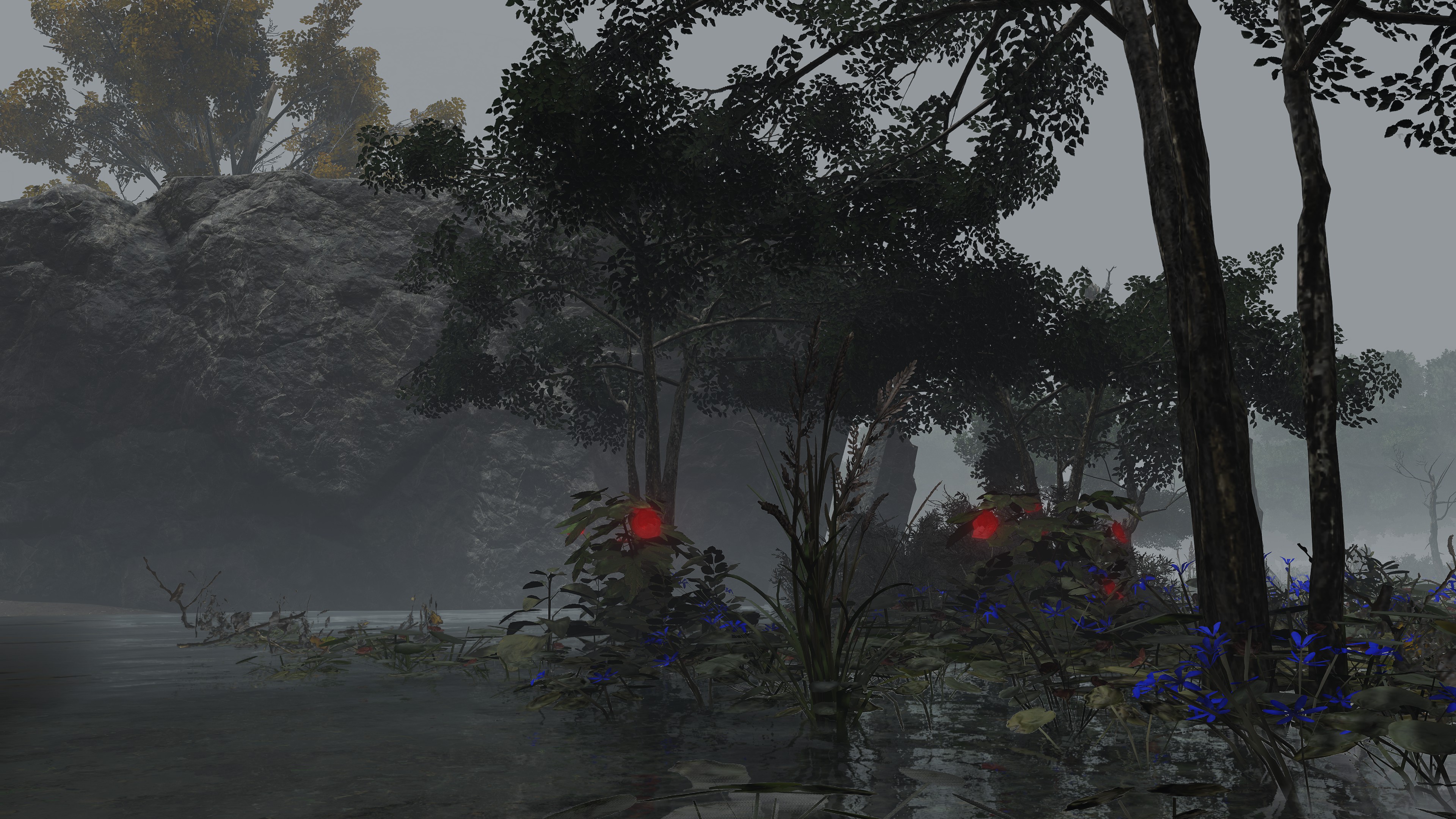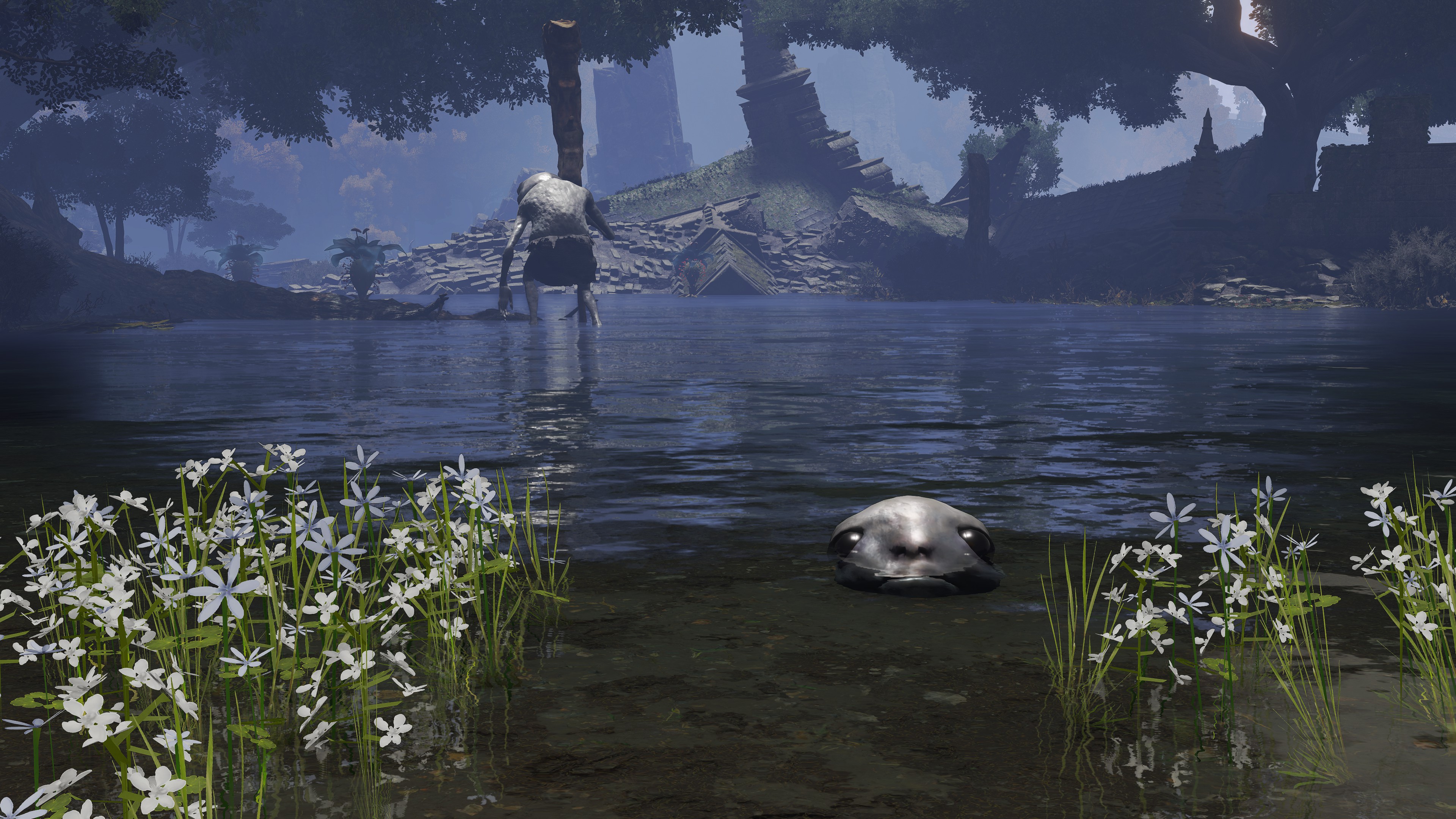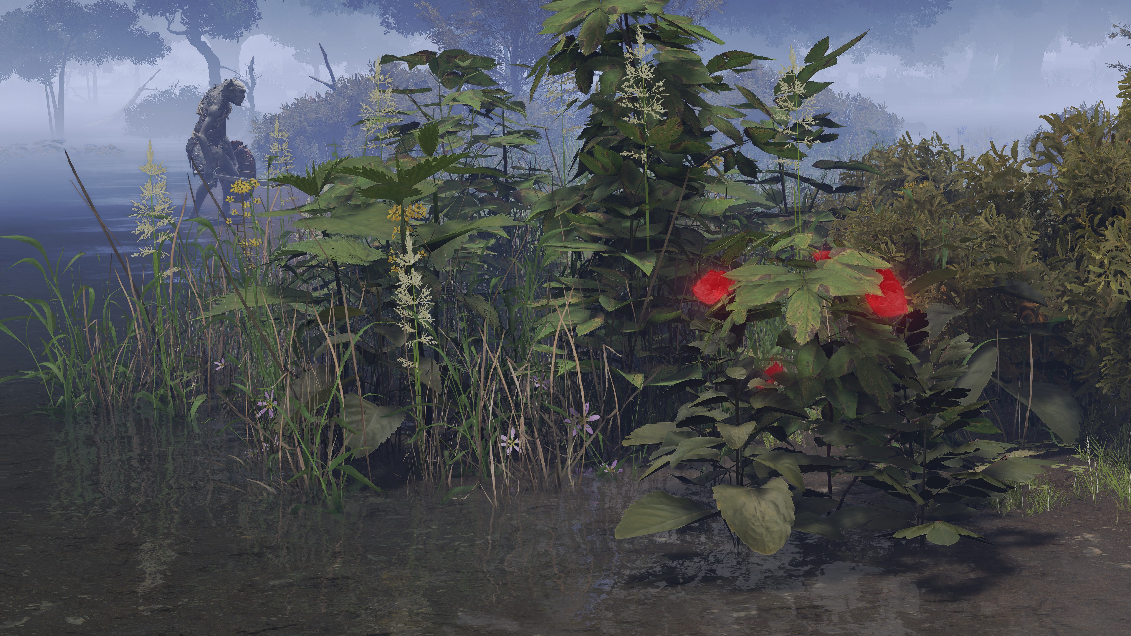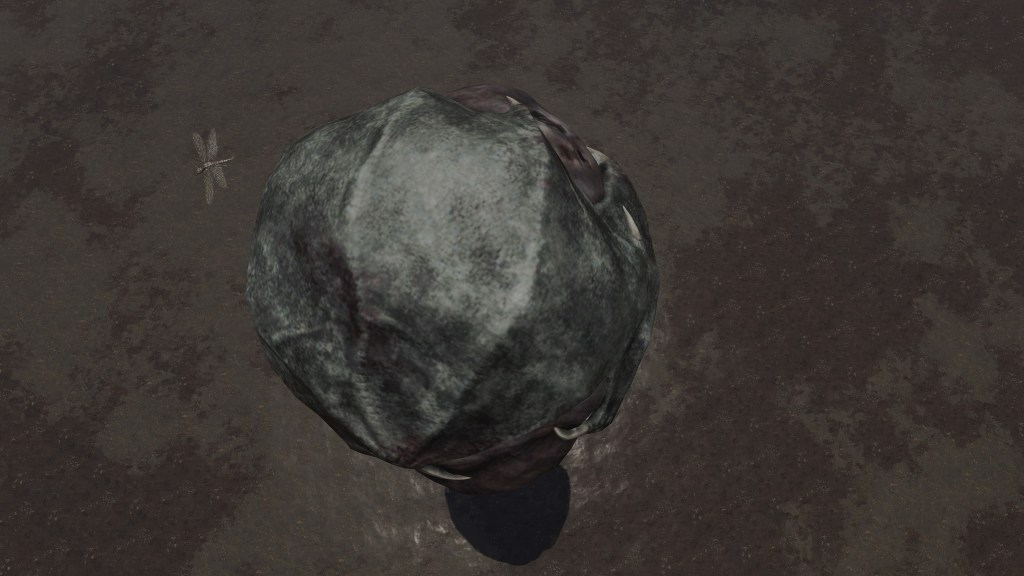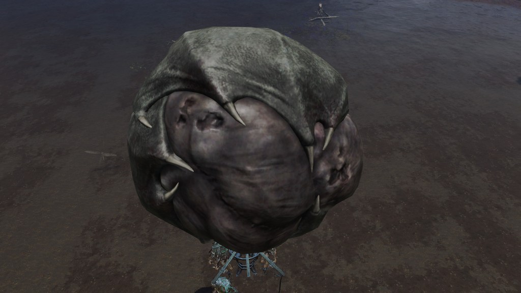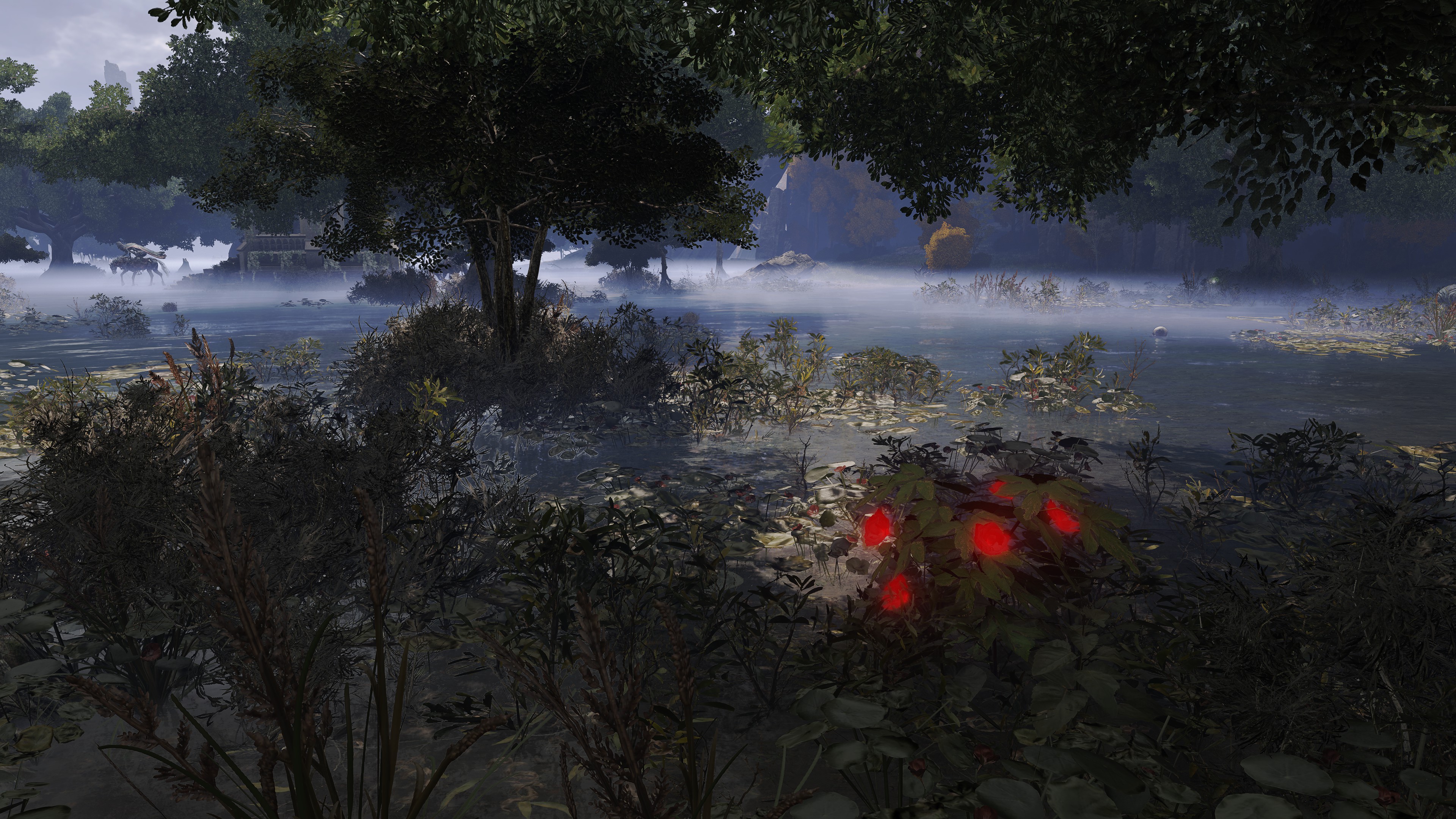 Smarag has taken the lead in retaliating. West of the Temple Quarter lies a forest of conifers. Unlike most other large trees in the lake, these look to be not just dead but burned, hence why they are still standing. The setup implies that, before the water washed in and drowned the land, someone set this small wood ablaze. Moreover, this incident looks to have killed a great many humans, attracting numerous land octopuses to lap up the bloodshed. Based on the location, it is possible that those who tried to escape the Albinaurics overrunning the Quarter were met with fiery death. And just a little further north, we see that Smarag has made the black-market trader’s island his roost, piling on bodies of would-be hunters — wise enough to bring dragonwound grease against a dragon, or foolish enough to throw hemorrhaging kukris at scale hide. Surrounded by glowing blue flowers and beetles rolling up grace, he rests on his “treasure” horde like Smaug, (スマウグ) the infamous dragon of The Hobbit who assuredly inspired his namesake. (スマラグ) It must thus be the sorcerer devourer plaguing this region.