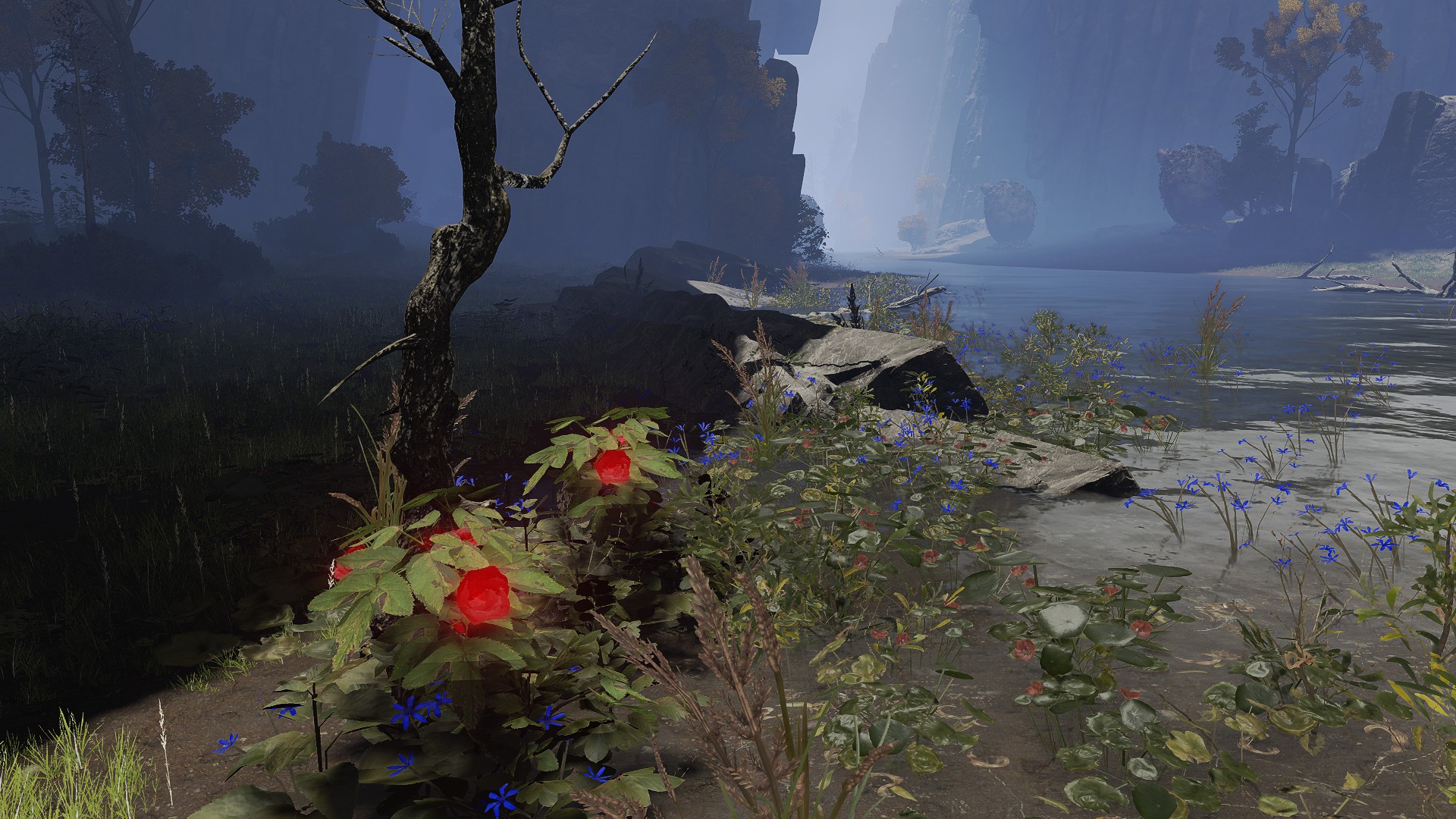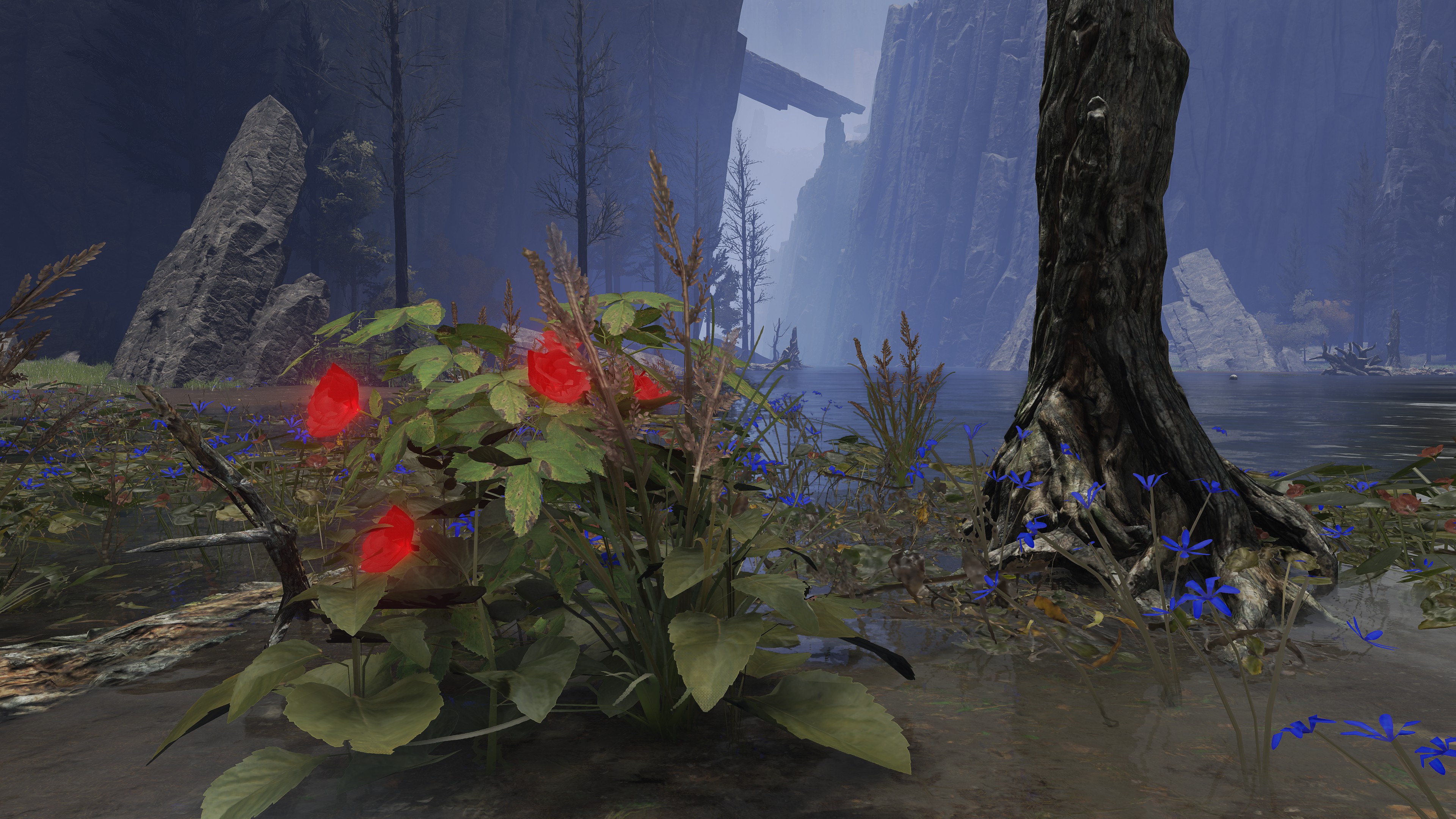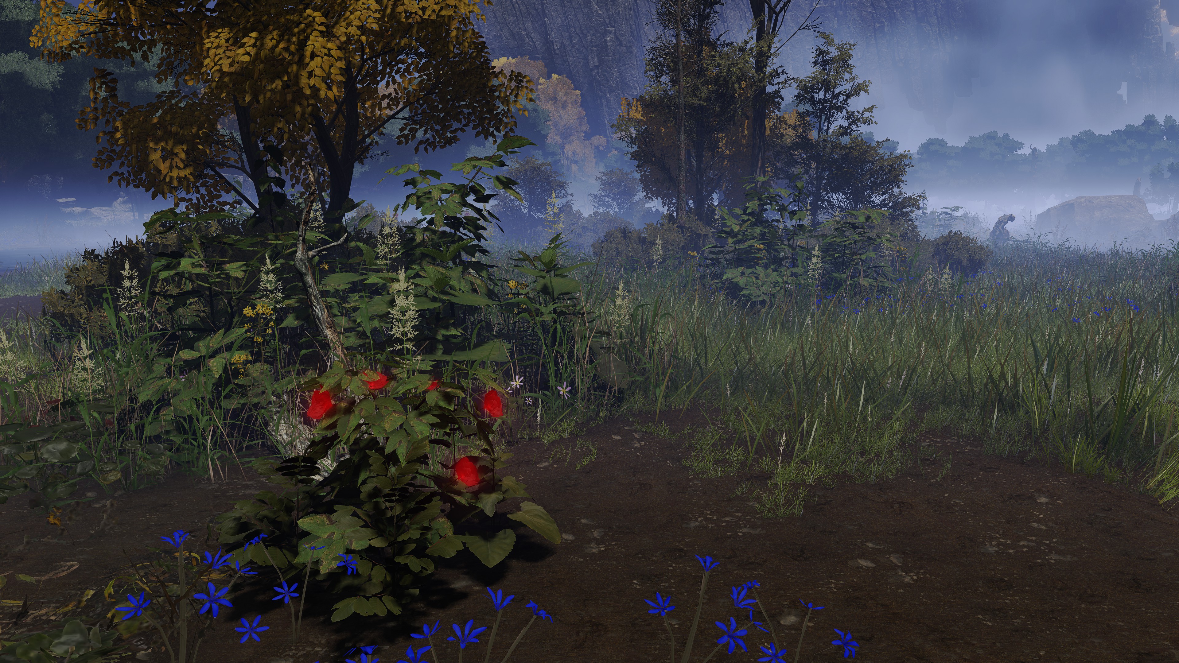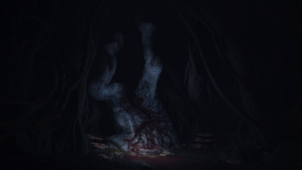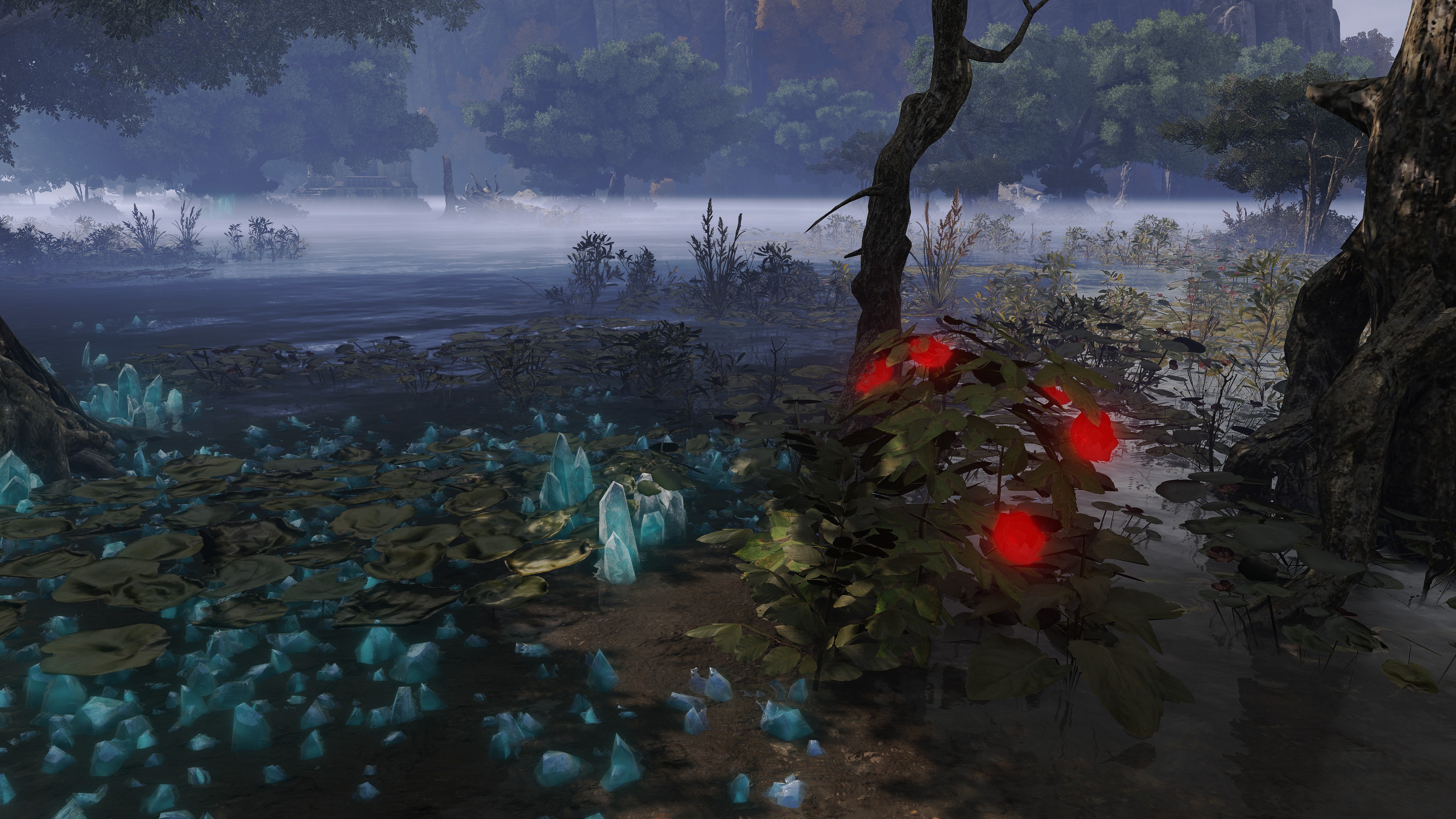 Smarag has taken the lead in retaliating. West of the Temple Quarter lies a forest of conifers. Unlike most other large trees in the lake, these look to be not just dead but burned, hence why they are still standing. The setup implies that, before the water washed in and drowned the land, someone set this small wood ablaze. Moreover, this incident looks to have killed a great many humans, attracting numerous land octopuses to lap up the bloodshed. Based on the location, it is possible that those who tried to escape the Albinaurics overrunning the Quarter were met with fiery death. And just a little further north, we see that Smarag has made the black-market trader’s island his roost, piling on bodies of would-be hunters — wise enough to bring dragonwound grease against a dragon, or foolish enough to throw hemorrhaging kukris at scale hide. Surrounded by glowing blue flowers and beetles rolling up grace, he rests on his “treasure” horde like Smaug, (スマウグ) the infamous dragon of The Hobbit who assuredly inspired his namesake. (スマラグ) It must thus be the sorcerer devourer plaguing this region.