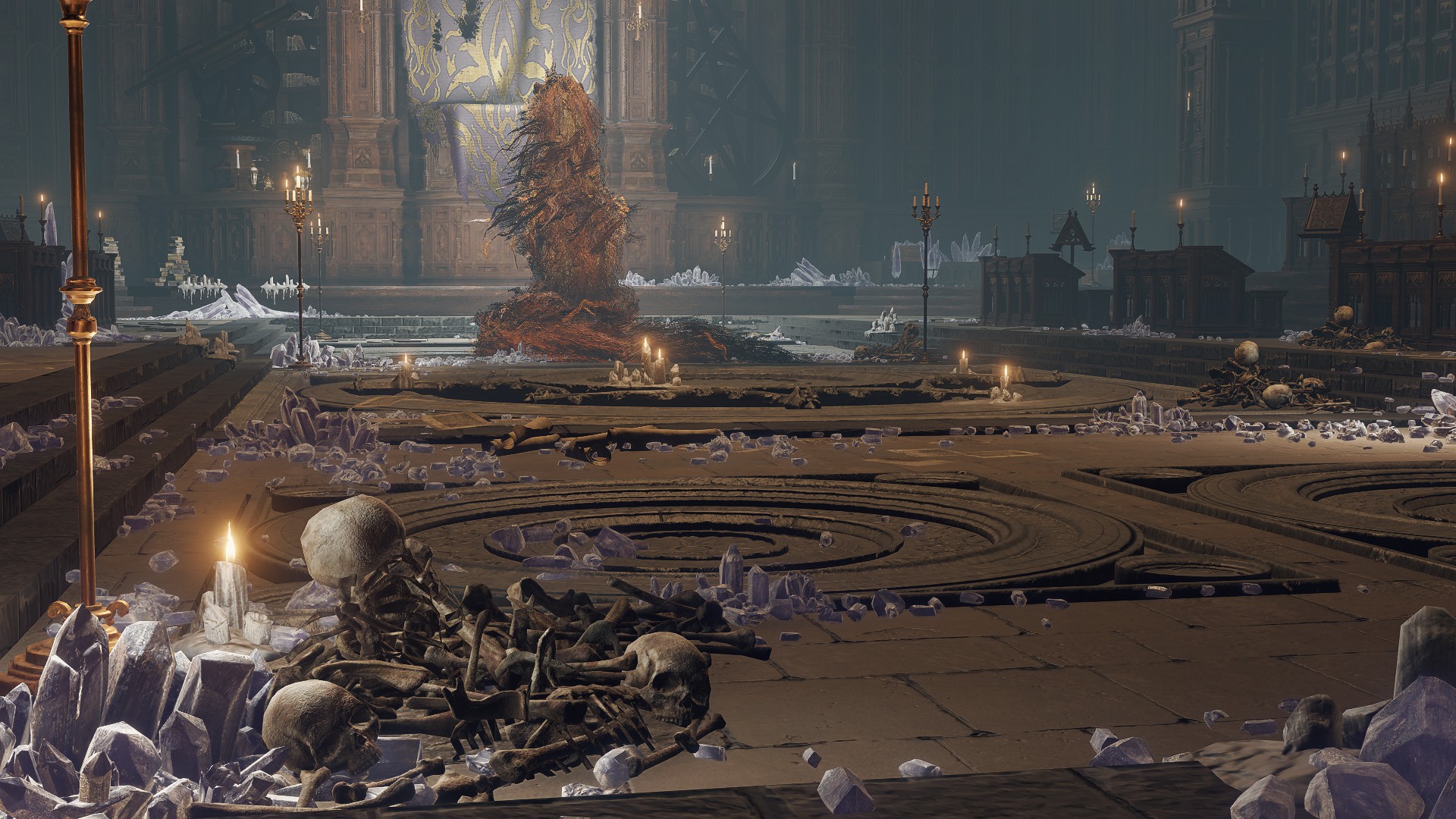 There was definitely a heated clash between the rebels and a mob of the Golden Order’s faithful, and the rebellion chose to escalate a civil matter to a violent purge. While the Altus citizens feel the injustice, it is impossible for an uprising to compromise on barring access to the enemy leader — what if someone were to try plotting something with the queen? This left the academy with no choice but to eradicate Radagon’s influence. Nowhere is this more obvious than with his pet, piles of human bones littering the Debate Parlor where the red wolf currently squats. The victims’ identities are easy to surmise, even without the memory received when the boss is defeated. The hostile beast evidently has never left its post, despite the sorcerers’ attempts to approach and presumably eliminate it. Although finishing the job has been unsuccessful, the message is clear: neither Queen Rennala nor King Radagon hold any sway anymore.