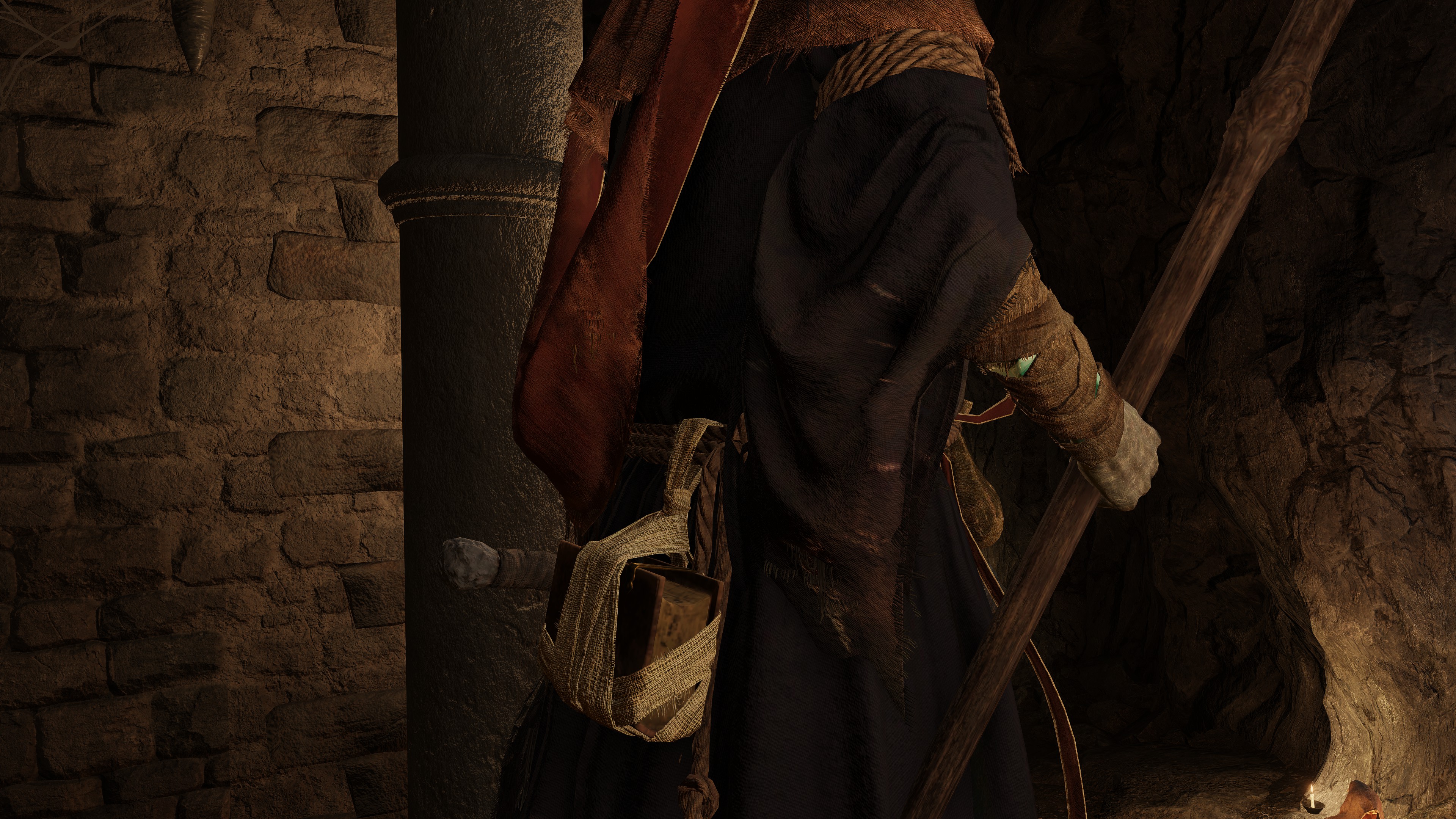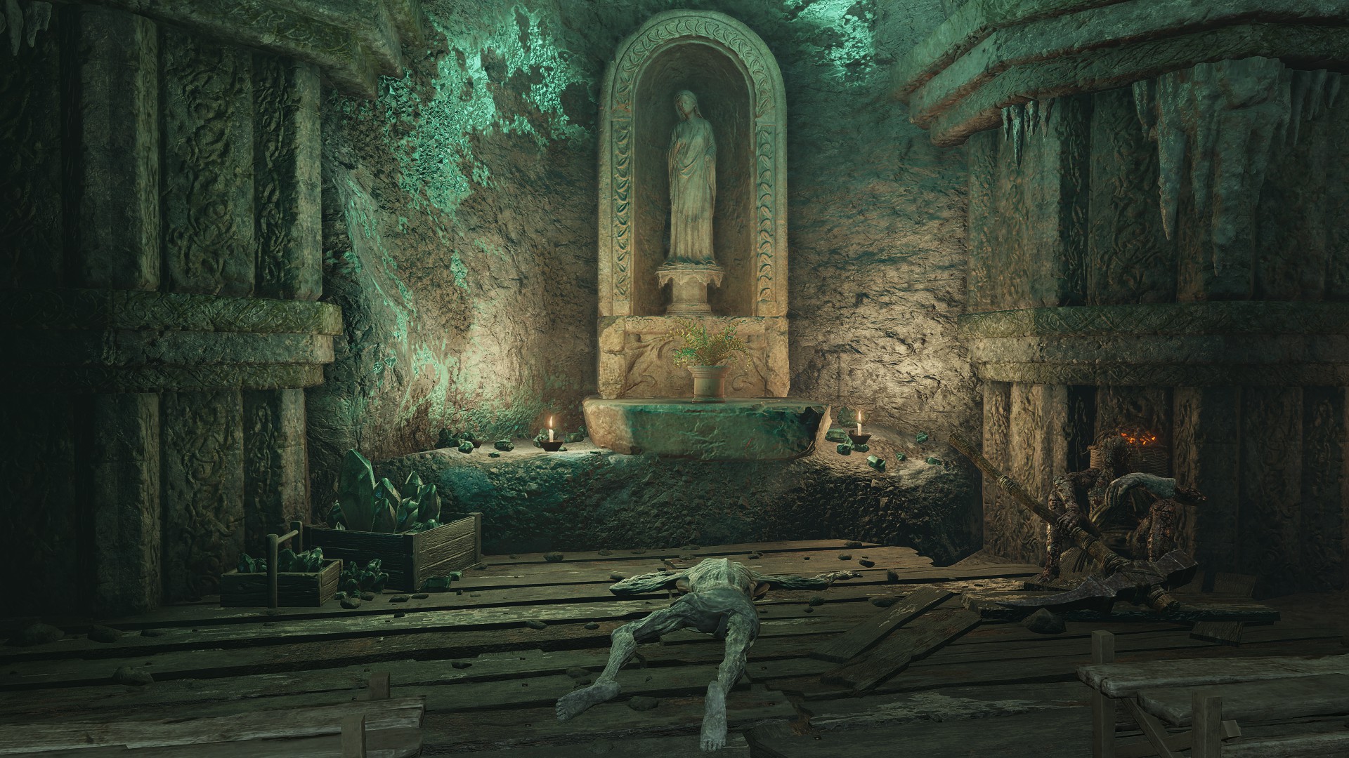 We can come across miners bringing resources up to these mercenaries from the Ruin-Strewn Precipice. The workers tirelessly excavate the Ancient Civilization’s ruins for crystal, their one reprieve during prayer service. And as we can see from the shrine, there is a potted plant beneath the female idol in contrast to the shrine in Raya Lucaria Crystal Tunnel. The additional nature association hints that it is dedicated to Marika, not Rennala, and the corpse with a rune arc laying before the effigy only reinforces that impression. Whether at Morgott’s command or by his patronage, the Cuckoos are managing their side of the old mine for Leyndell and taking first pick of the yield, which would include the occasional gold smithing stone found on local bodies. Considering how the academy still hoards the gems in Liurnia’s other mine, the Grace King is already proving to be far more generous an employer, which shouldn’t be lost on the Cuckoos. At the same time, they are still reprobates, and haven’t been the most attentive caretakers.