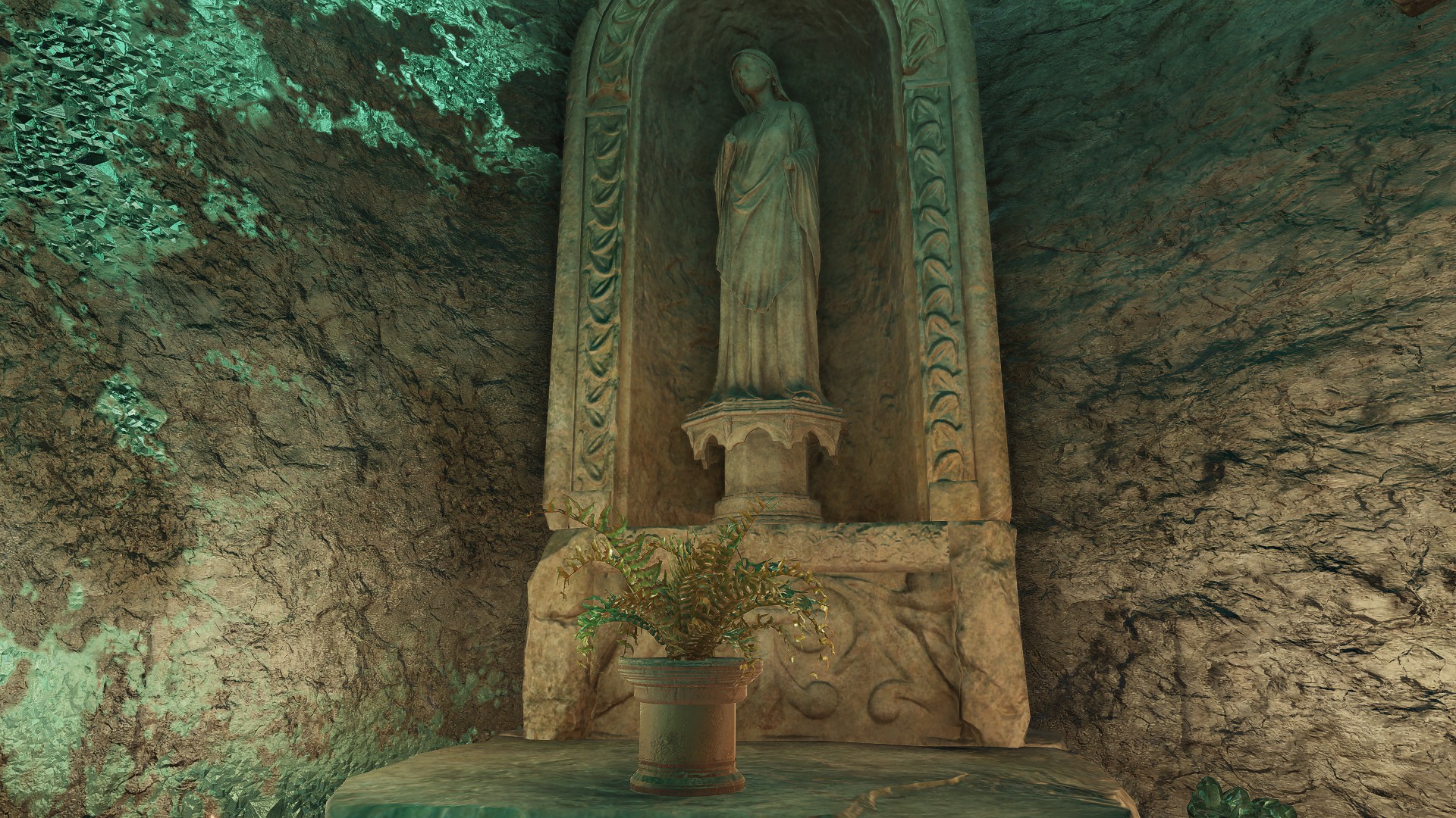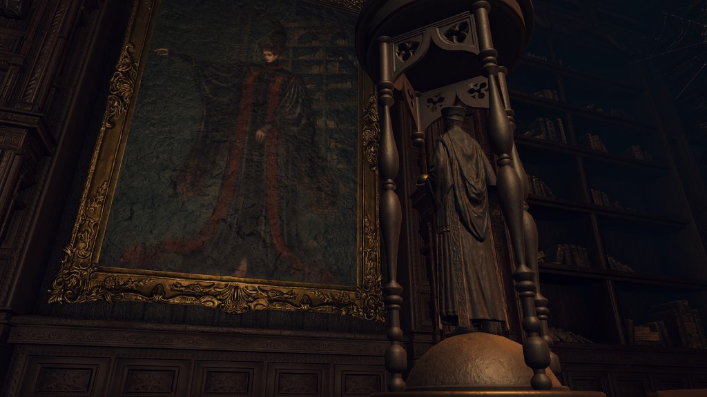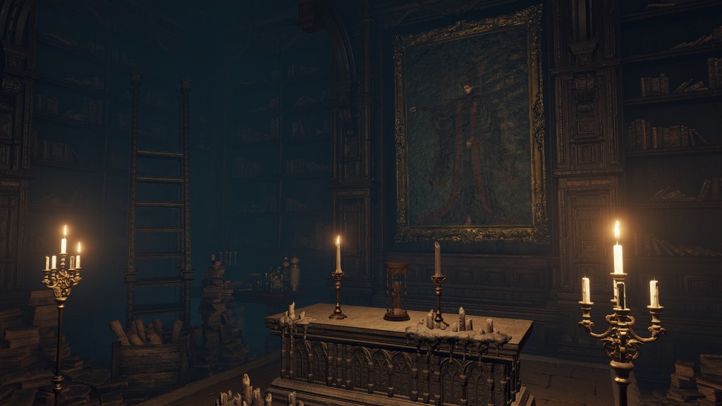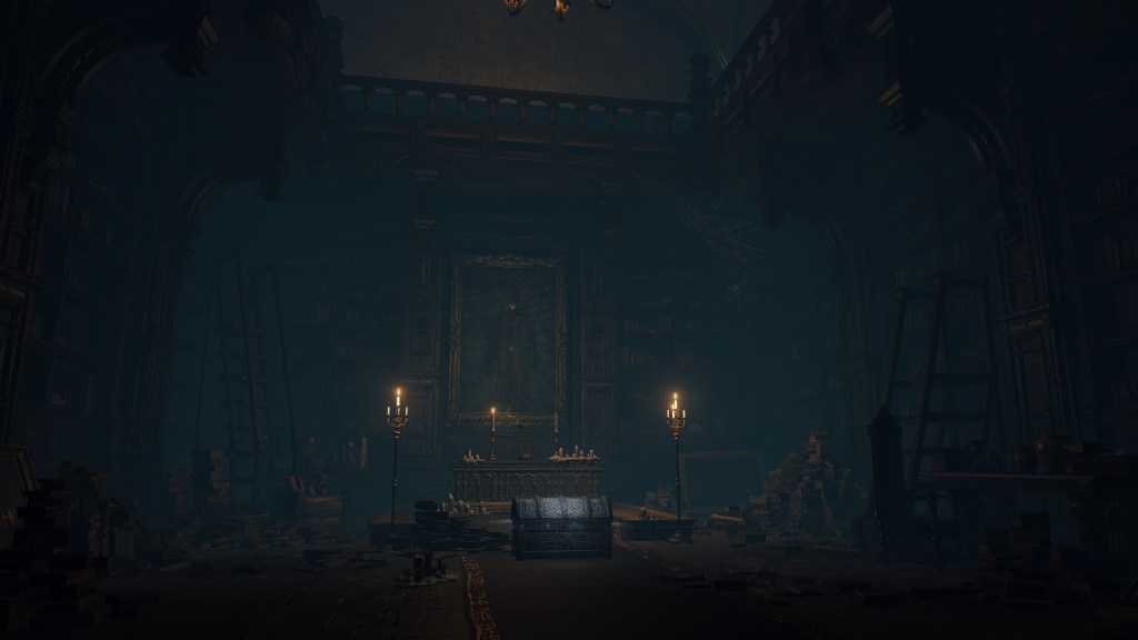 Such violence was likely employed against any academy member who remained a staunch advocate for the Carians as well. We know that they exist because of the secret shrine in Raya Lucaria. Said shrine looks like it was once just an obscure archive, used to store away spare portraits alongside excess books. Since then, however, it has been furnished with an altar for another small scholar statue; this time, facing the same full-length portrait of the Full Moon Queen hanging in the stairwell just outside the chamber. The preceding chest containing the text for Comet suggests the Karolos Conspectus’ participation in this Rennala worship. That comes as no surprise, since she is the sole person to showcase a spell equivalent to Comet Azur, which their founder only developed after she banished him. It is easy to see why some in Azur’s class might view her as the superior sorcerer. However, the shrine remains hidden behind an illusory wall, meaning that worshipers didn’t feel safe to practice openly at the time. We can therefore determine that this cultish practice only began following the rebellion.