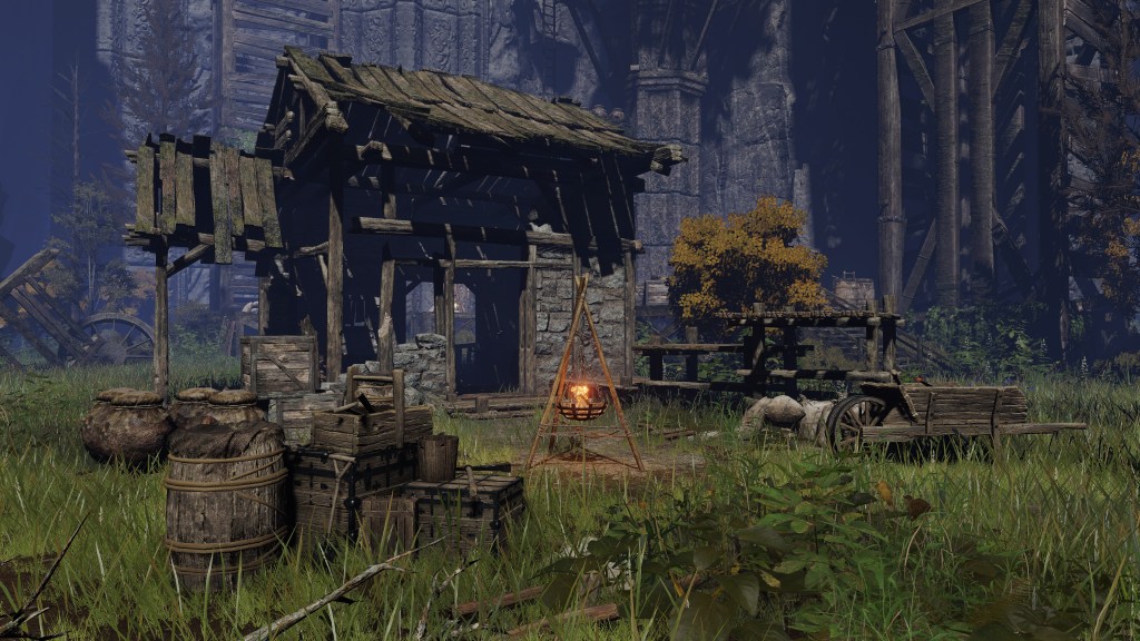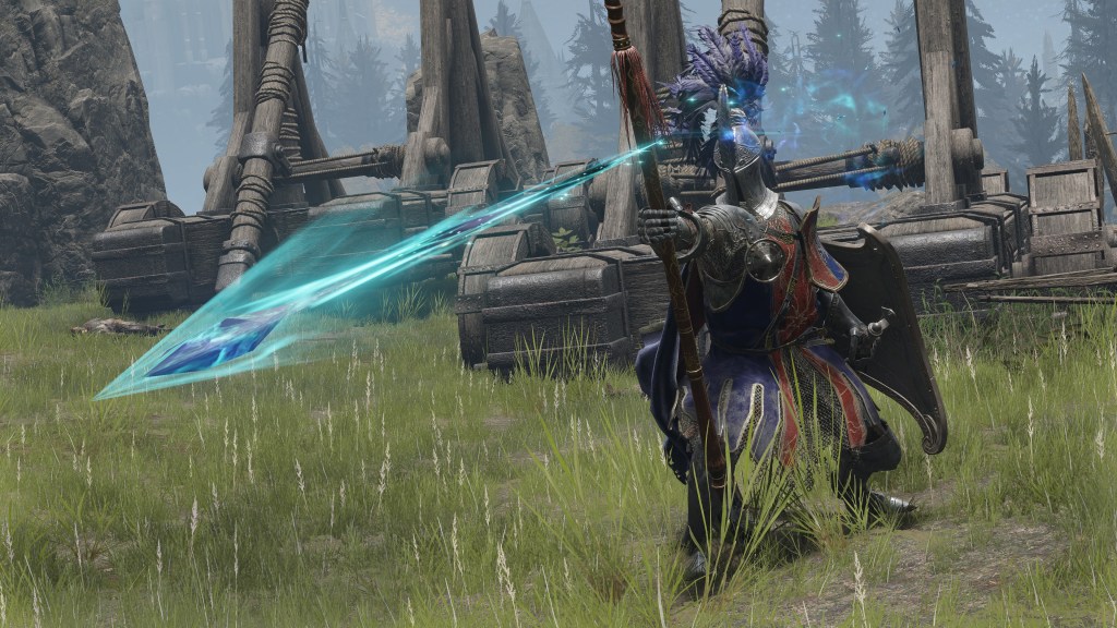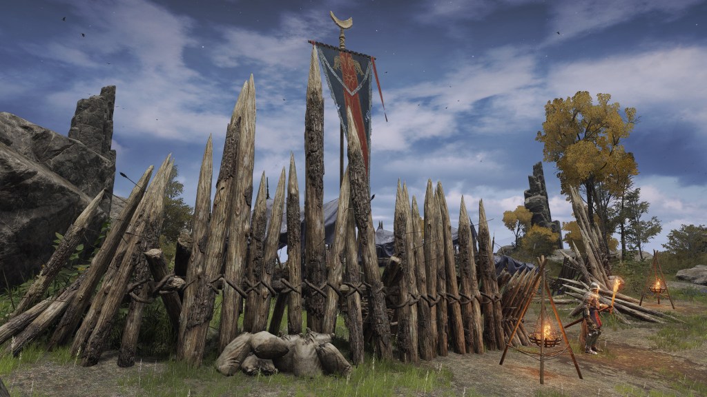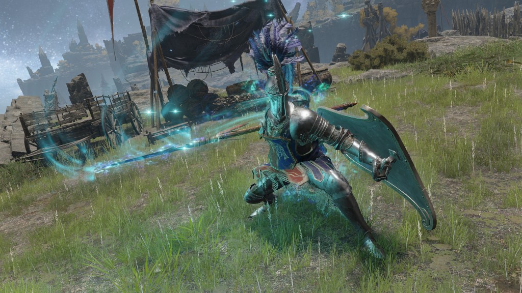 Because they couldn’t use Raya Lucaria as their headquarters, the Cuckoos appear to have instead set up base in the Academy Gate Town. The town center by the west gate harbors the most robust defenses, and a chest in the ruined portions stores the cookbook for magic pots and shield grease. Basing themselves in the settlement closest to the academy was the sensible decision to make, positioning them best to both fulfill their contract and receive payment. From the foot of Raya Lucaria, the Cuckoos would send out their members wherever needed to shore up defenses along the highways north and south. It may have taken time to get them battle ready, between equipping and training the army. But before the Shattering had concluded, the academy acquired the means to defend itself from would-be occupiers. The troops finally had their first test with the arrival of the next demigod.
