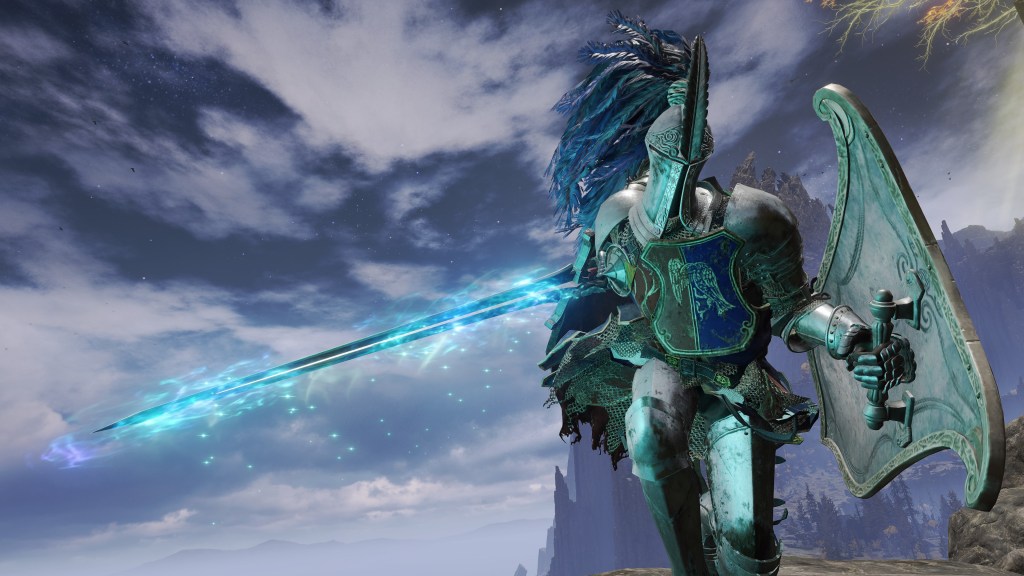 The academy’s forces don the colors of the sorcerers they serve, illustrated with their same iconography — the school’s crest, the pattern on the scholars’ stoles, the stars, and of course, the peering cuckoo. Indeed, their alias is the Cuckoos, a name they embraced for themselves. Not only is the bird emblazoned on the surcoats or breastplates, its feather ornaments their helmed brows; knights go even further with blue plumage for the back. Why identify with the bird specifically? Because as depicted on the knights’ greatshield and the soldiers’ surcoat, the cuckoo is peering at the “prosperity” of glintstone, a star overflowing with power. The surcoat’s description notes the transience of flesh for glintstone sorcerers, which only the Cuckoos know and watch over. This is true in the sense that the army recognizes the scholars’ frailty and so protect them. However, it also applies to the warriors themselves, eyes fixed on lasting power surpassing their mortal frames. That grabs the Cuckoos’ attention. When it comes to contracting them out as sellswords, Raya Lucaria had one thing to offer, and that was sorcery.