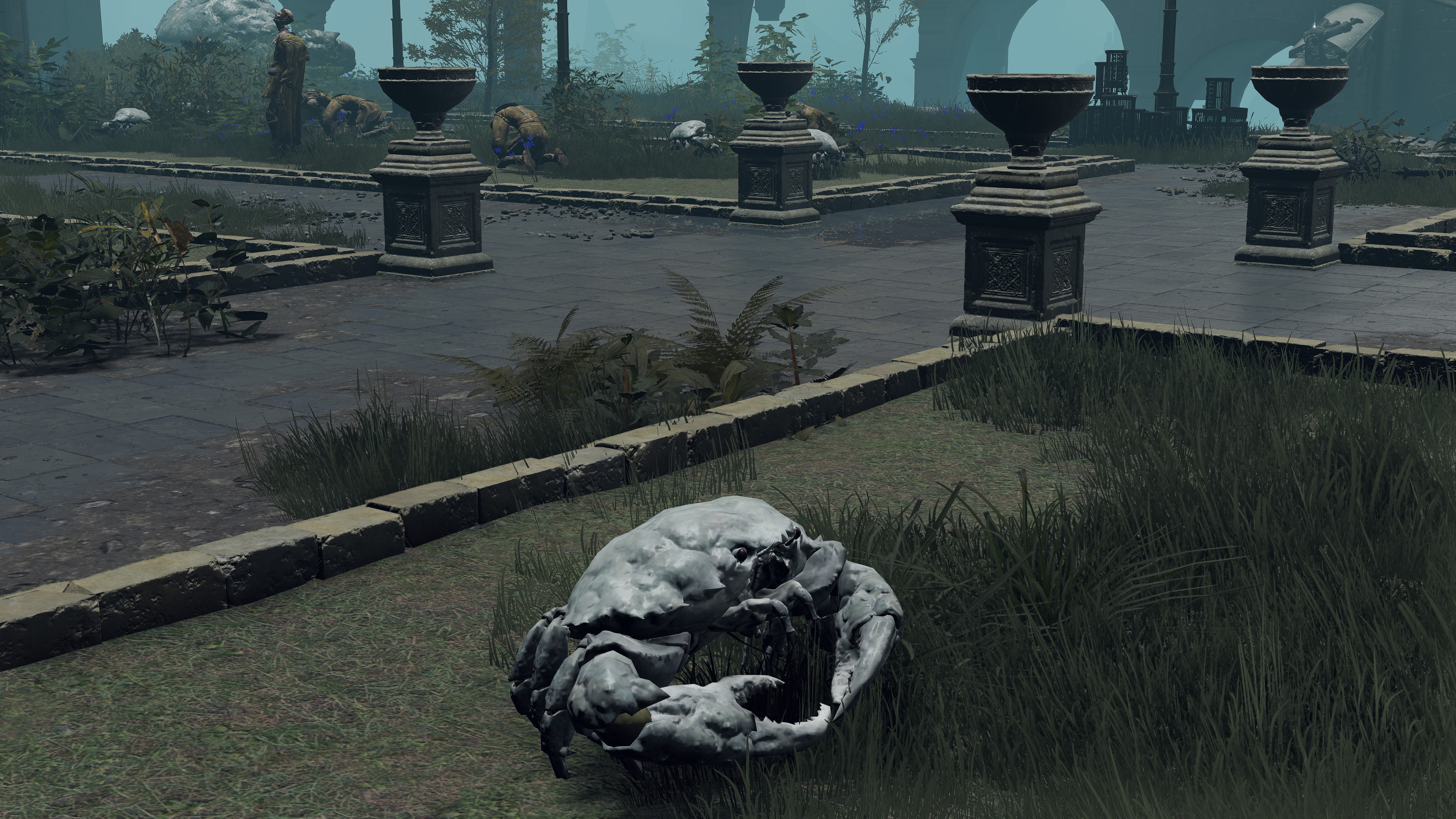 The Cuckoos are spread wider than the submerged town, and neither they nor the academy have sat idly by as they lost ground. While sorcerers like Thops were locked out by the seal, select scholars still come and go as they please. One Karolos sorcerer has started a black market trading glintstone keys on a lake island west of the academy — a yearning noble in front of the south gate even obtained a crude map of the meeting place. Information is getting around, opening access to higher learning if you know the right people. Some of those people’s only interest is collecting specimens to study, a handful of silver crabs emerging in the waters of Albinauric territory seen lurking around the academy’s garden and elsewhere; two have even been infused with glintstone, their mineral shells having the makings of Glintstone Crowns as looting their corpses indicate. Others with soft spots for dogs might be picking up the strays we see dwelling in the academy graveyard. Scholars are definitely leveraging the war for personal gain, but not everyone simply slinks back to their hole while refusing to help.