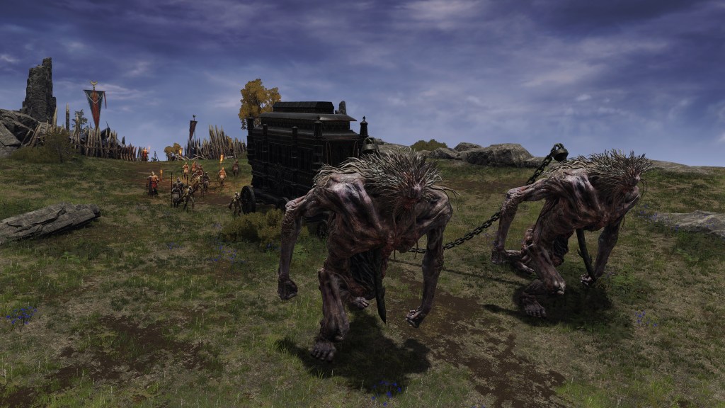 Suffice to say, the academy has done its part for the war effort. As for the actual army, the Cuckoos’ encampment between the Albinauric Village and Caria Manor stands strong. Despite sustaining damage from both sides, nobles feel safe to bring their dogs to this warzone, foot soldiers escorting a few of these aristocrats as they raid a passing cart nearby. Admittedly, maintaining one position is arguably the bare minimum, and the Cuckoos prove how easily circumstances can flip. Over on the east end, foot soldiers instead raid a noble’s camp and seize his dogs, one of them saddled with taking the two pedigrees for a walk. We can also see a group of nobles stare at Liurnia’s Divine Tower en route. Maybe they somehow got word of where to find Ranni’s body. Either way, attempts to claim the Carian Study Hall for Raya Lucaria have ended in failure. Miriam commands a myriad of nobles and Cuckoo soldiers as puppets. Even isolated from the royalty, the preceptor continues to do her job as the hall’s custodian, leaving the academy with another losing front. They are trying, but not always succeeding.