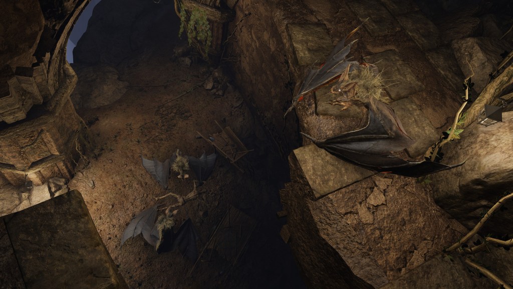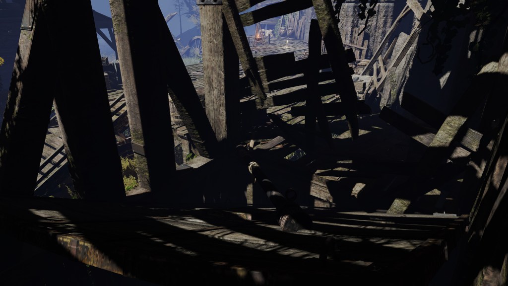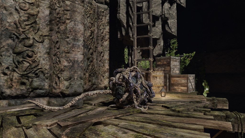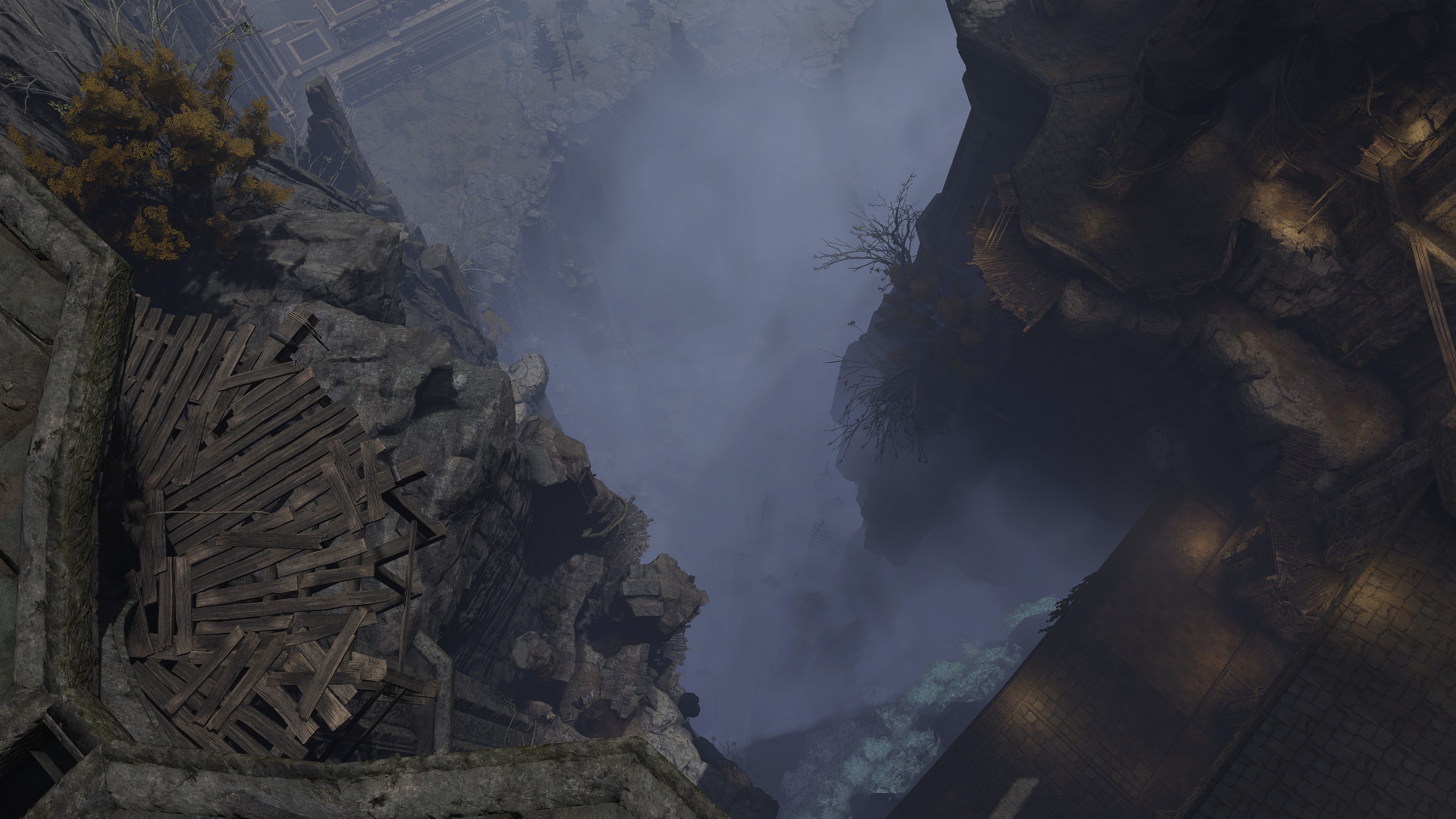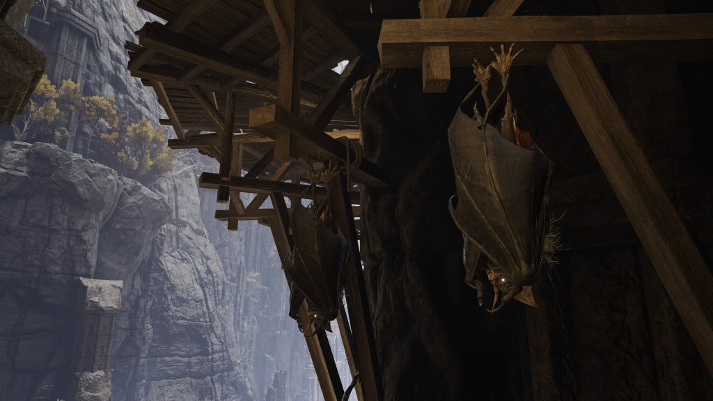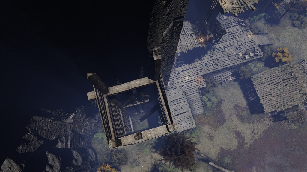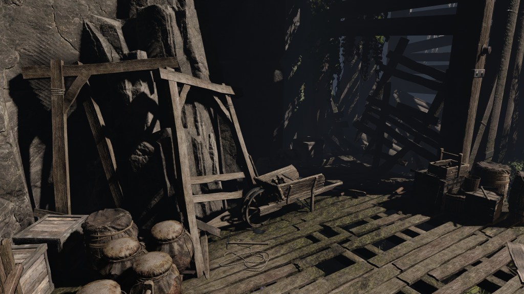At the foot of the Precipice mine is supposed to be a village. However, it is a Ravine-Veiled “Village” with only one derelict building. It isn’t the only part left dilapidated. We must ascend ladders and platforms to head inside the mine, but there was originally a lift, whose infrastructure has since collapsed. This led to construction of a second lift, which we also see in pieces. But this lift was never completed past the shaft frame before its destruction. Combined with the derelict shack, and the scenario at hand is obvious. The village was established but never finished construction; the builders left before they had proper homes. It is no mystery why. The ravine holds little space, even ignoring the river’s flooding, and priority went to constructing the mine infrastructure across the Precipice. On top of that, the shadowy valley is rife with hungry bats and octopuses, who will climb the sheer cliff for a bite. Even Makar, hiding in the ruins, is leaving a litter of bones. Creating a settlement to support the mine was almost as hazardous as the mining itself. Eventually, the settlers gave up.