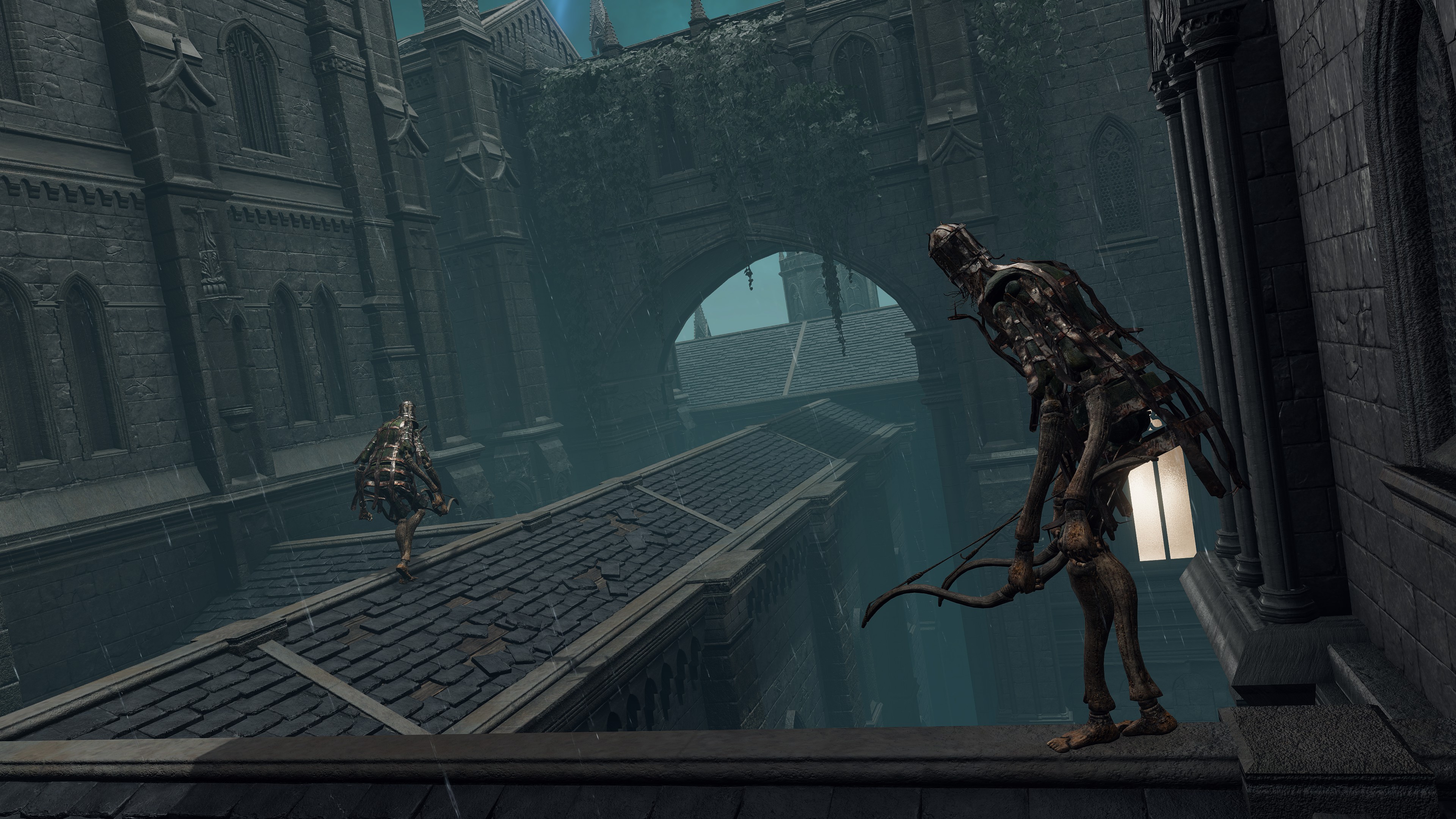 Nonetheless, the academy is inhibiting visitors from accessing the Grand Library, such as with the rolling ball trap set up over the main stairway leading to the archive. Actions like this were sure to annoy those loyal to Radagon and the Golden Order when Rennala was ostensibly doing important work on his behalf, and that would create friction. In fairness, plenty of sorcery hopefuls look to have betrayed their noble lineages to side with the academy, digging for power in their gardens. But the damage to the gardens implies that not everyone was willing to forsake Erdtree royalty. Indeed, one noble corpse with gold smithing stone lays at the destroyed end to the aforementioned stairway. Another with the rune of Altus citizens, closer to the library, looks to have tried hiding on the rooftops beneath a balcony, to no avail. And while there are no signs of bodies or wreckage on the ground far below the ruined staircase and gardens, there are bell ringers calling forth rancorous wraiths. Taken together, those still loyal to the Erdtree heartland tried to protest and were faced with overwhelming force in response.