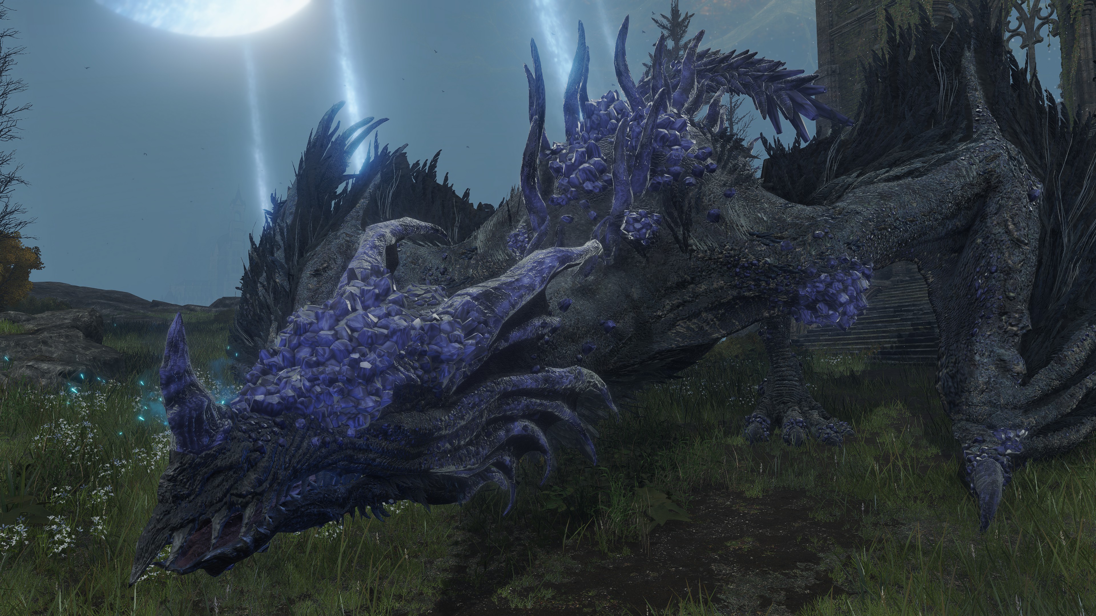 However, Smarag is alone in bringing the fight to the academics at the moment. Both the moon citizen and noble settlements have been reduced to rubble, the wraith callers since moving into the latter. This suggests sudden and awful deaths for the original residents, and the perpetrators are evident from the group of glintstone dragons loitering next to the ruin area. They were no doubt the sorcerers those dragons had been eating. Some were spared that fate, perhaps thanks to their invisibility spells. In the chaos, these surviving aristocrats seemingly fled their lunar estates for sanctuary amongst their menials, only to find them all already dead — now, those nobles lower themselves to hide in the common people’s derelict homes, setting up landmines in anticipation of another attack. Their presence has kept the bell ringers out, and the wyverns aren’t curious enough to check for stragglers. But without question, the glintstone dragons are responsible for destroying civilization on the Moonlight Altar.