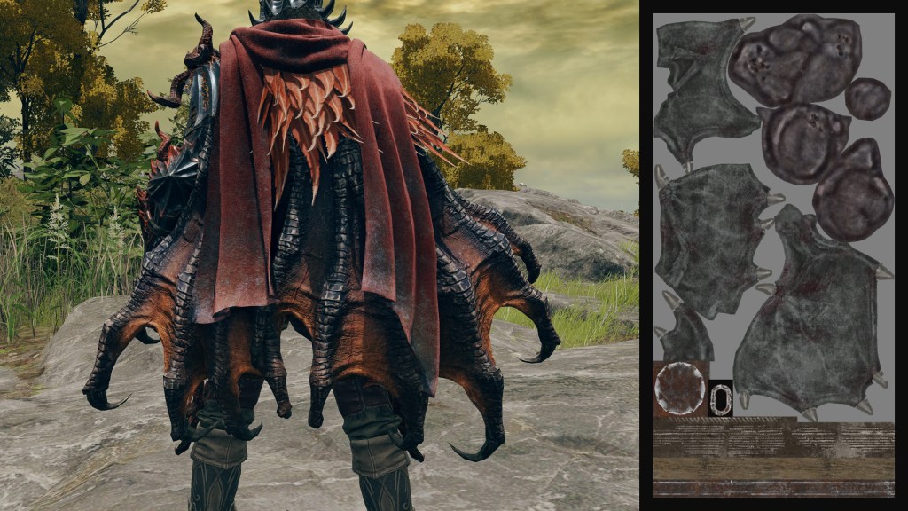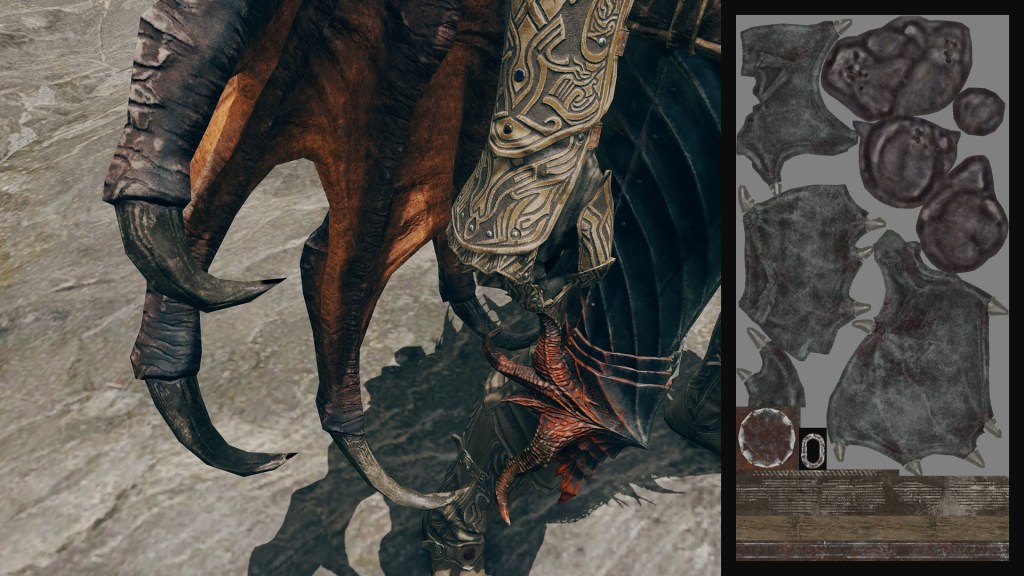 If these are all their balloons, then it might explain local dragons more recently devouring sorcerers. The balloon envelope sews together a bunch of dark grey wings, similar in color to the standard wyvern. These wings are smaller than those of the dragons we face, but also larger than any other creature with membrane wings, like the giant bats. And unlike said bat wings, these have thick bony talons at the tip of each finger. None of the typical wyverns possess this feature either, but we do see similar examples with Bayle and Drake Knight Armor. In all likelihood, the balloon was designed without referencing any specific enemy, in which case the concept is overall more evocative of the generic fantasy dragon. This would also be consistent with the Heretical Rise, the only other location to feature these balloons, over on the Mountaintops of the Giants where dragons like Borealis were being hunted down. It appears as if the academy has likewise been hunting lesser dragons for their war effort, a great many from the number of wings harvested. That would inevitably provoke a response.