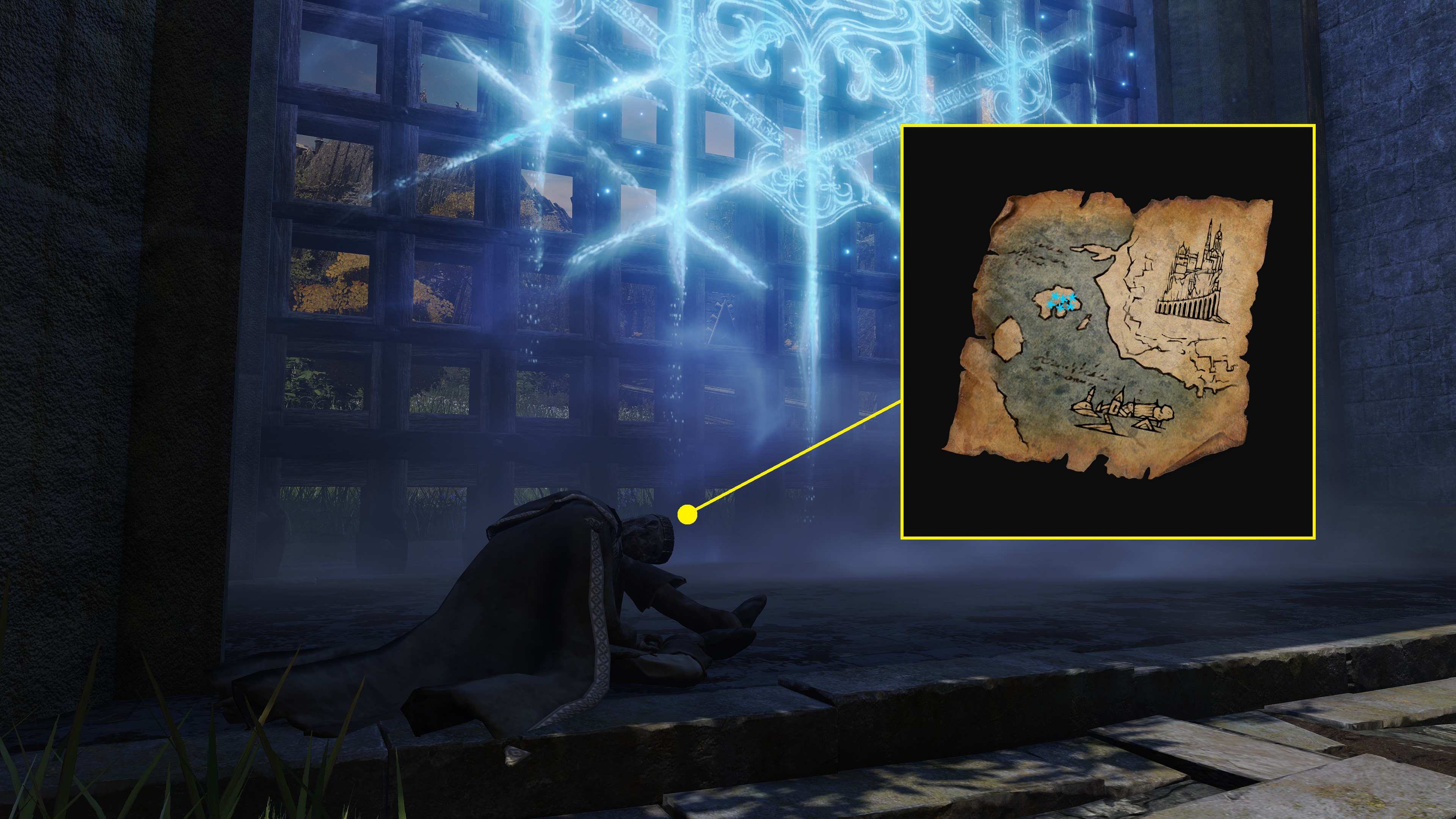 Among the crystals for study, the dedicated research tables on the tower’s bottom floor include at least one Cuckoo Glintstone for us to loot. The corpse hiding behind the tower likewise carries magic grease. Both are craftable with the academy artisans’ recipes, the glintstone requiring just crystal buds and cracked crystals while the grease needs only the buds and root resin. Perhaps Raya Lucaria caught word of a sorcerer who venerated both Rennala and Marika, reverse-engineering their work. If they felt threatened by the sorcerer spoiling their monopoly of faux sorcery to pay their mercenaries, then it would justify sending balloons with marionettes, the sorcerer popping all but one before trying, and failing, to hide. Learning about this convert is also feasible with what sorcerers step outside aside from Haima.