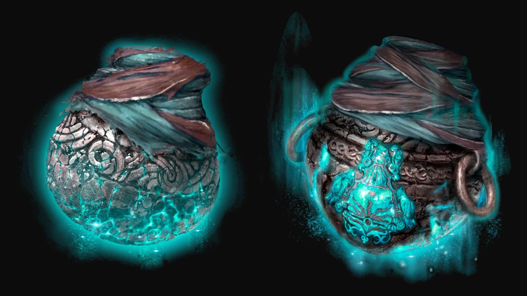 All told, the Defense of Caria Manor was a triumph for the royal family and another humiliation for Raya Lucaria’s sorcery knights. However, the fire of rebellion had not been squelched. The academy refused to surrender with this setback, plunging Liurnia into its own civil war. If the manor was untouchable for now, then the solution was to change tactics. Instead of attacking Caria directly, Raya Lucaria aimed to slowly strangle the family by cutting off support. Chief target in the royals’ western territory would be the Moonlight Altar — and standing in their way was the Village of the Albinaurics. As former Erdtree militants, the Cuckoos had no love for the silver life created by man. One of the academy’s craftsmen recorded the recipe for the Albinauric Pot, the vessel nonetheless applied with Cuckoo sorcery as shown by their crest on it versus the school’s sigil when thrown. In other words, the knights invented the tool themselves, its utility to prevent healing with drops of grace proudly showcasing the corruption inherent to the unblessed race’s blood. Raya Lucaria’s army must have been enthused to bring war to this innocent village.