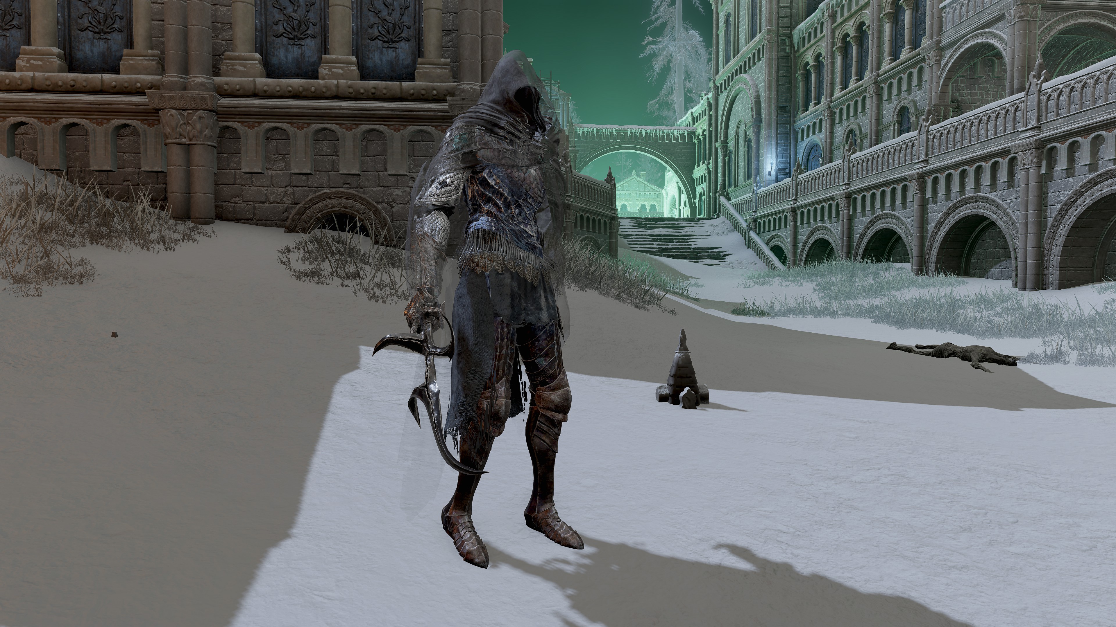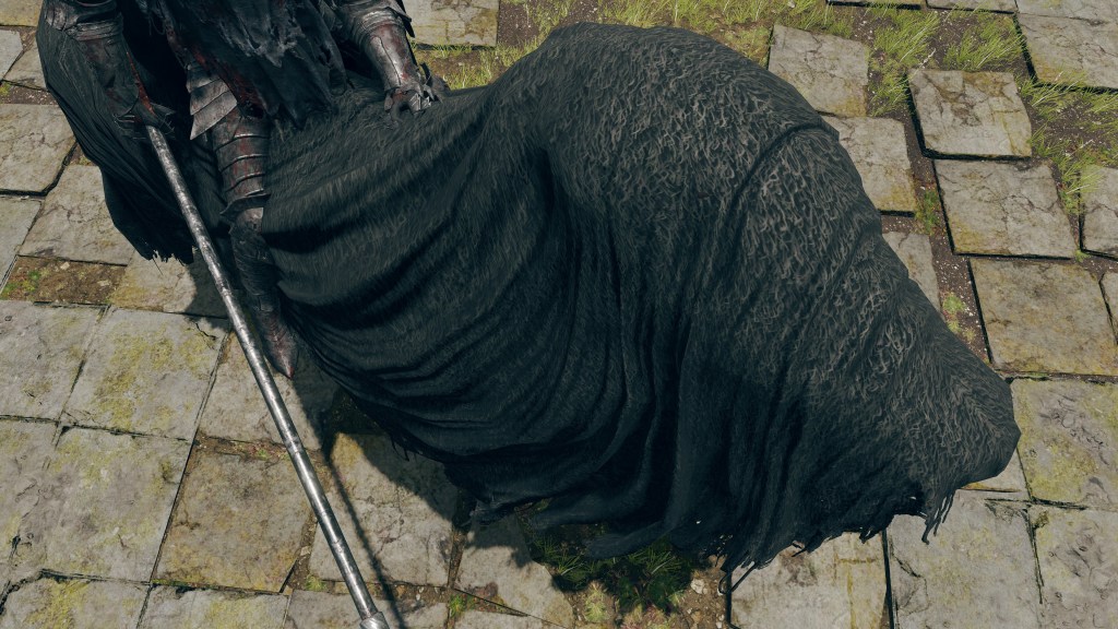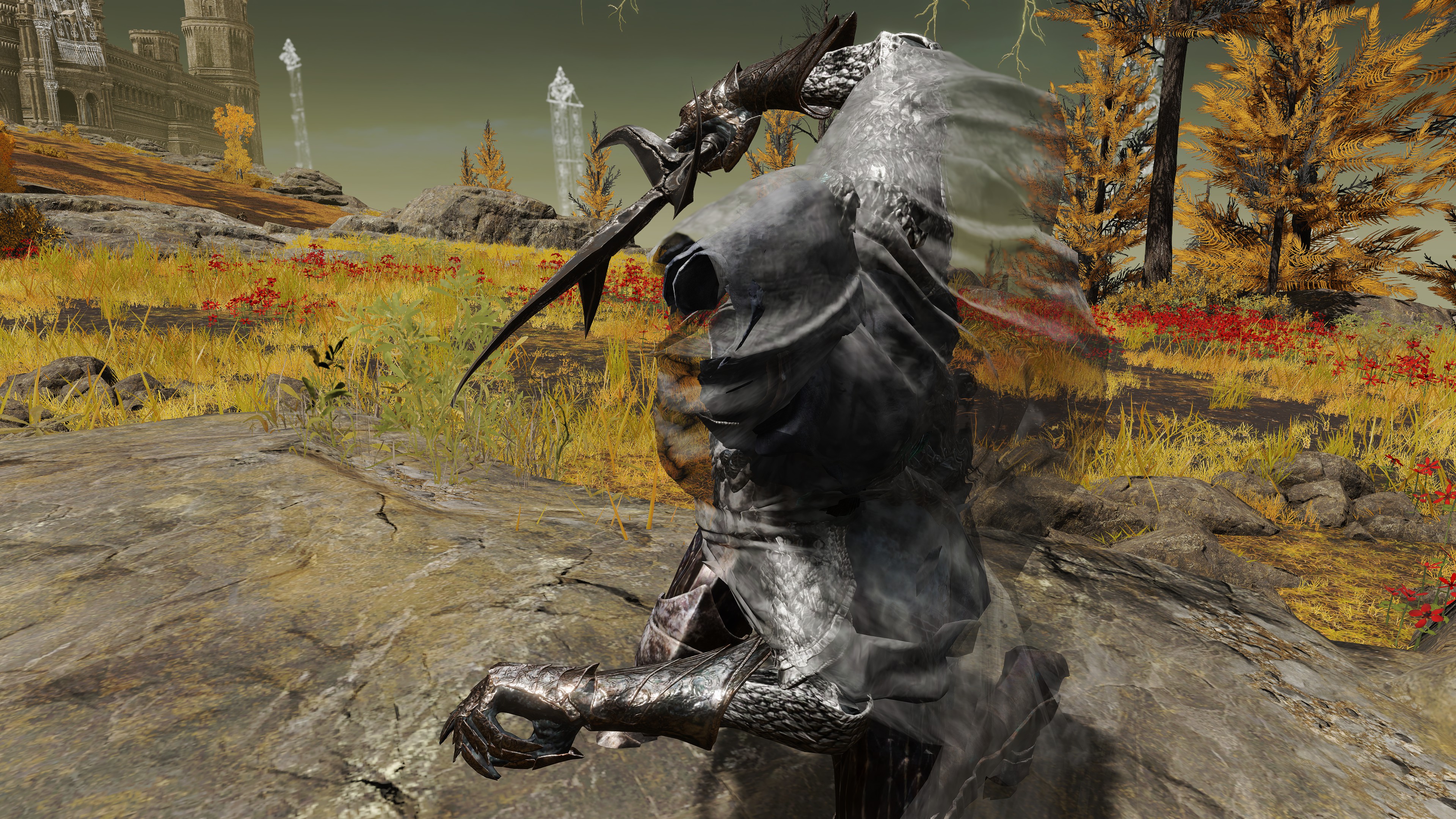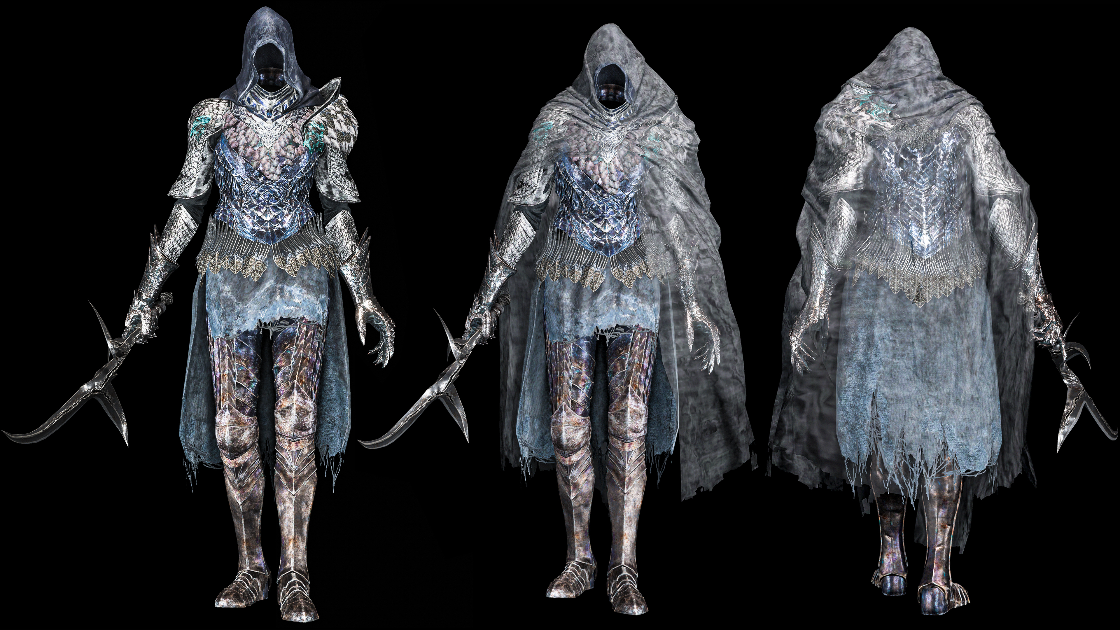Whatever the exact circumstances which led to their meeting, the moon princess made contact with the future Black Knife leader and together concocted a plot to undermine Marika. For her part, Alecto gathered likeminded women to train as assassins. True to their Nox heritage, the group armored themselves in silver and overlayed it with a lustrous dark veil enchanted to hide their bodies and silence their every movement — the best Sellian sorcery could offer. Even if the target somehow detected them, the incorporation of scale armor made them especially robust against hemorrhaging slashes and the freezing cold. So long as the assassins escaped, no one could even identify them. Even now that most veils lack the power to hide their complete forms, it has had a lasting effect, with cuts through the armor spraying black shadow instead of red blood. This must come from the veil’s power based on the story trailer, where it is depicted as a thick, opaque cloak billowing similar dark smoke at the ends. Black Knives leave no sign of who or what they are, the perfect infiltrators.