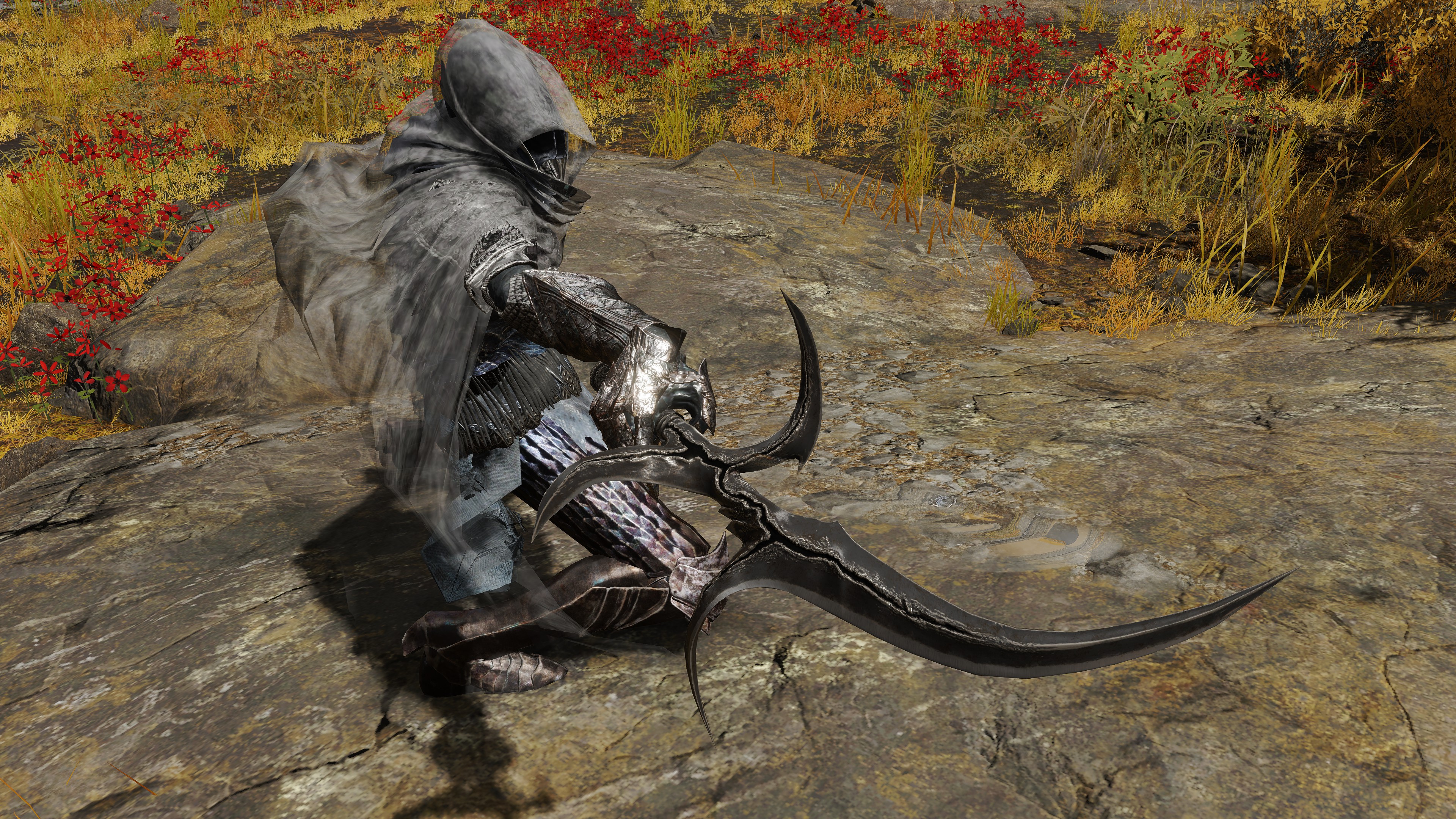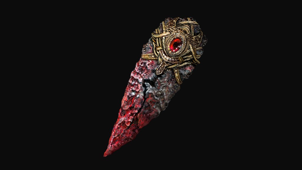 Ranni, on the other hand, agreed to prepare the weapons. Rogier confirms himself that the witch’s signature is inscribed into the magic imprint left as part of the rite infusing Destined Death within the Black Knives’ daggers. Similar to Maliketh’s greatsword, the knives’ blade turns black from the power, with a long crack through the entire center. This gave the assassins a holy edge which they could even unleash as a wave at distant targets. It requires faith from the wielder, but if there was anything that these assassins had conviction in, it was seeing the gods dead. It was probably this promise of the power which even demigods feared that convinced Alecto that Ranni’s plan was even viable. Along with their unique twisted daggers branching into multiple edges, the assassins crafted imitation blades to use as talismans, covered in red or blue stains giving the holder life or focus for dealing fatal blows. The group was well equipped to backstab unsuspecting foes per assassins and underhanded thieves’ preference. Now, they just needed the proper material for the final twist of the knife.