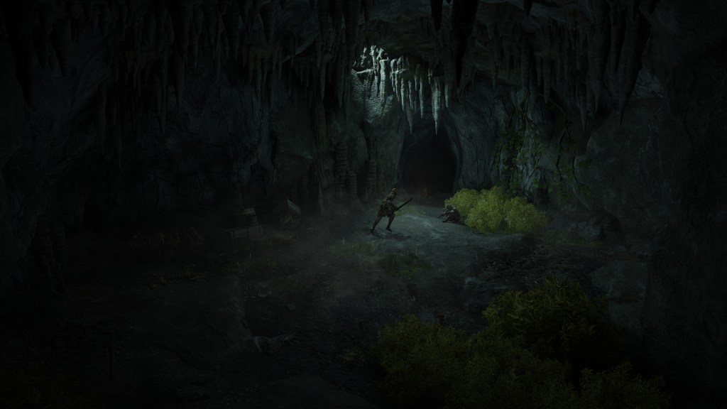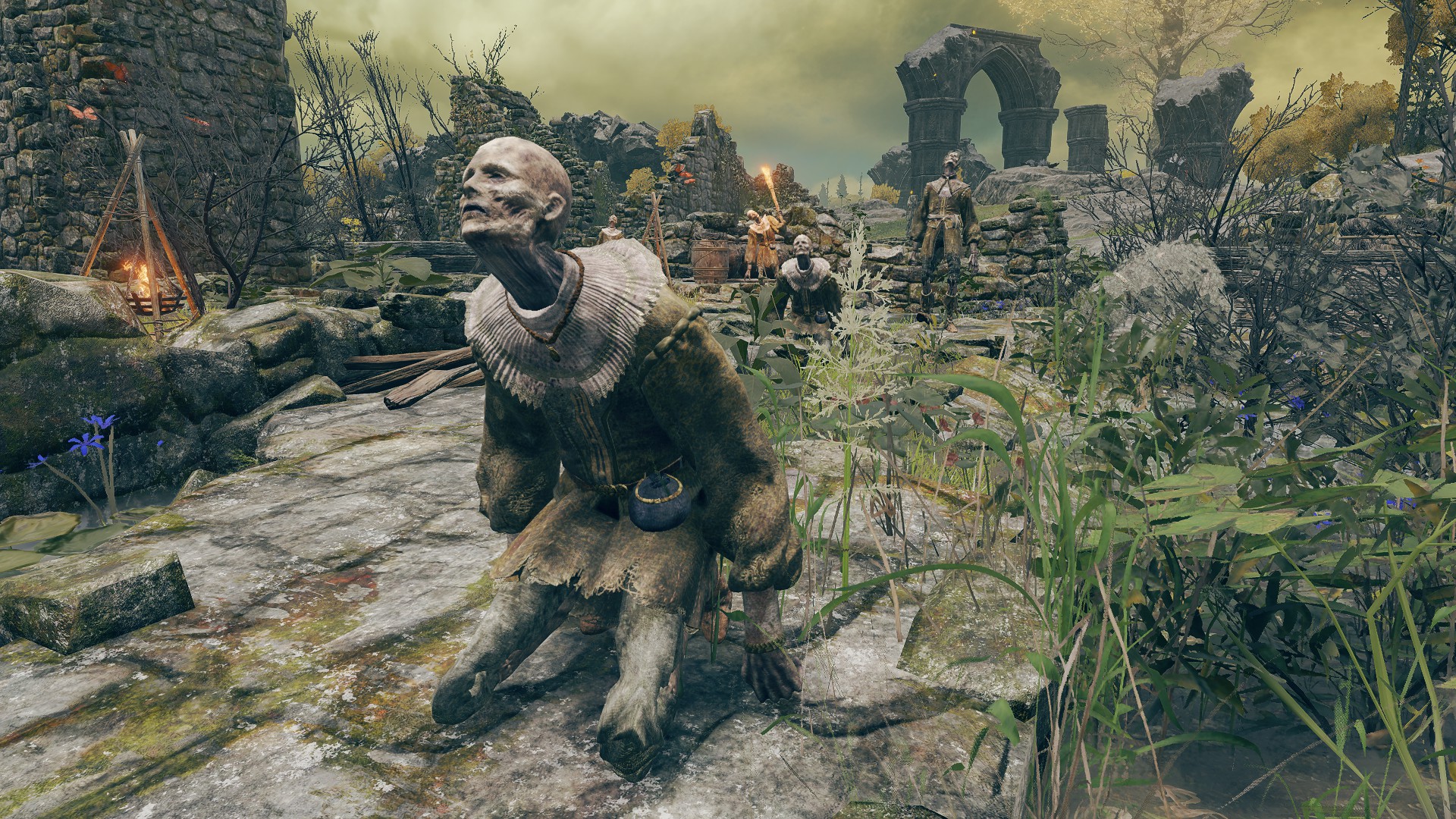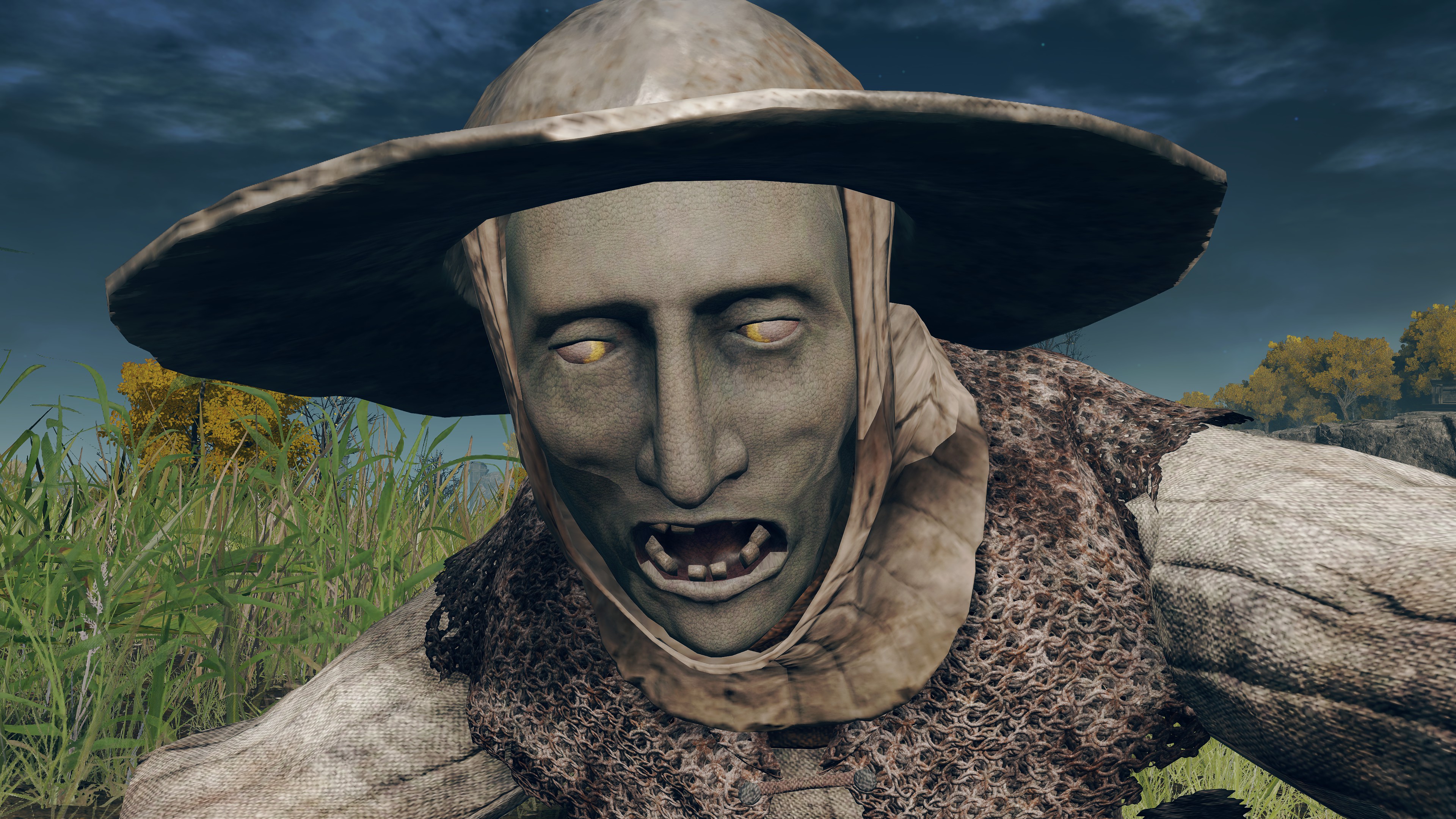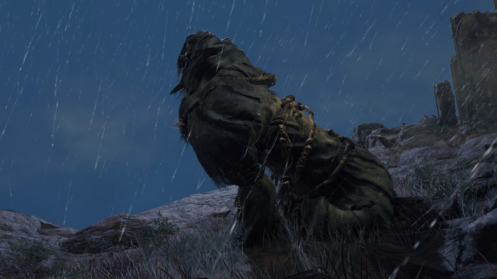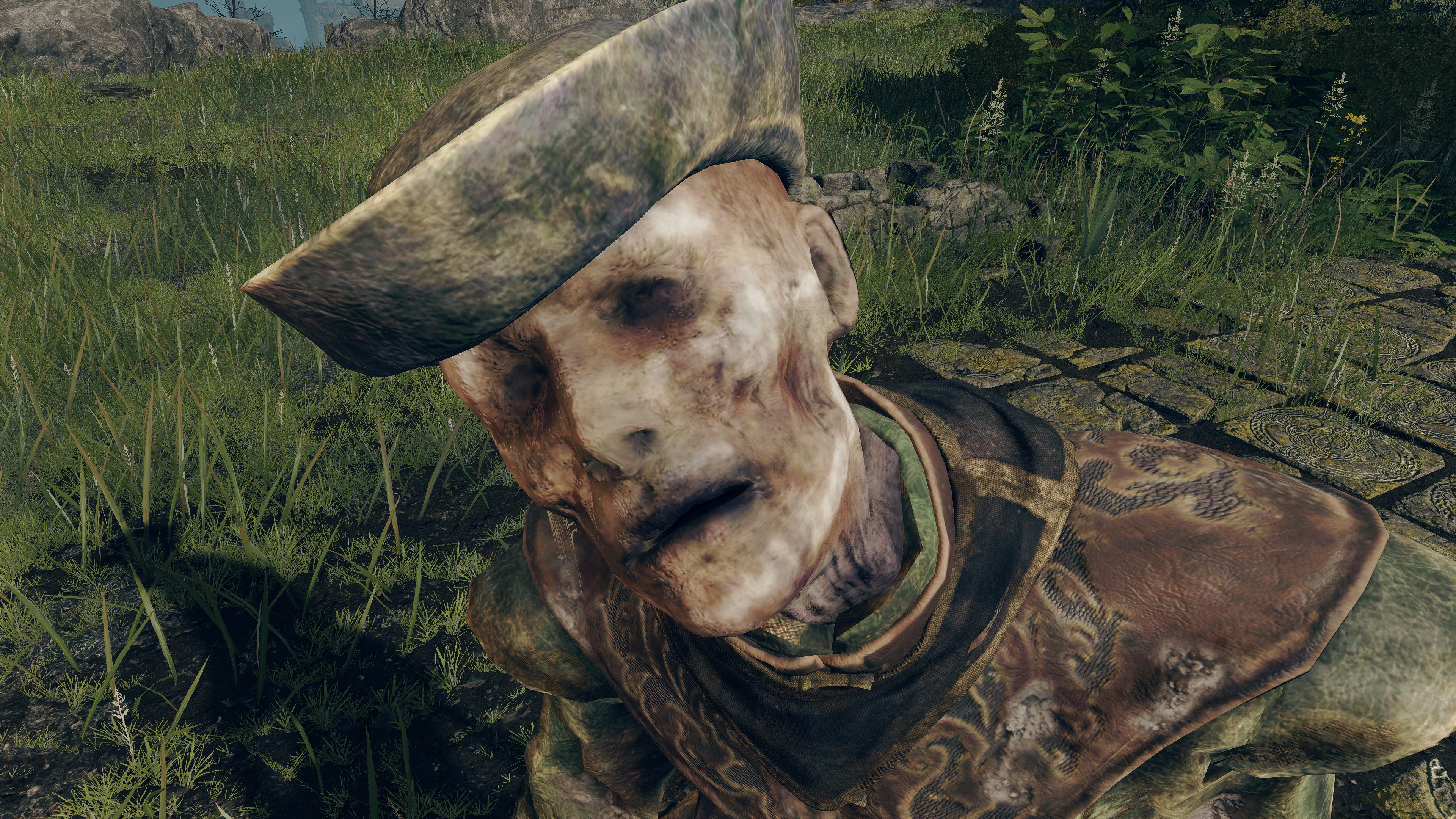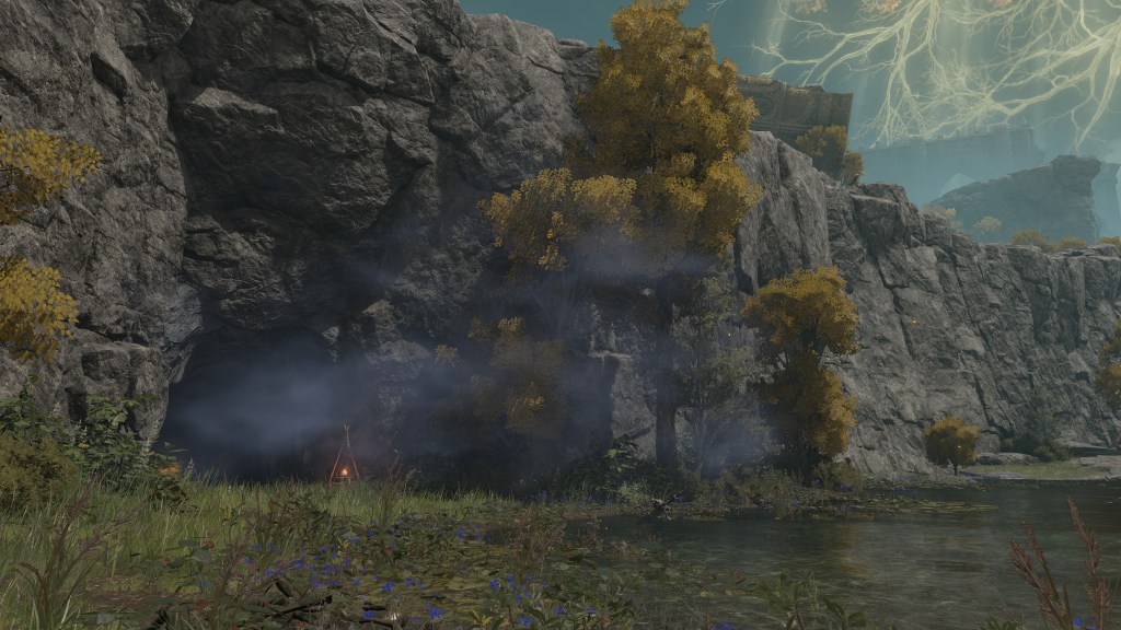 This survival past termination is multi-faceted. Speaking with Patches in Murkwater Cave, we learn that local highwaymen let the thief lodge there as a guest in exchange for looking after them in turn, later roping the band into procuring his inventory to sell. By his own admission, he doesn’t understand a word they say — just “matching wavelengths,” in his words. This is odd when everyone else from the Lands Between is intelligible, at least whenever they deign to chat. The only thing standout about the highwaymen’s circumstances is that they appear zombified and are former soldiers who, in Patches’ estimation, were overworked by their superiors only to be thrown out like trash. True enough, we see corpse piles rotting in the valley outside the cave, indicating that they were among the bodies but didn’t stay dead; after getting dumped down there, the “dead” got back up, took shelter in the nearby cave, and turned to highway robbery to get by. In short, the major difference is already returning from death.
