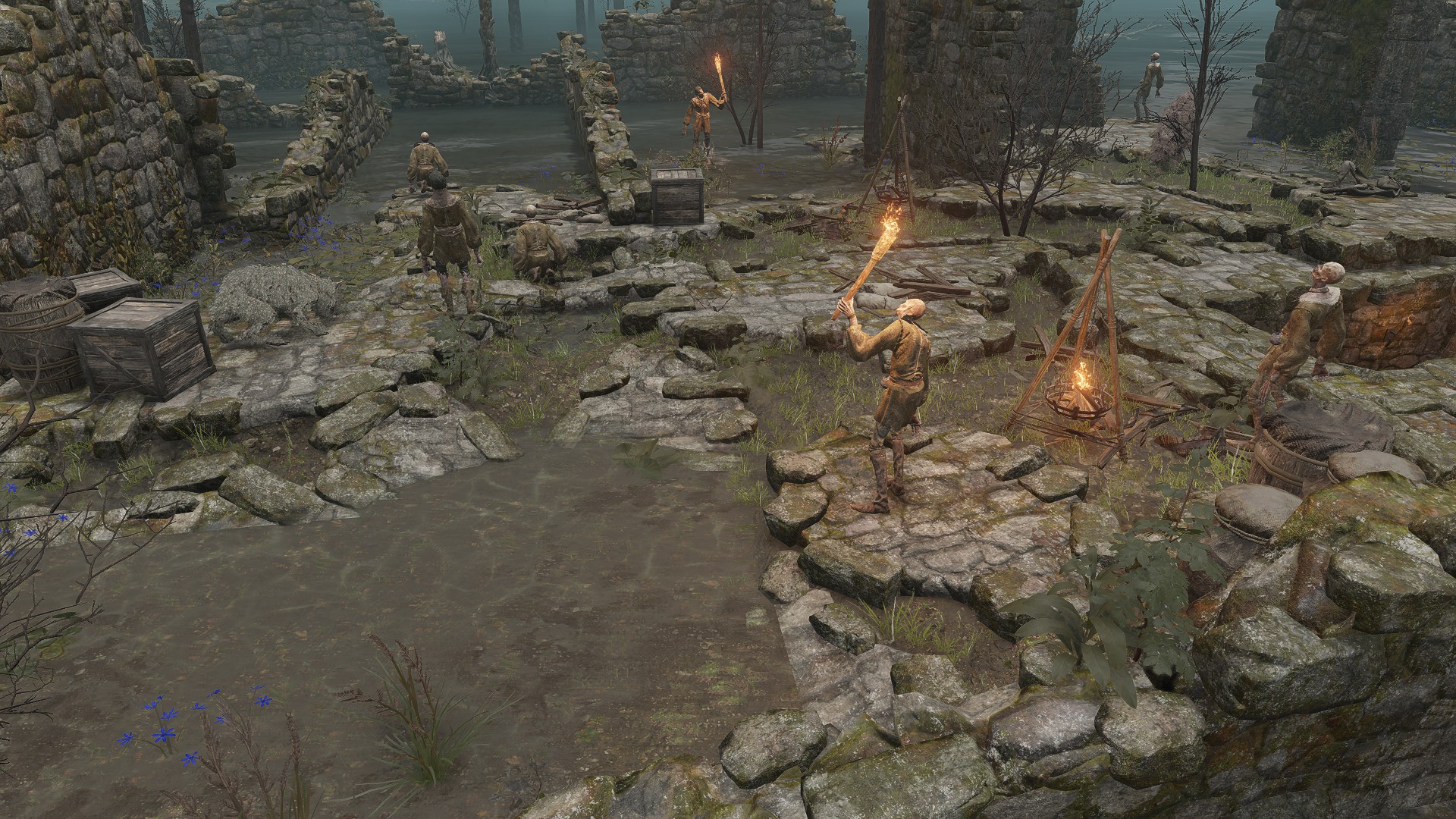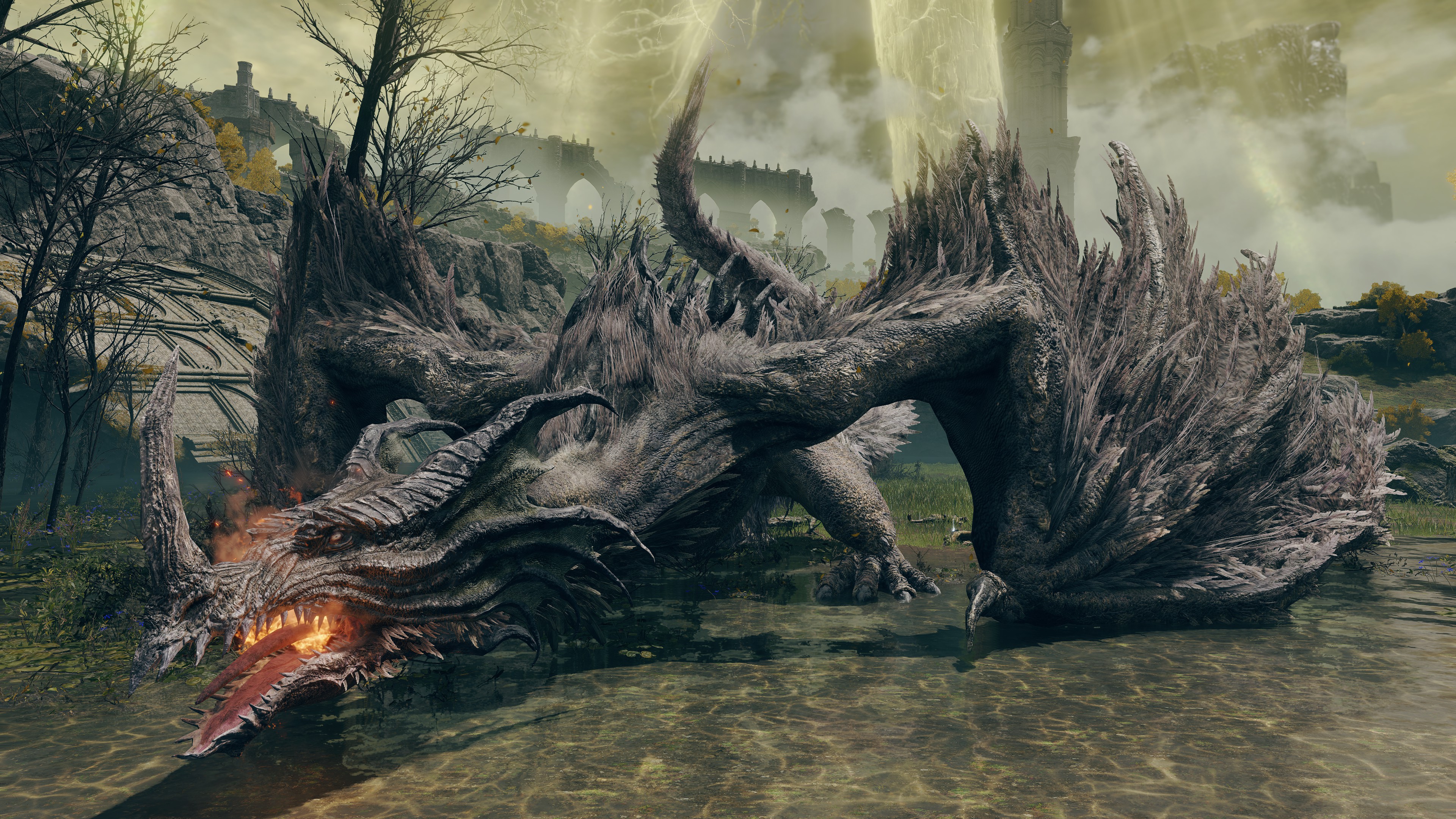 In the lake of Limgrave, Hollows look up at the sky and pray of being burned to death with that dragon fire.