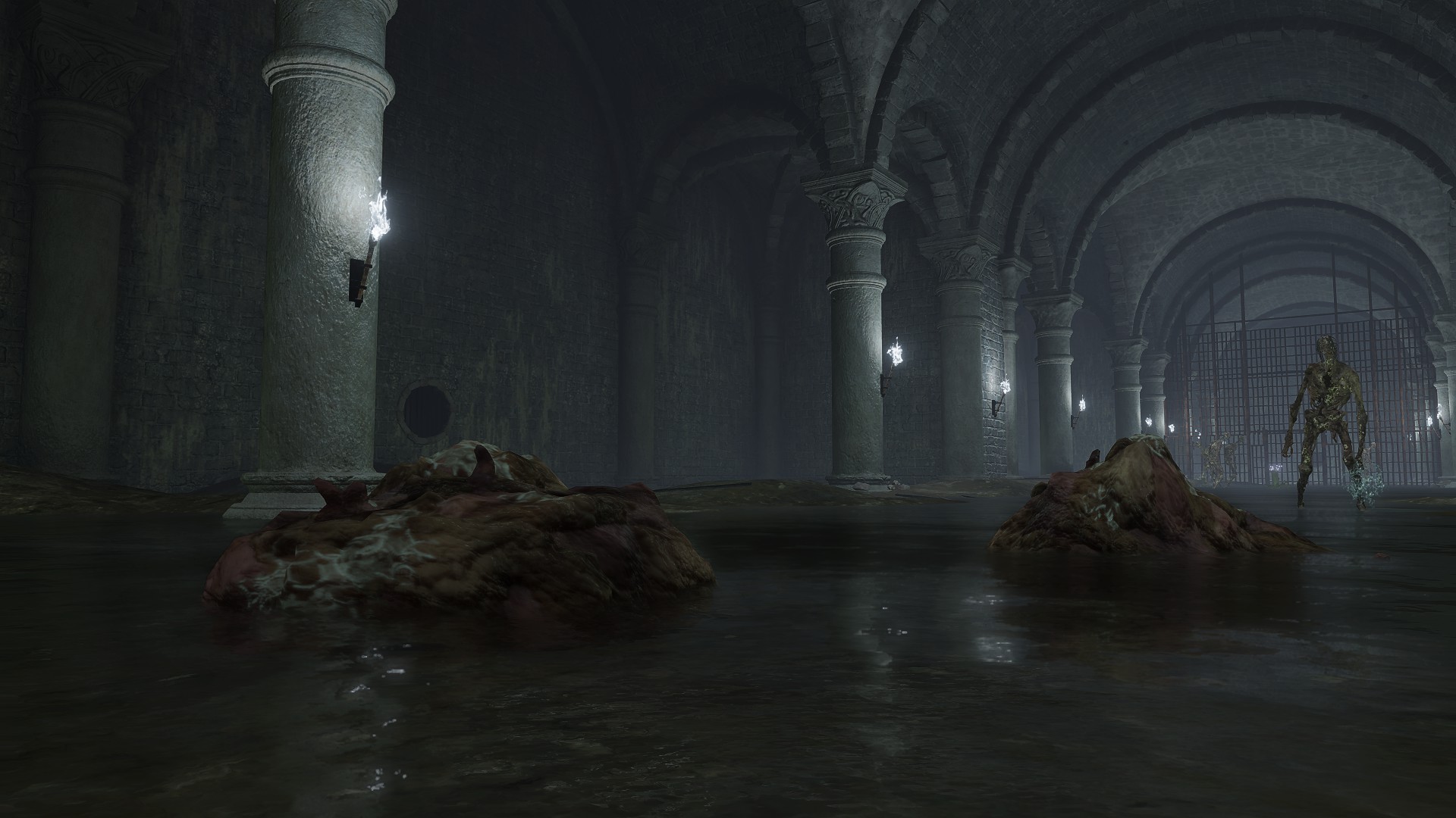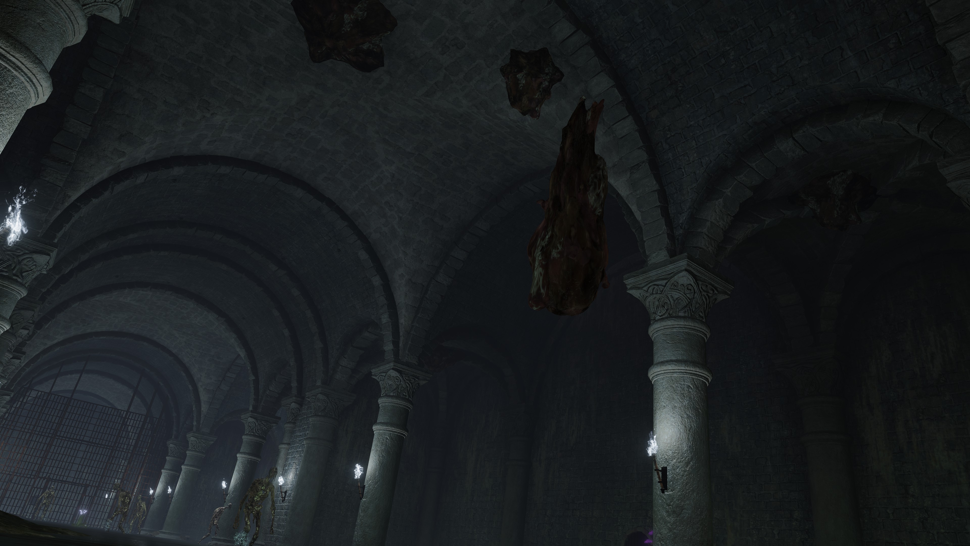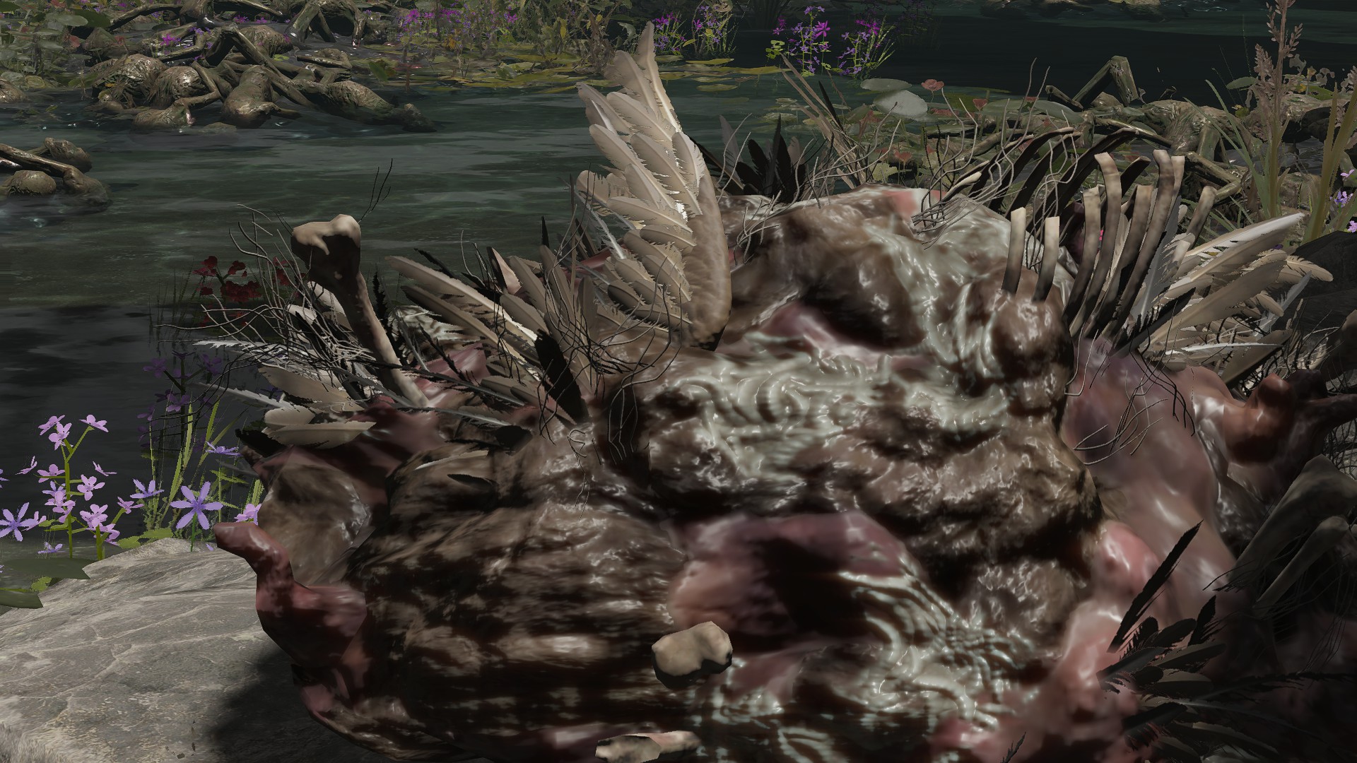Soggy soil isn’t the only thing rousing the dead from slumber. Joining Hollows in those flooded graves are “crawling carrion” (蠢く腐肉) — mounds of rotten flesh squirming on the floors and occasionally ceilings. By all appearances, they are pieces of different dead amalgamated into a singular mass of meat. The resulting enemy doesn’t appear to have a brain or individual identity, though they are clearly motivated by some collective will. In all likelihood, that will is resentment against the living. Outside of waterlogged areas, we find the enemy in places where victims might suffer especially grievous deaths, the personal injustice sure to stew strong sentiments within souls. That grudge gets passed onto the flesh, pieces pooling together based on that shared feeling. It doesn’t take long for them to lash out either. Left exposed to the elements, the resentful flesh soon assimilate the scavengers which come to pick the carrion, wildlife bones and feather wings mixed in; indoors, they are just feasted on by maggots, though they still retain thin and hefty beast bones somewhere inside. They are alive and wrathful.