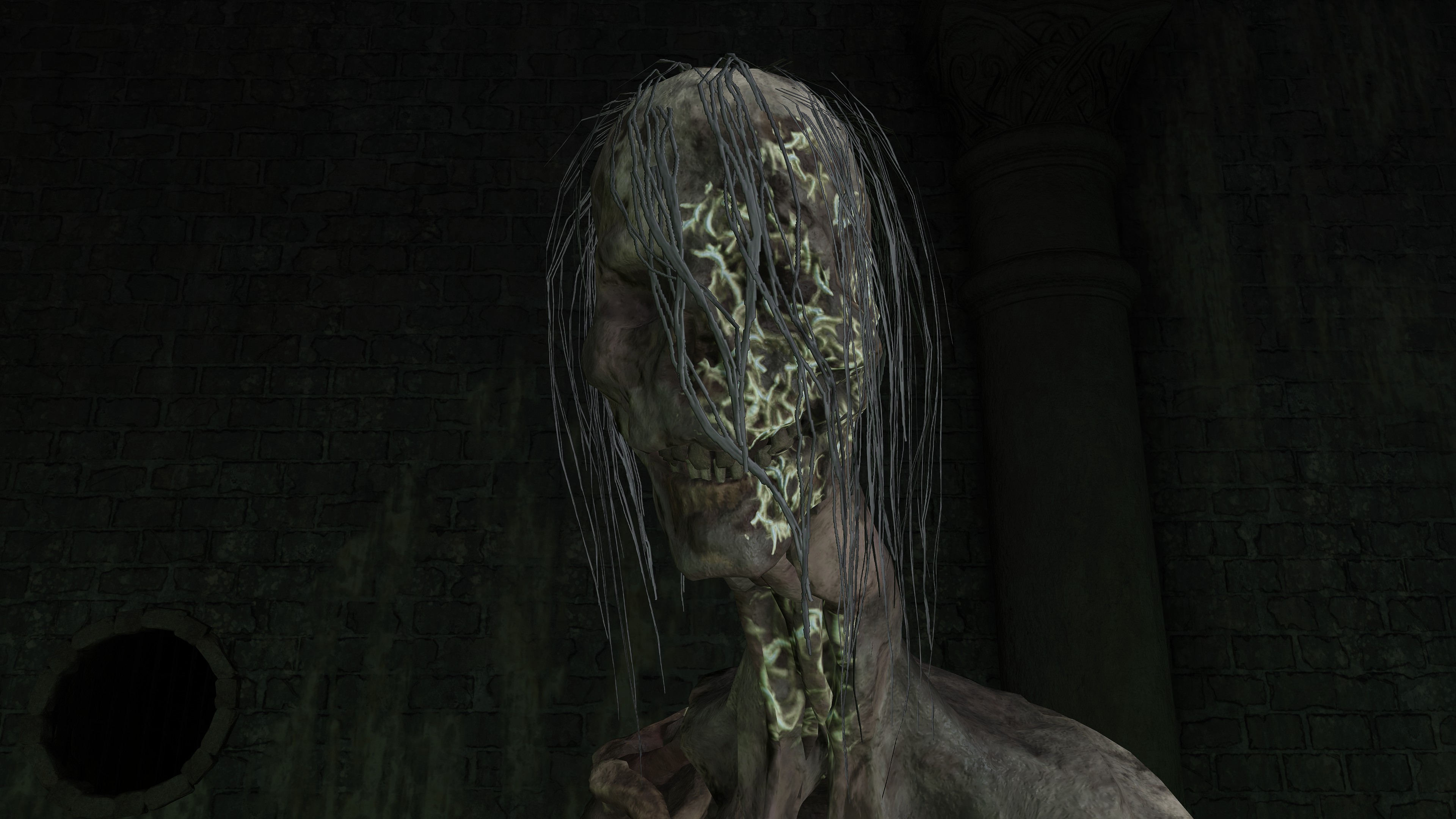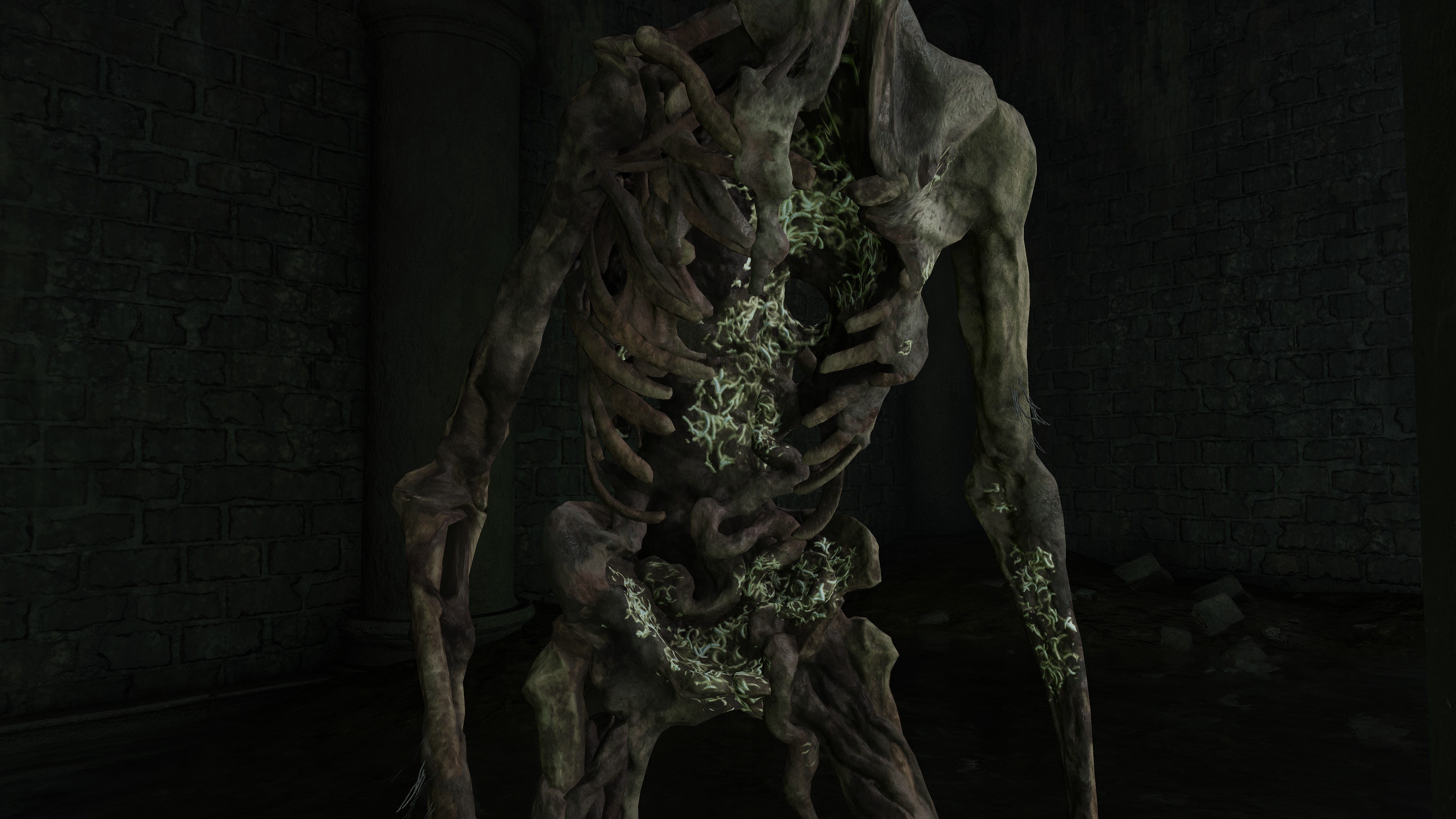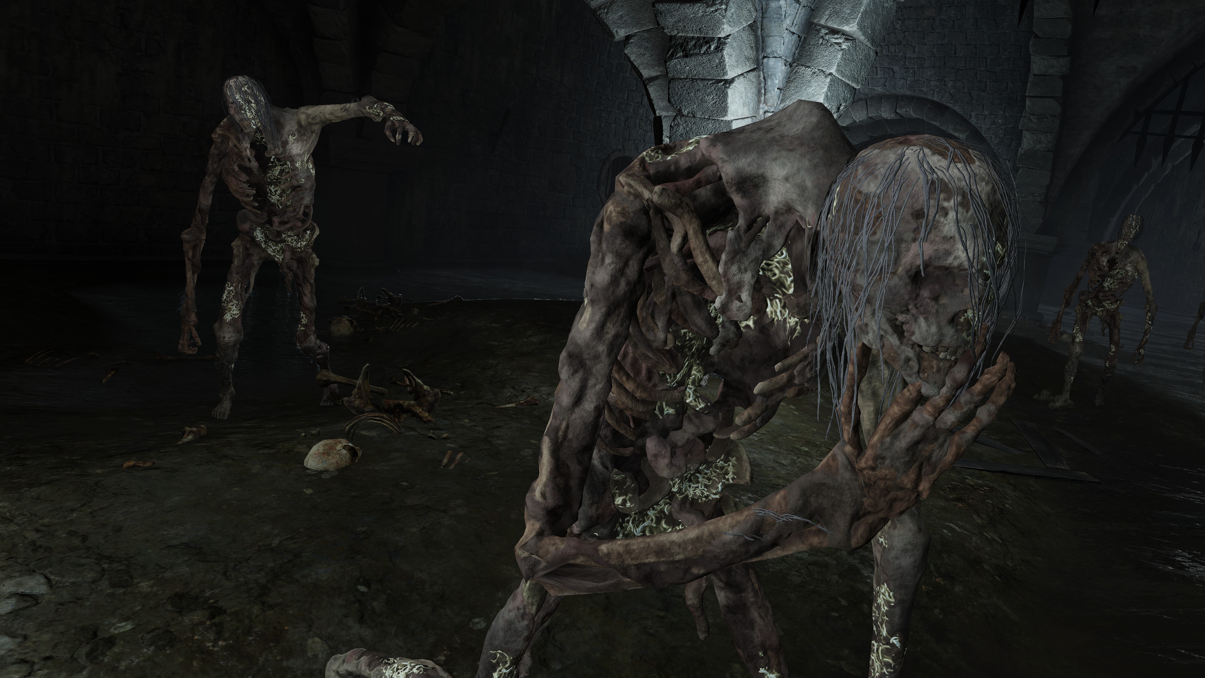 Soggy soil isn’t the only thing rousing the dead from slumber. Joining Hollows in those flooded graves are “crawling carrion” (蠢く腐肉) — mounds of rotten flesh squirming on the floors and occasionally ceilings. By all appearances, they are pieces of different dead amalgamated into a singular mass of meat. The resulting enemy doesn’t appear to have a brain or individual identity, though they are clearly motivated by some collective will. In all likelihood, that will is resentment against the living. Outside of waterlogged areas, we find the enemy in places where victims might suffer especially grievous deaths, the personal injustice sure to stew strong sentiments within souls. That grudge gets passed onto the flesh, pieces pooling together based on that shared feeling. It doesn’t take long for them to lash out either. Left exposed to the elements, the resentful flesh soon assimilate the scavengers which come to pick the carrion, wildlife bones and feather wings mixed in; indoors, they are just feasted on by maggots, though they still retain thin and hefty beast bones somewhere inside. They are alive and wrathful.