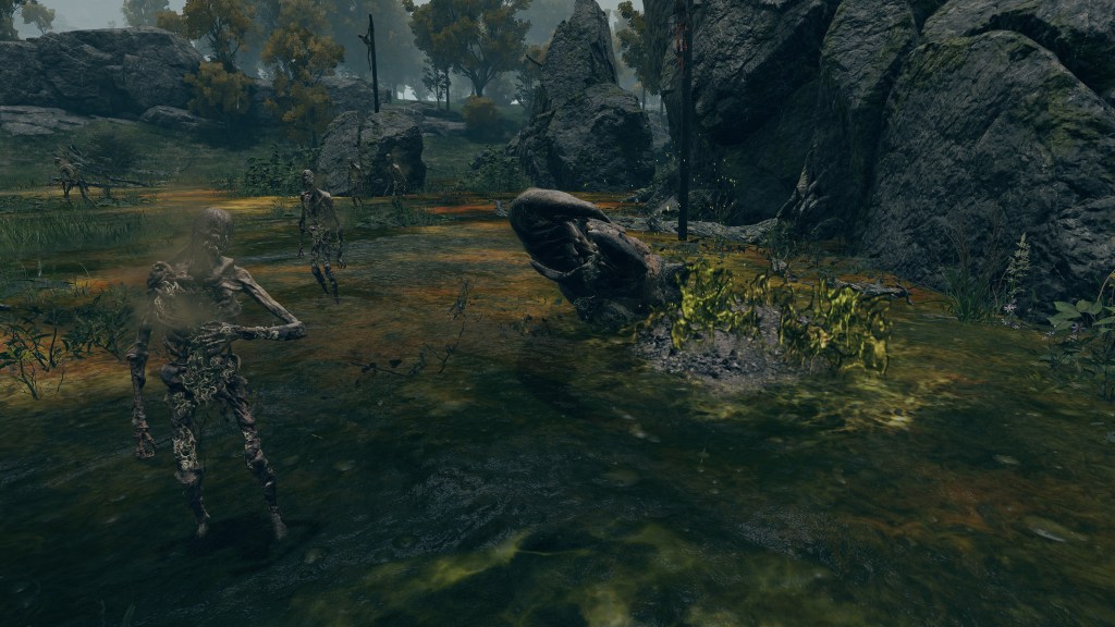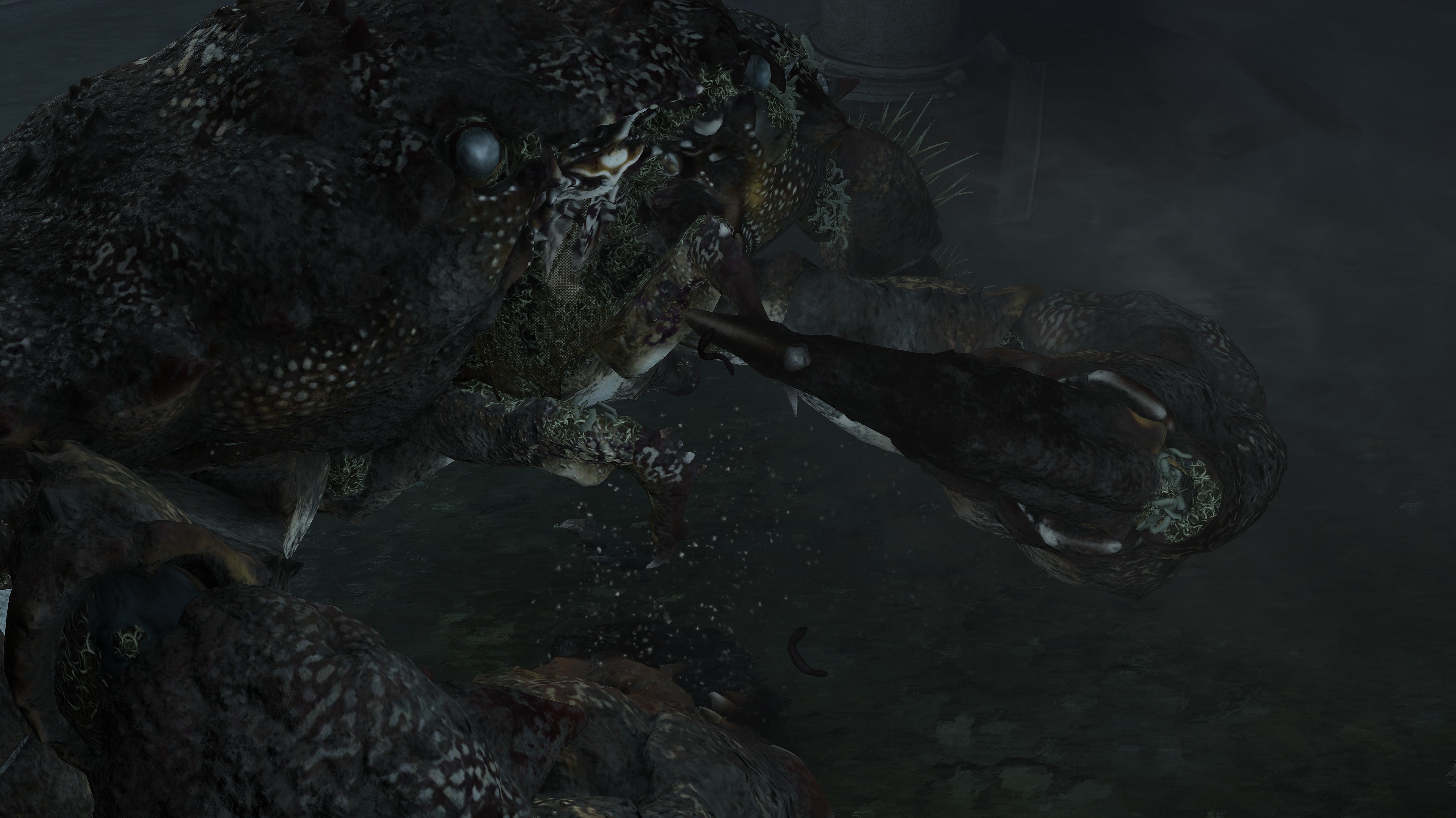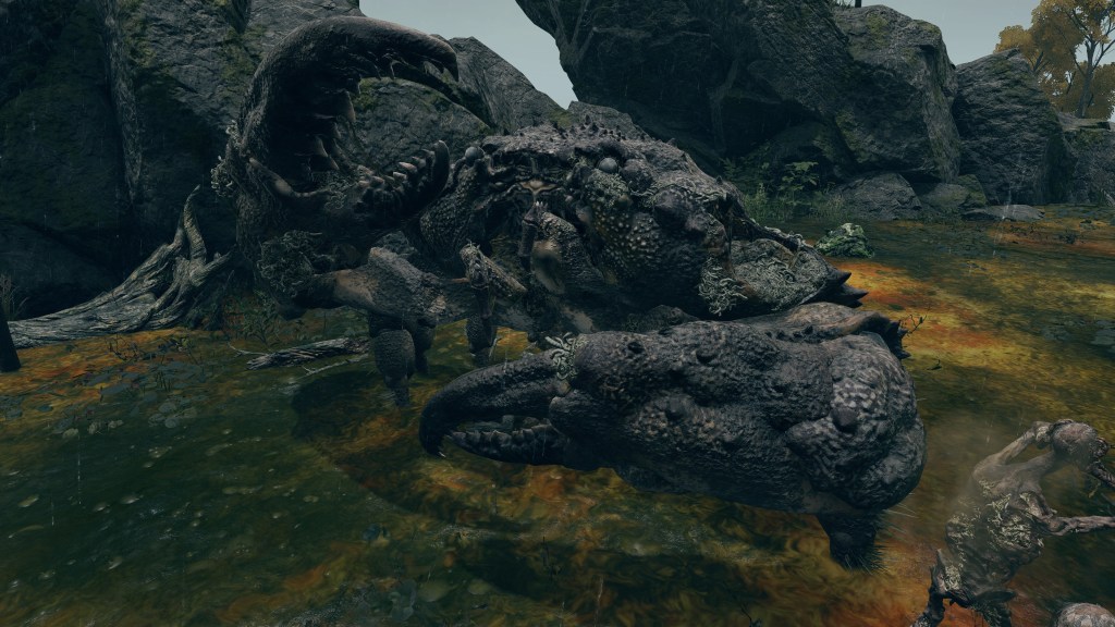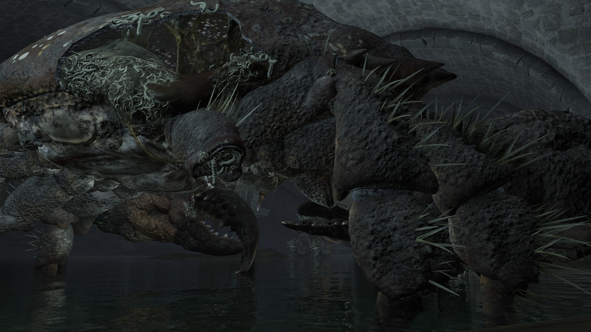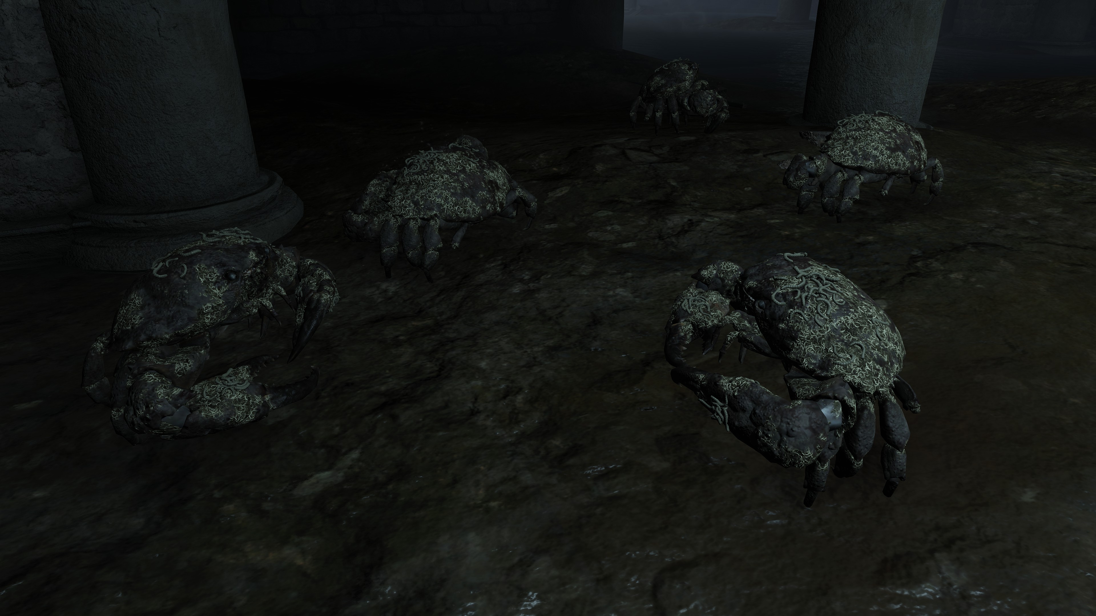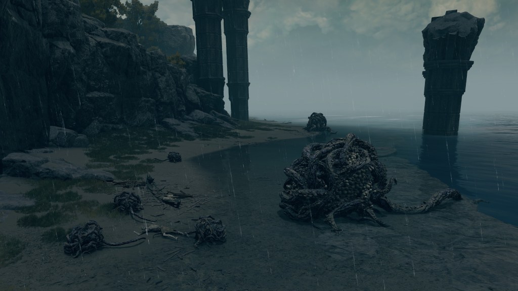 As the final nail in the coffin, we can only encounter a “Hollow” crab in one other location. In front of Castle Morne, we can find a mass crucifixion on an outcrop, bodies repeatedly left out there until they perish and rot off their posts — into the water pooling beneath under the constant rain. This has poisoned the pool over time, as well as freed the rotten Hollows to shamble about, with poisoned carrion crawling there with them. While the trees of the surrounding forest die to the stagnant waters infested with all sort of mucilage and maladies, this rot is apparently still too recent to kill off the bushes and grasses. And what do we see has buried itself in the poison pool? Another of these pest-ridden giant crabs. This leaves no reason to doubt a connection between the dead and the crabs feeding off them, whether it be from the rotten flesh directly or the worms feasting on that same flesh.
