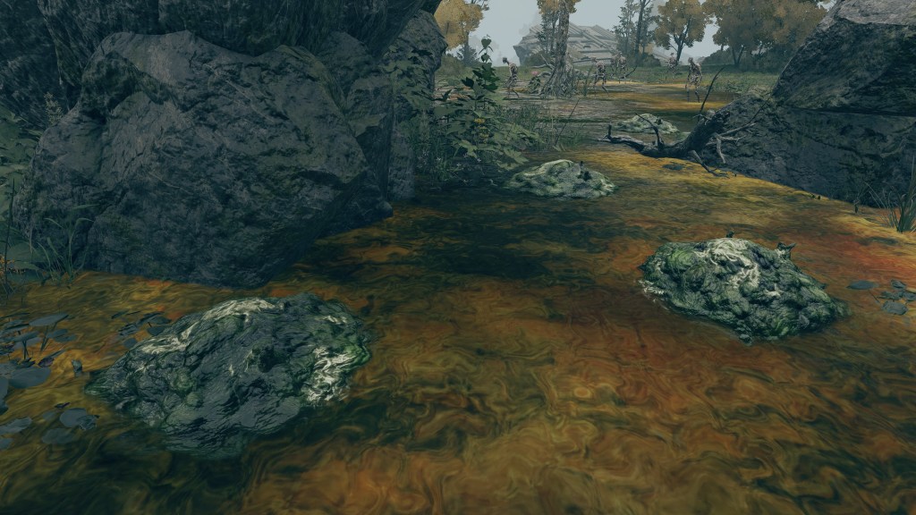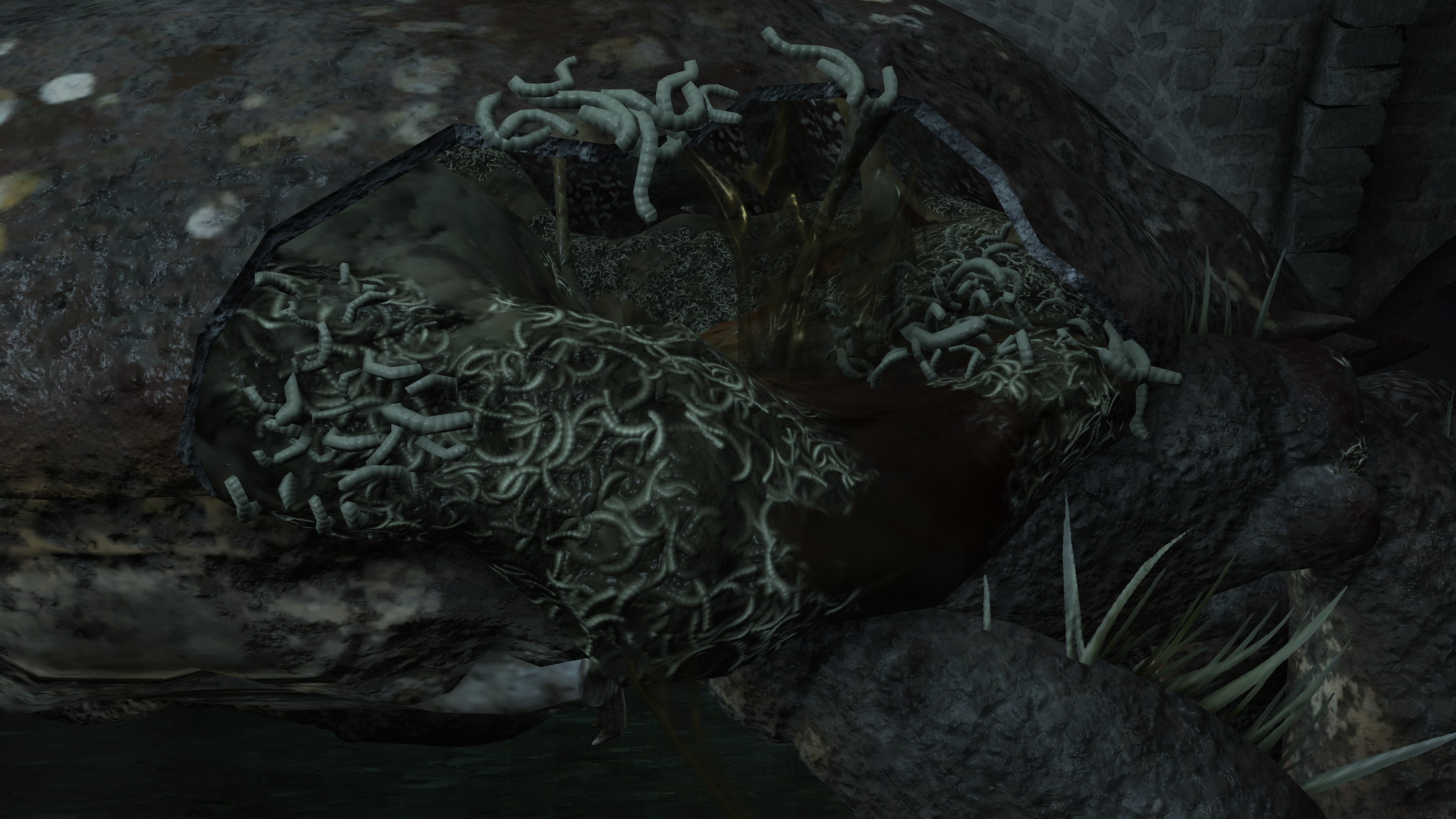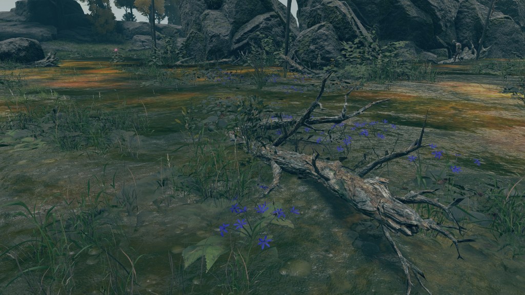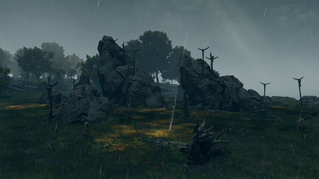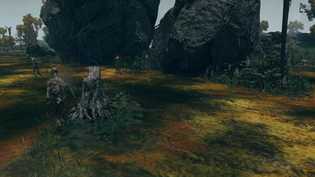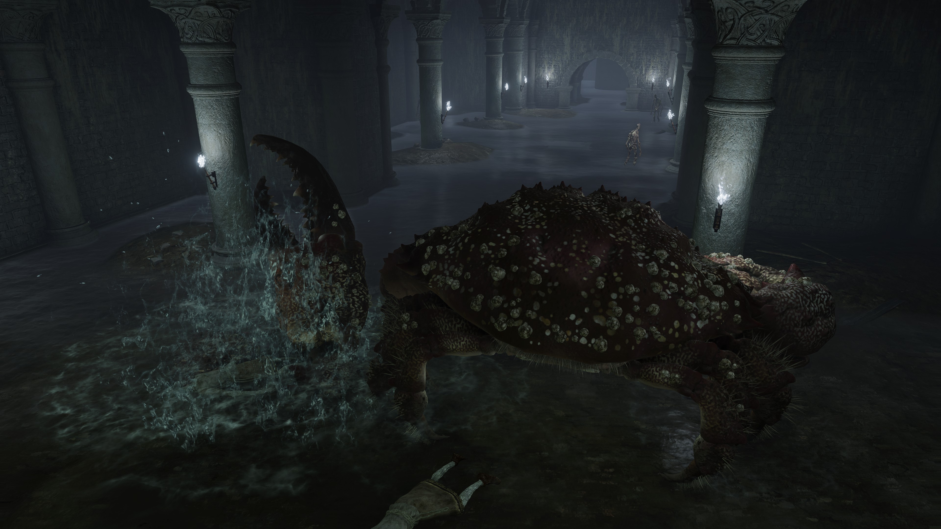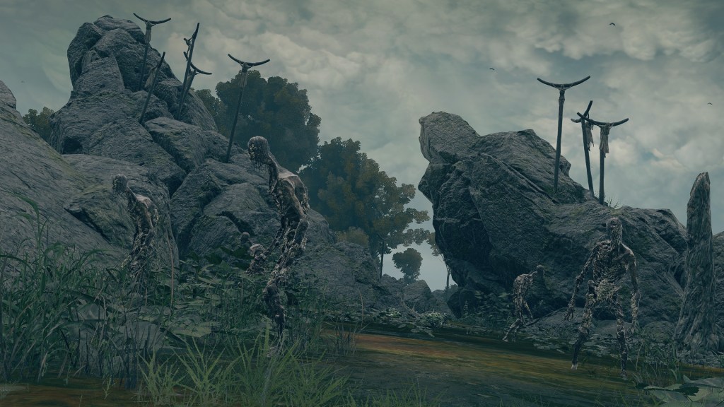 As the final nail in the coffin, we can only encounter a “Hollow” crab in one other location. In front of Castle Morne, we can find a mass crucifixion on an outcrop, bodies repeatedly left out there until they perish and rot off their posts — into the water pooling beneath under the constant rain. This has poisoned the pool over time, as well as freed the rotten Hollows to shamble about, with poisoned carrion crawling there with them. While the trees of the surrounding forest die to the stagnant waters infested with all sort of mucilage and maladies, this rot is apparently still too recent to kill off the bushes and grasses. And what do we see has buried itself in the poison pool? Another of these pest-ridden giant crabs. This leaves no reason to doubt a connection between the dead and the crabs feeding off them, whether it be from the rotten flesh directly or the worms feasting on that same flesh.