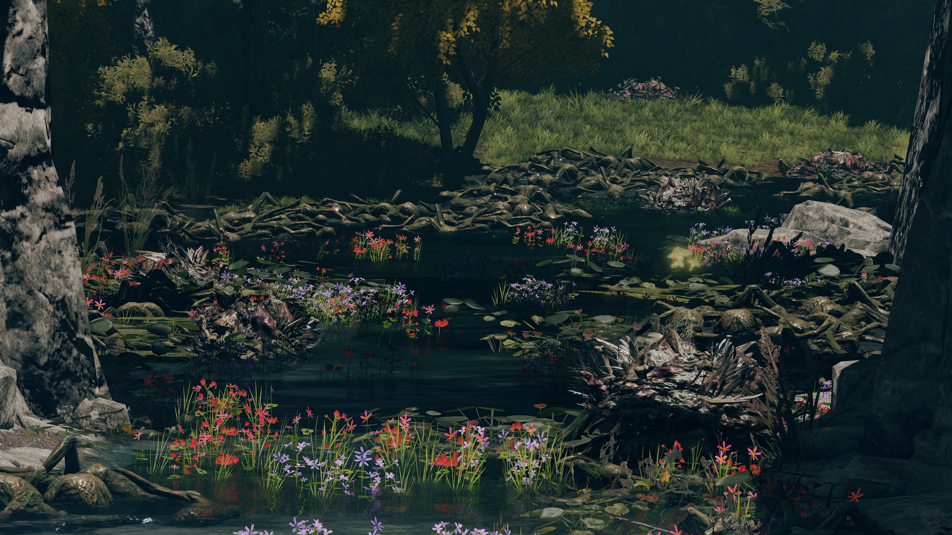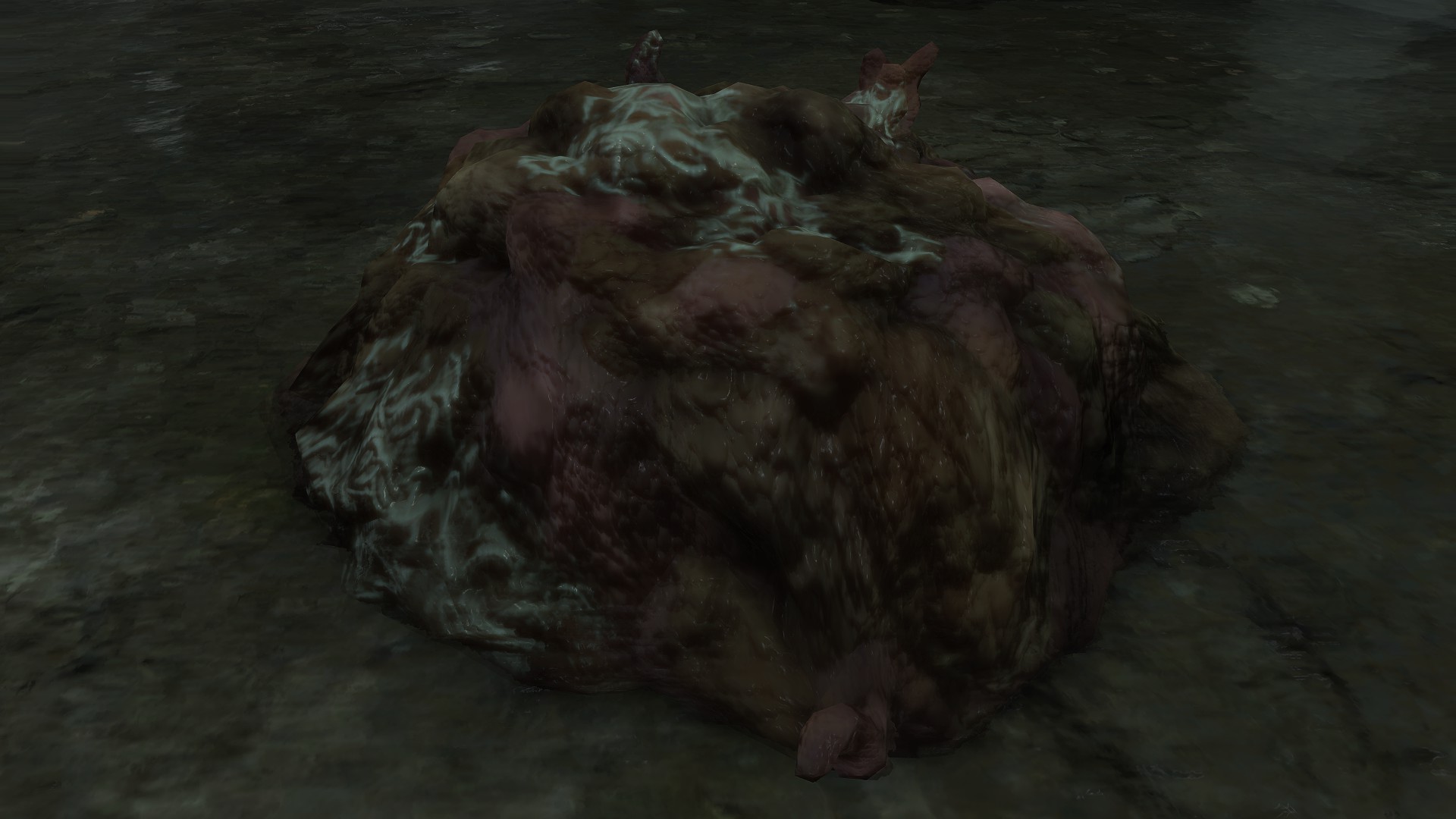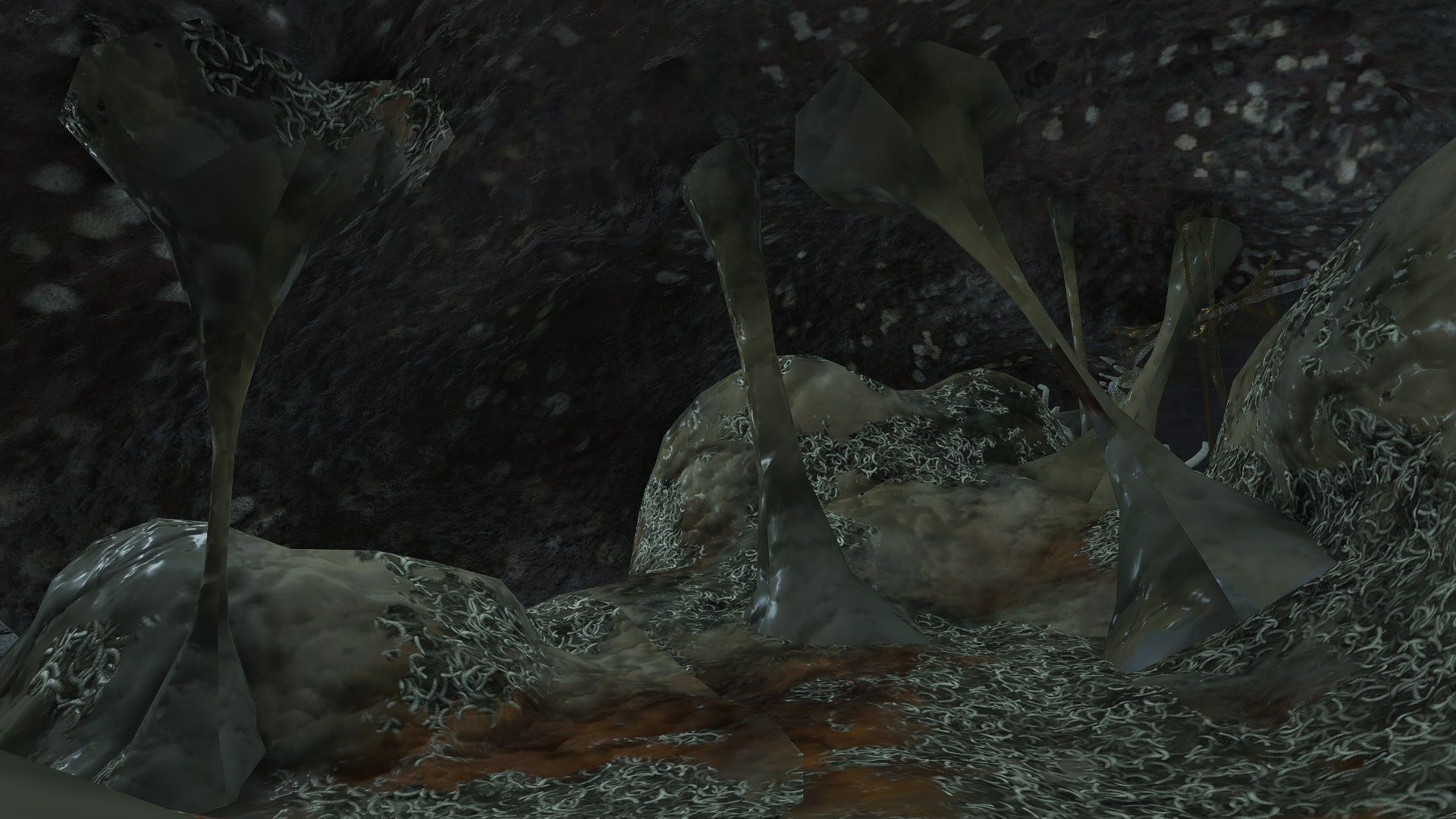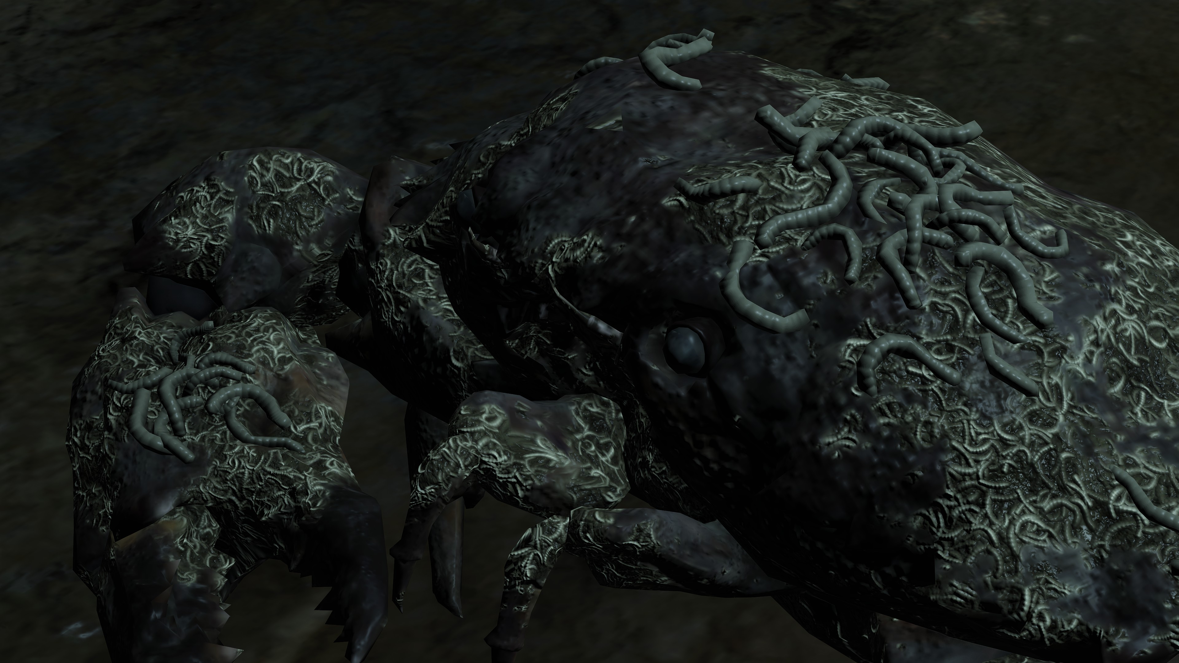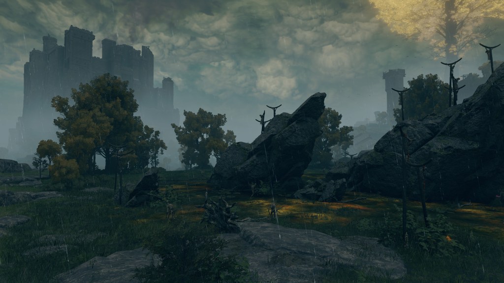 As the final nail in the coffin, we can only encounter a “Hollow” crab in one other location. In front of Castle Morne, we can find a mass crucifixion on an outcrop, bodies repeatedly left out there until they perish and rot off their posts — into the water pooling beneath under the constant rain. This has poisoned the pool over time, as well as freed the rotten Hollows to shamble about, with poisoned carrion crawling there with them. While the trees of the surrounding forest die to the stagnant waters infested with all sort of mucilage and maladies, this rot is apparently still too recent to kill off the bushes and grasses. And what do we see has buried itself in the poison pool? Another of these pest-ridden giant crabs. This leaves no reason to doubt a connection between the dead and the crabs feeding off them, whether it be from the rotten flesh directly or the worms feasting on that same flesh.