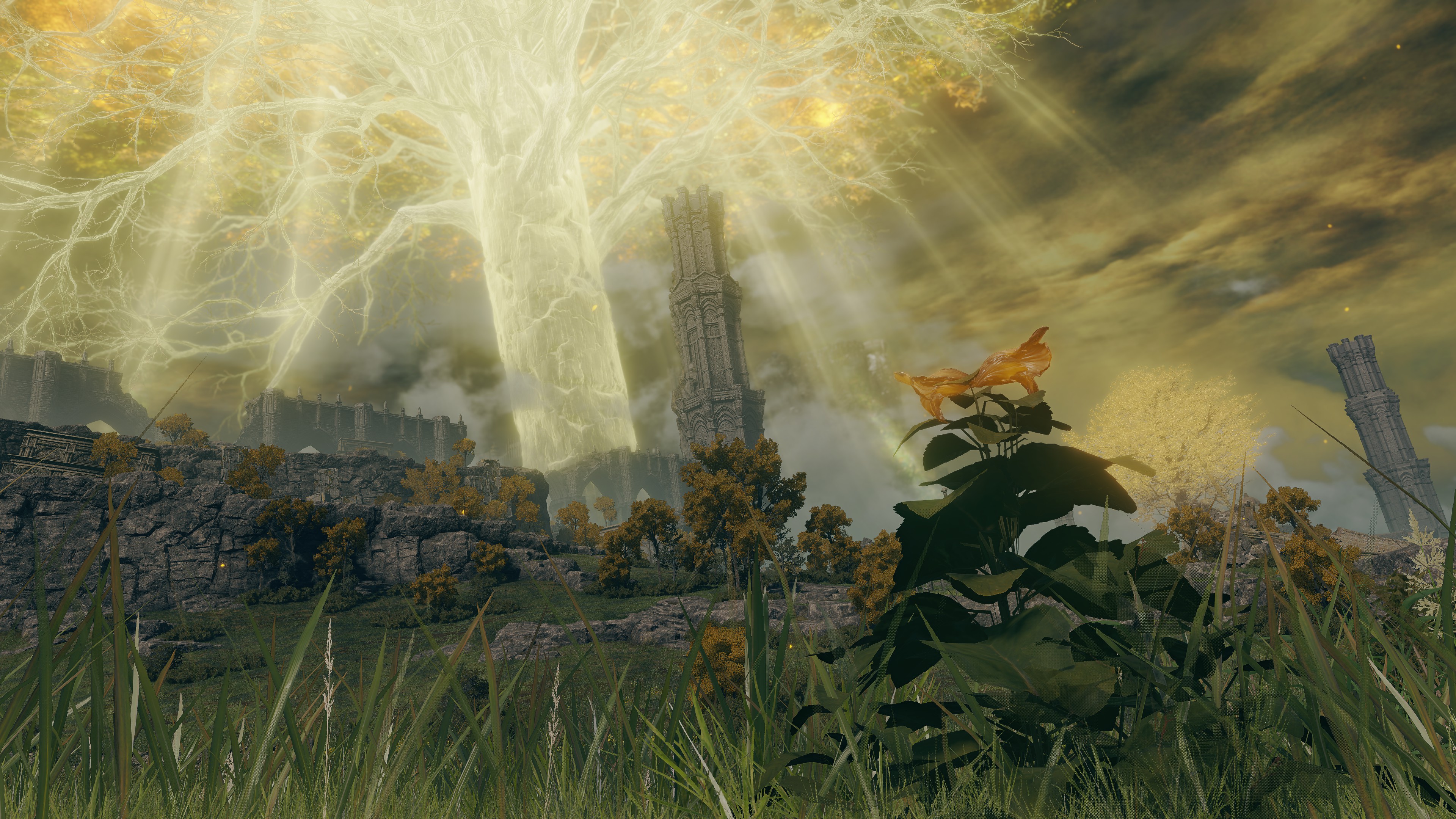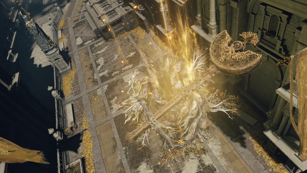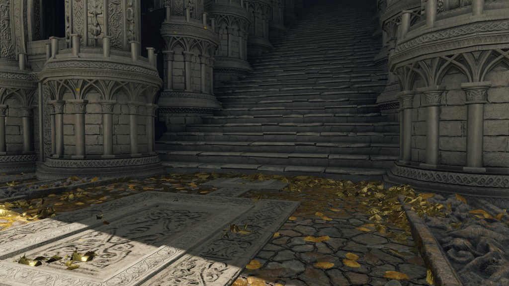 The effects upon the world outside were immediate. The introductory cutscene features the Erdtree exploding with golden power after the Ring broke, the force creating waves in the ocean all the way over in Limgrave. This power appears to have been concentrated in the air, with no obvious signs of lasting damage on Leyndell. Nevertheless, this outburst is likely the basis for Wrath of Gold, which the most devoted members of the faithful like Kenneth or Edgar soon adopted in prayer. No one across the Lands Between seems to have gone unaware of the Erdtree’s plight either, with the gold afterward never again achieving the same soothing radiance as the old tree. As the narrator admits from the outset, the falling leaves tell the whole story, the Erdtree slowly dying as its Ring at the source remains broken. Those tarnished leaves flow on the air all the way down to Limgrave, with strong gusts carrying all the more, still rich with power, to any corner of the lands sporadically. The message they silently carry would be clear to everyone: the Order was fractured and figuratively bleeding out.