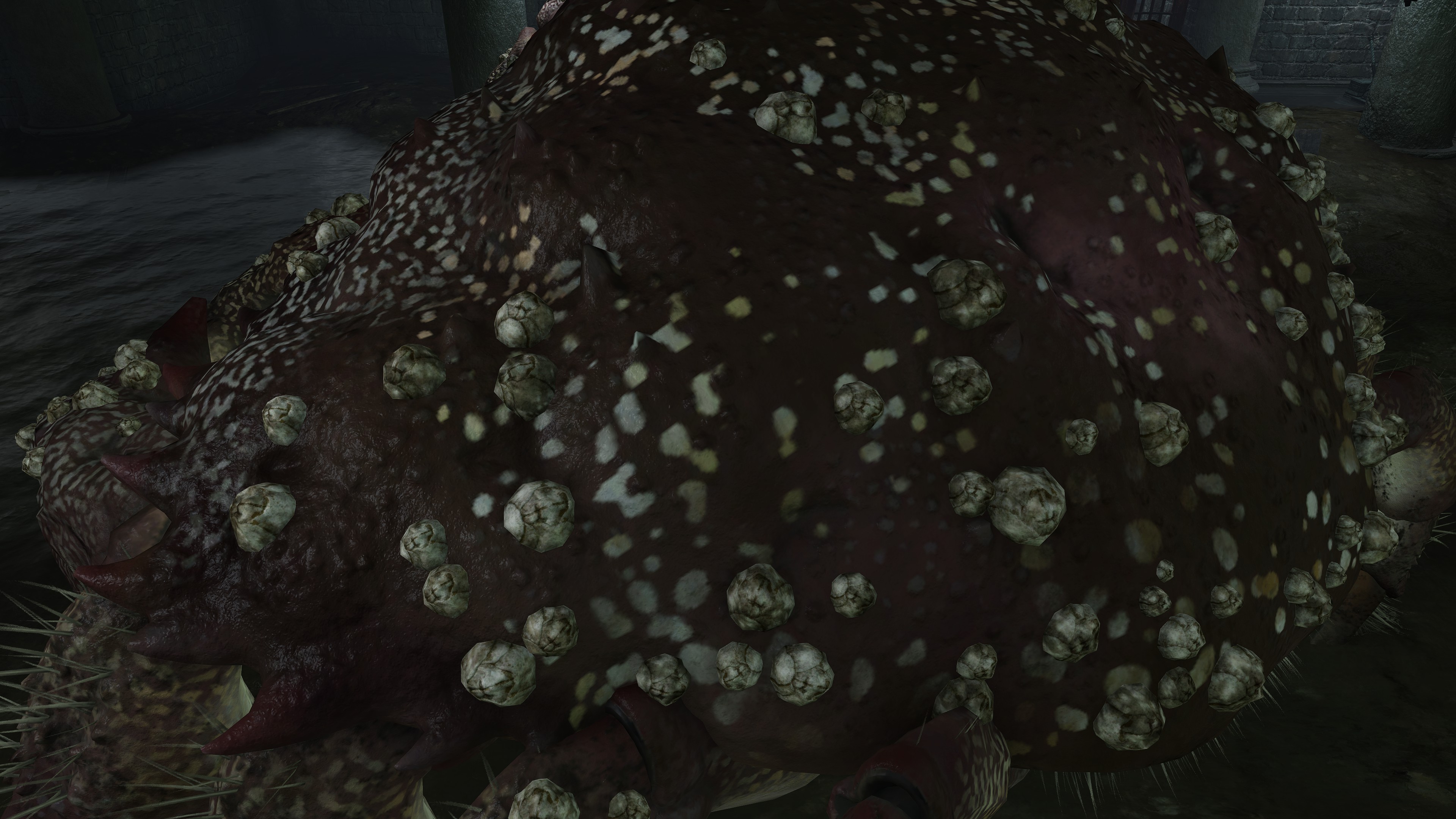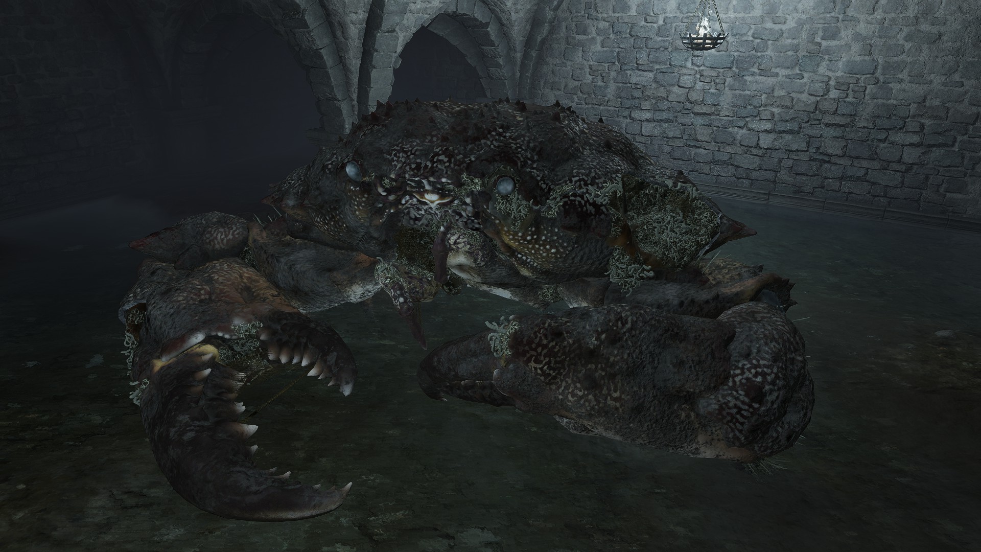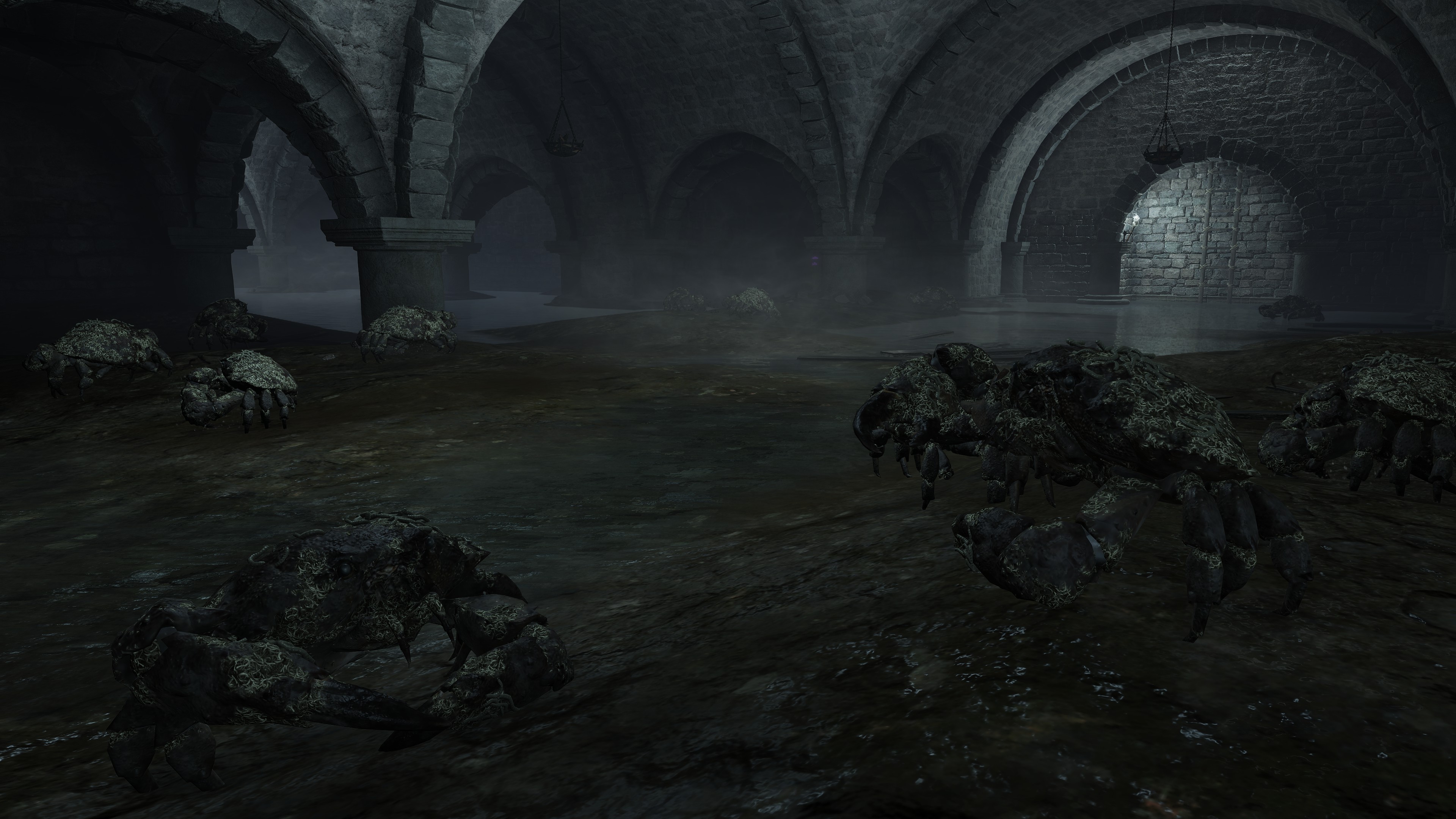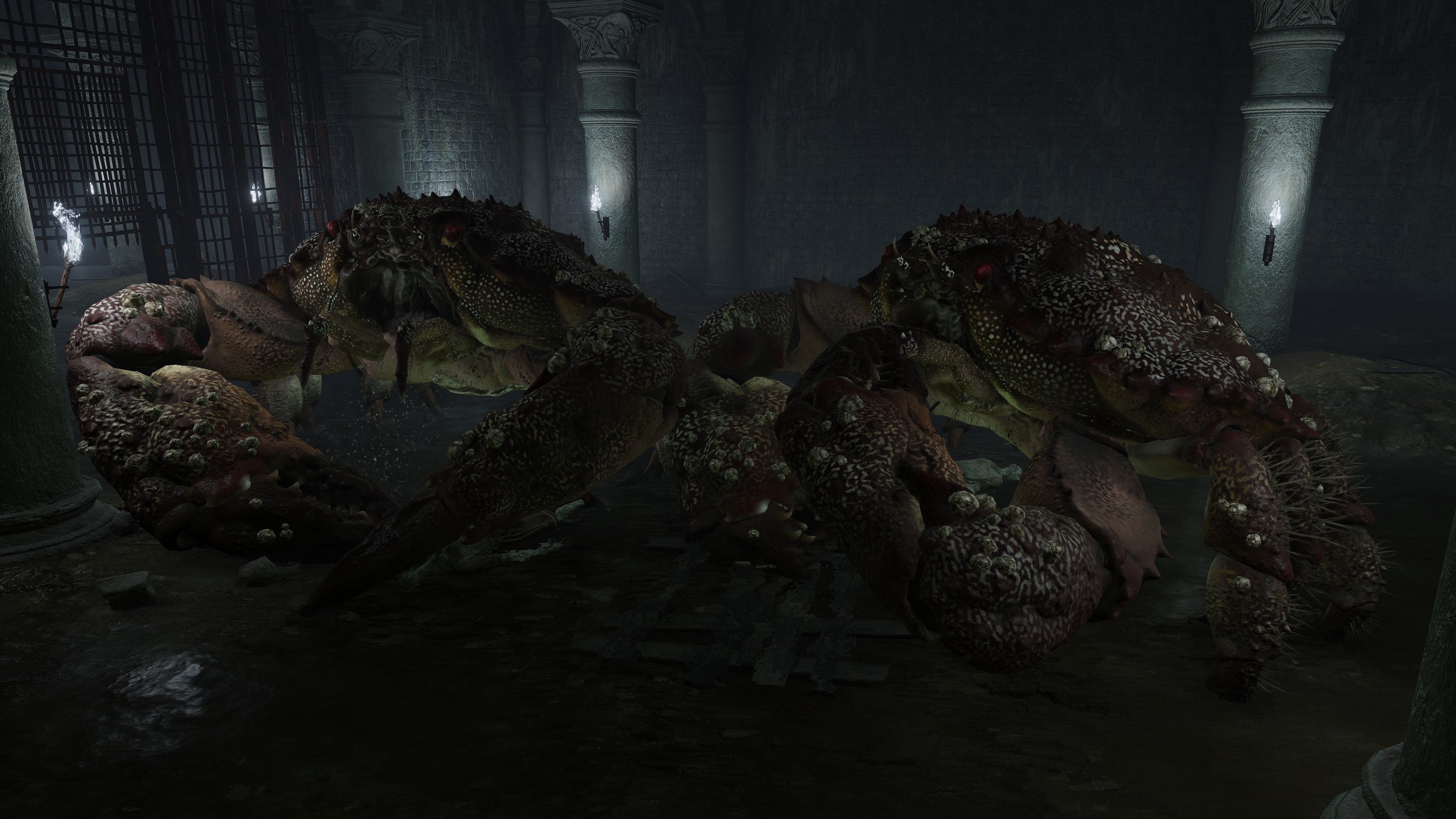 Due to the underlying cause, this curse of life only affects humans with gold gracing their eyes. However, this doesn’t mean that the curse can’t be passed on to other living beings. Although most animals out in the wild don’t exhibit signs of physical degeneration, this excludes crabs. Among the various types we encounter, one is just the standard crab with a body hollowed out by maggots, no different from the human rotten Hollows. We can presume that this is because they eat the dead’s flesh — you are what you eat, as the saying goes. Indeed, the Black Knife Catacombs have no Hollows in its flooded chamber, just countless crabs big and small feasting on the grave soil, all maggoty. Contrast to Wyndham Catacombs, where only two giant crabs dwell in its own flooded chamber, both still ordinary even as they feed from the same dirt. The major difference is that most of the dead there have yet to be scavenged, rotten Hollows and crawling carrion lingering alongside the crabs. This strongly suggests that feeding too much on the living dead results in the crustaceans inheriting the curse.